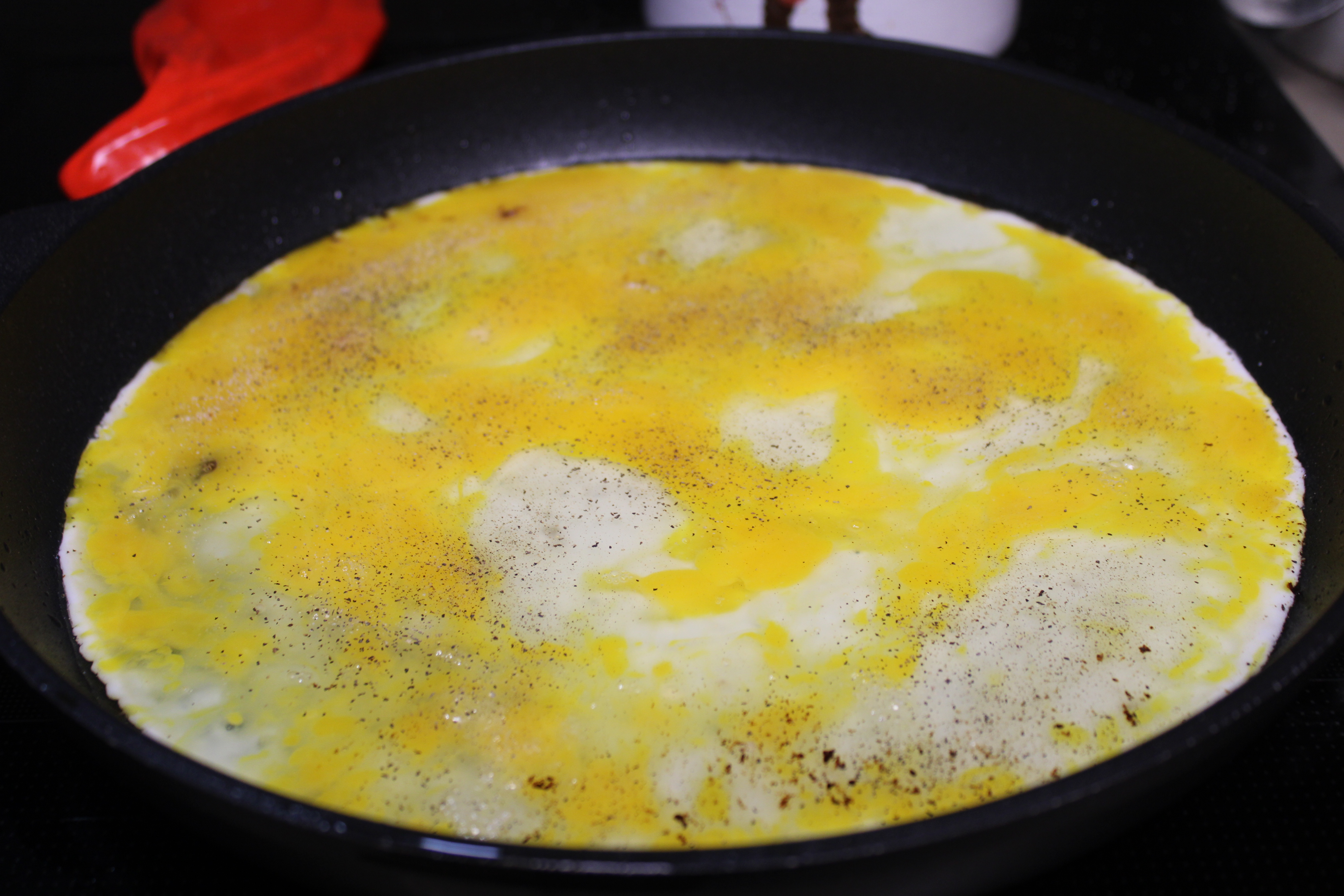 In a large bowl, whisk eggs. Season with salt and pepper. Remove all but about a tablespoon or so of the bacon drippings from the skillet. (Reserve drippings for later use).