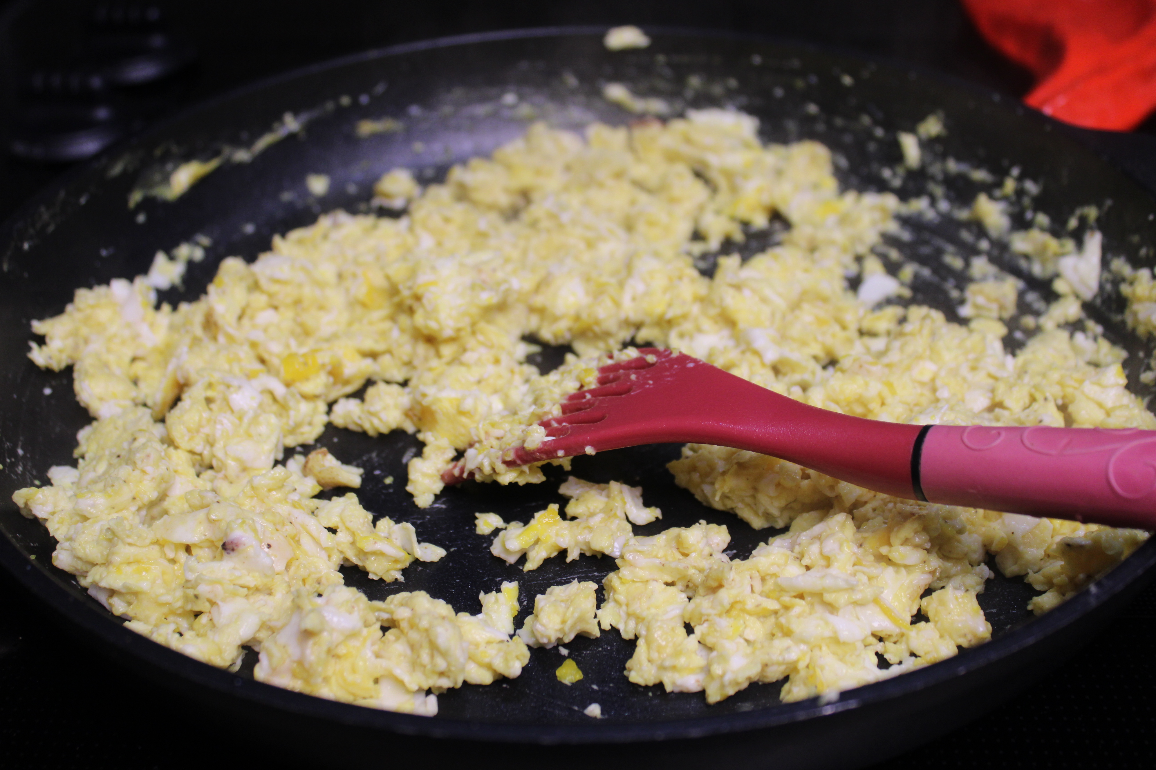 Cook eggs in the bacon drippings over low heat, scrambling once the eggs begin to set. Once the eggs are almost cooked through, remove skillet from heat. The residual heat in the pan will finish the eggs without drying them out.