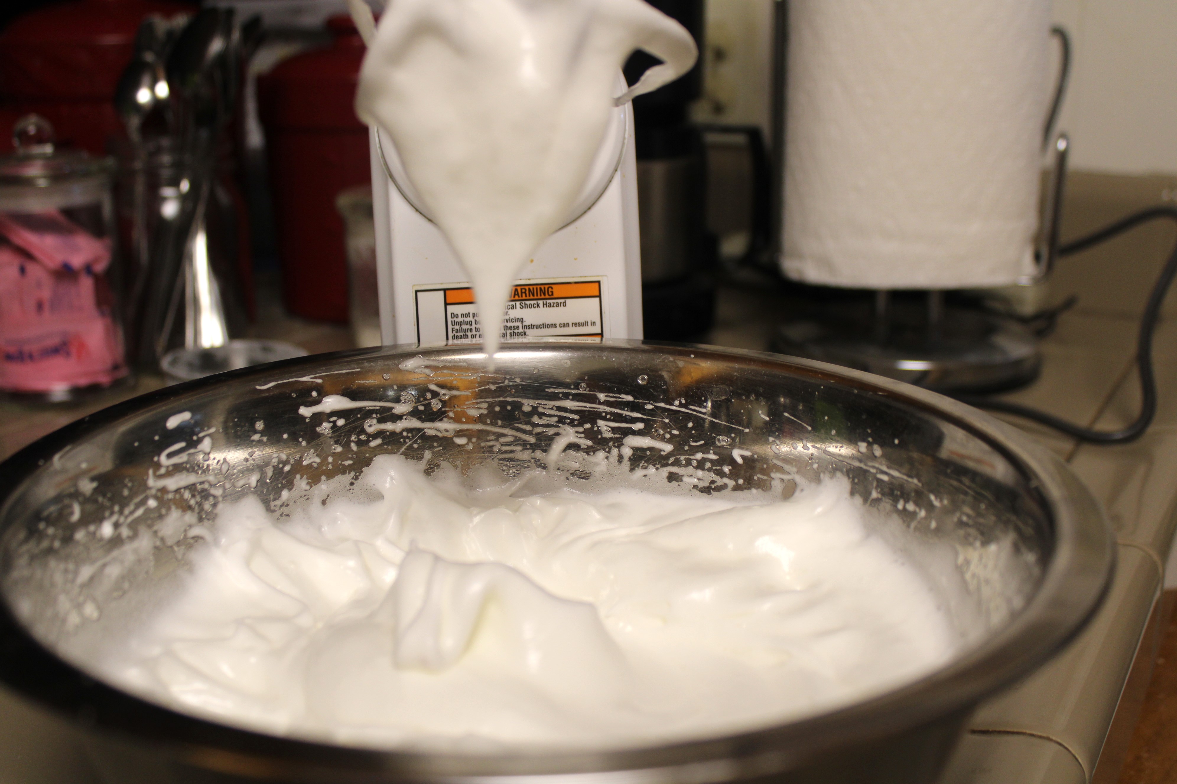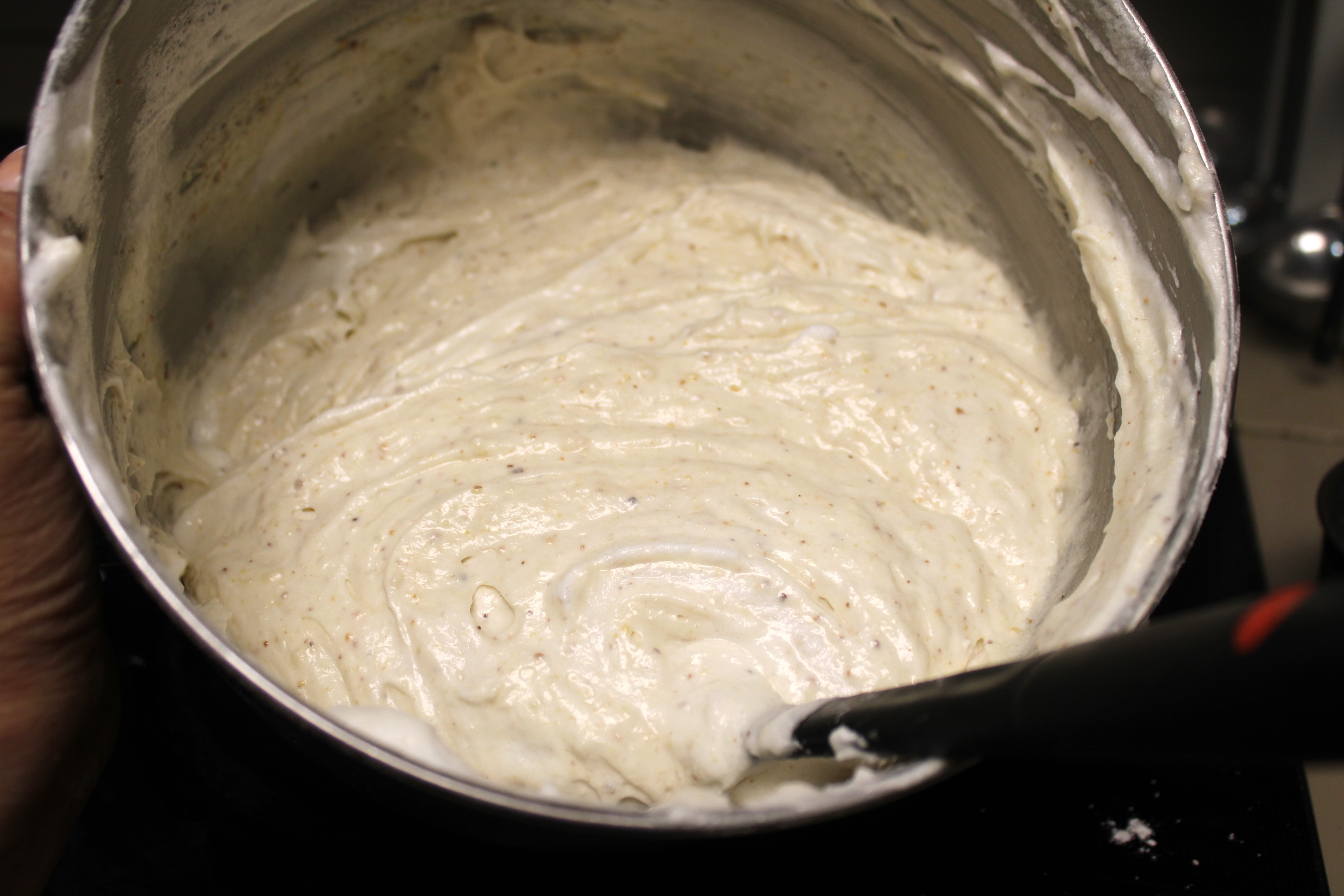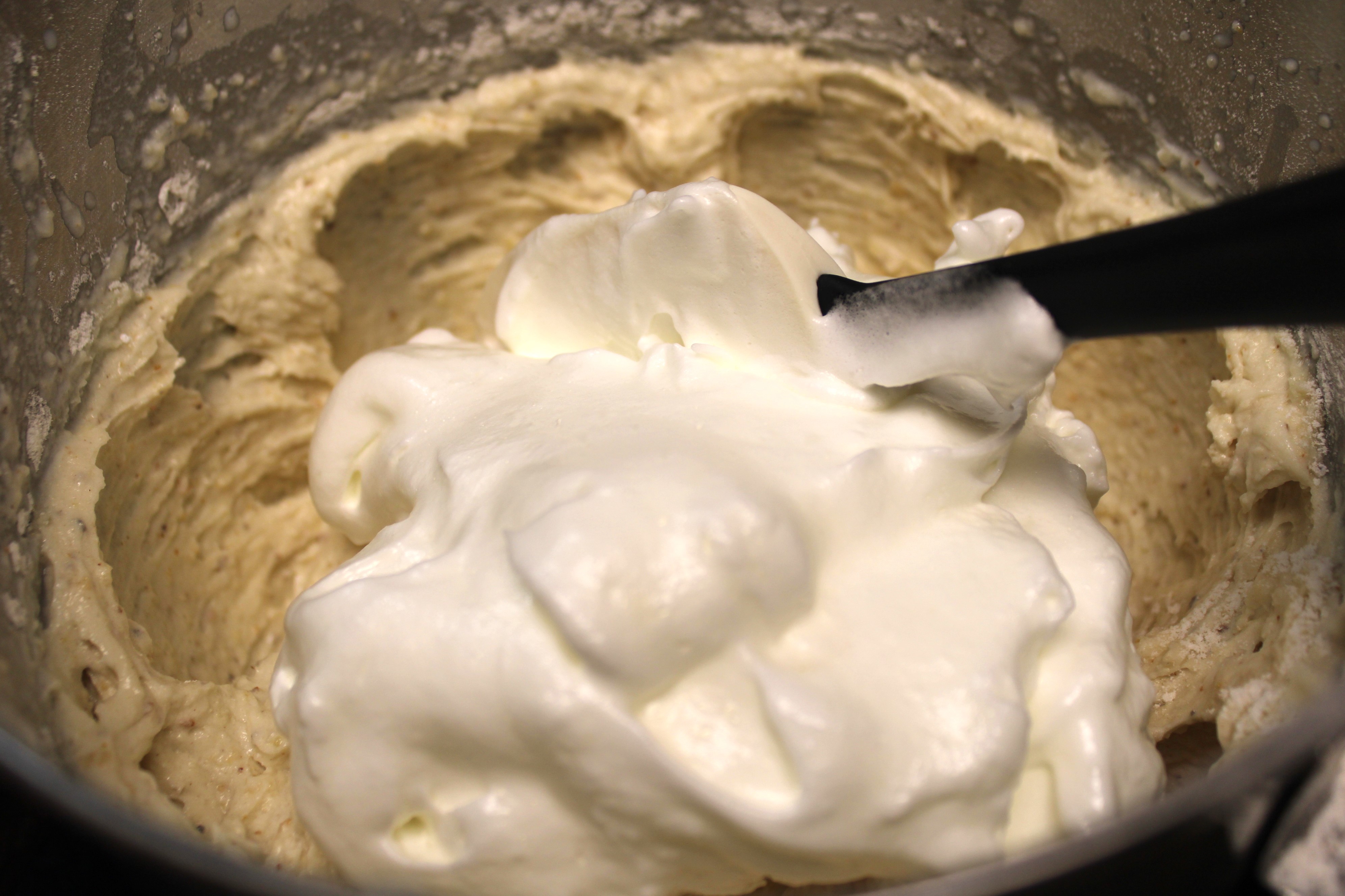 With an electric mixer fitted with clean dry beaters, whip egg whites to medium peaks. Gradually add the remaining 1/3 cup sugar; beat until sugared whites are stiff but not dry. Fold the meringue into the batter in 2 additions. Spoon half of the batter into the prepared Bundt Pan.