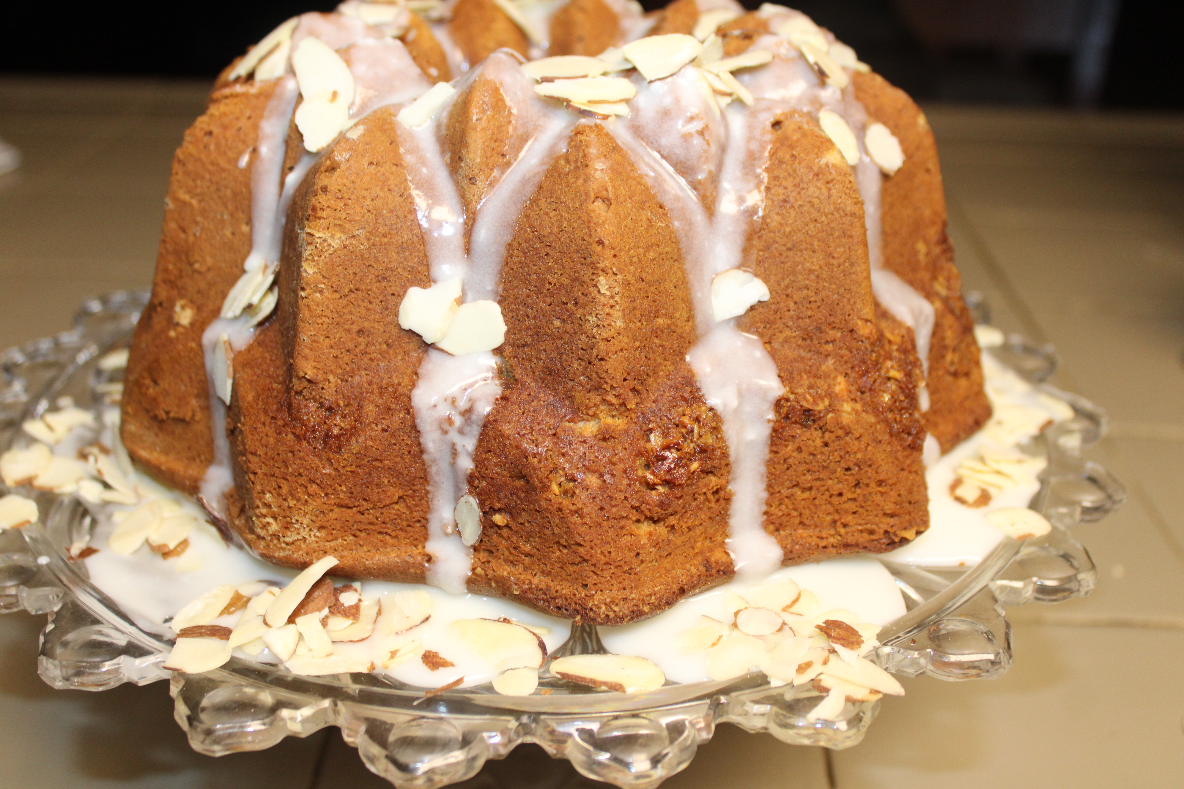 Drizzle glaze over the cake, allowing excess to run down the sides. Sprinkle top with sliced almonds. Sereve and enjoy.