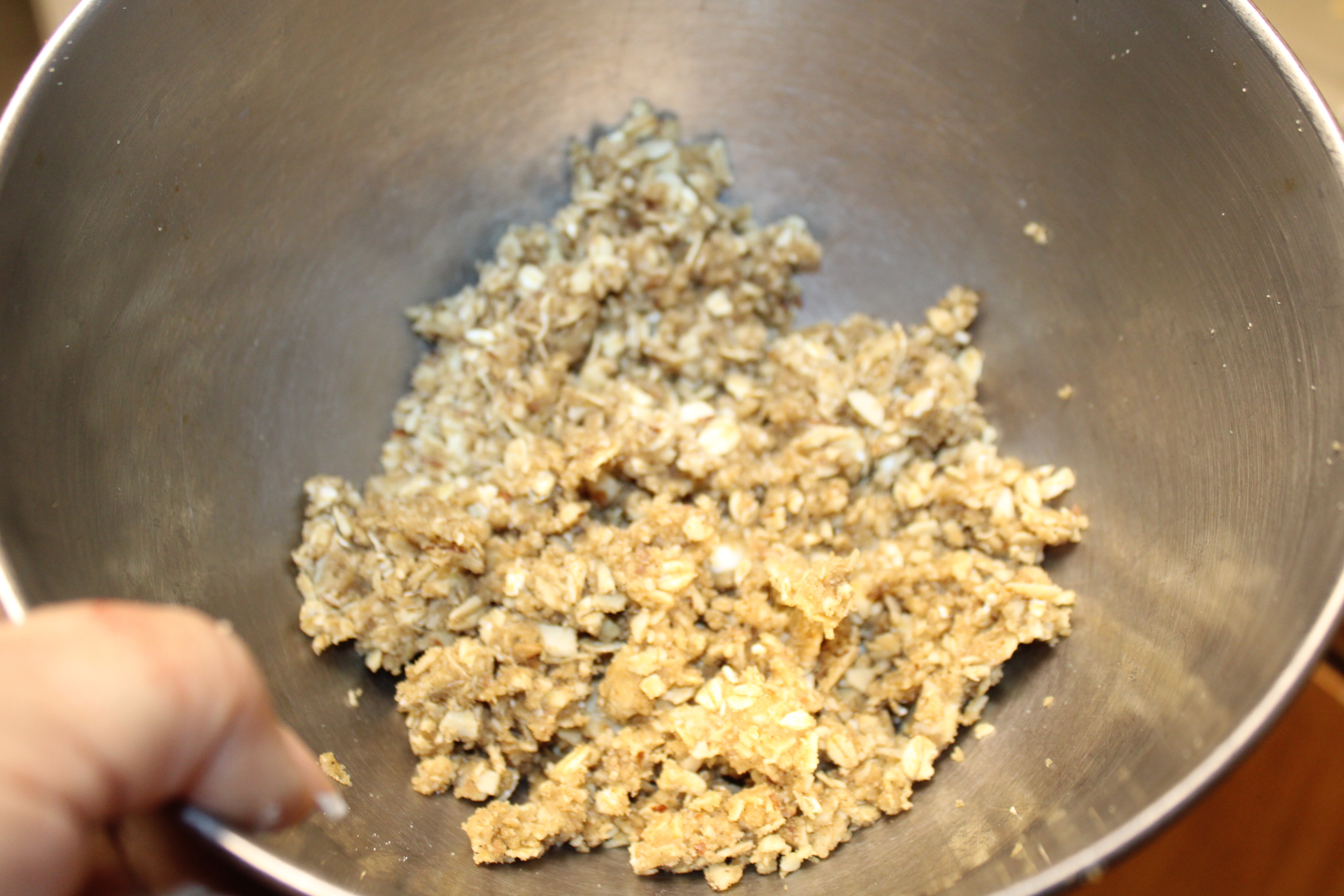 Firmly pack brown sugar, place in a mixing bowl. Stir in almonds, oaks, espresso powder and cinnamon. Add chilled butter pieces to the brown sugar mixture, rub in with fingertips until well blended. Set streusel aside until ready to use.