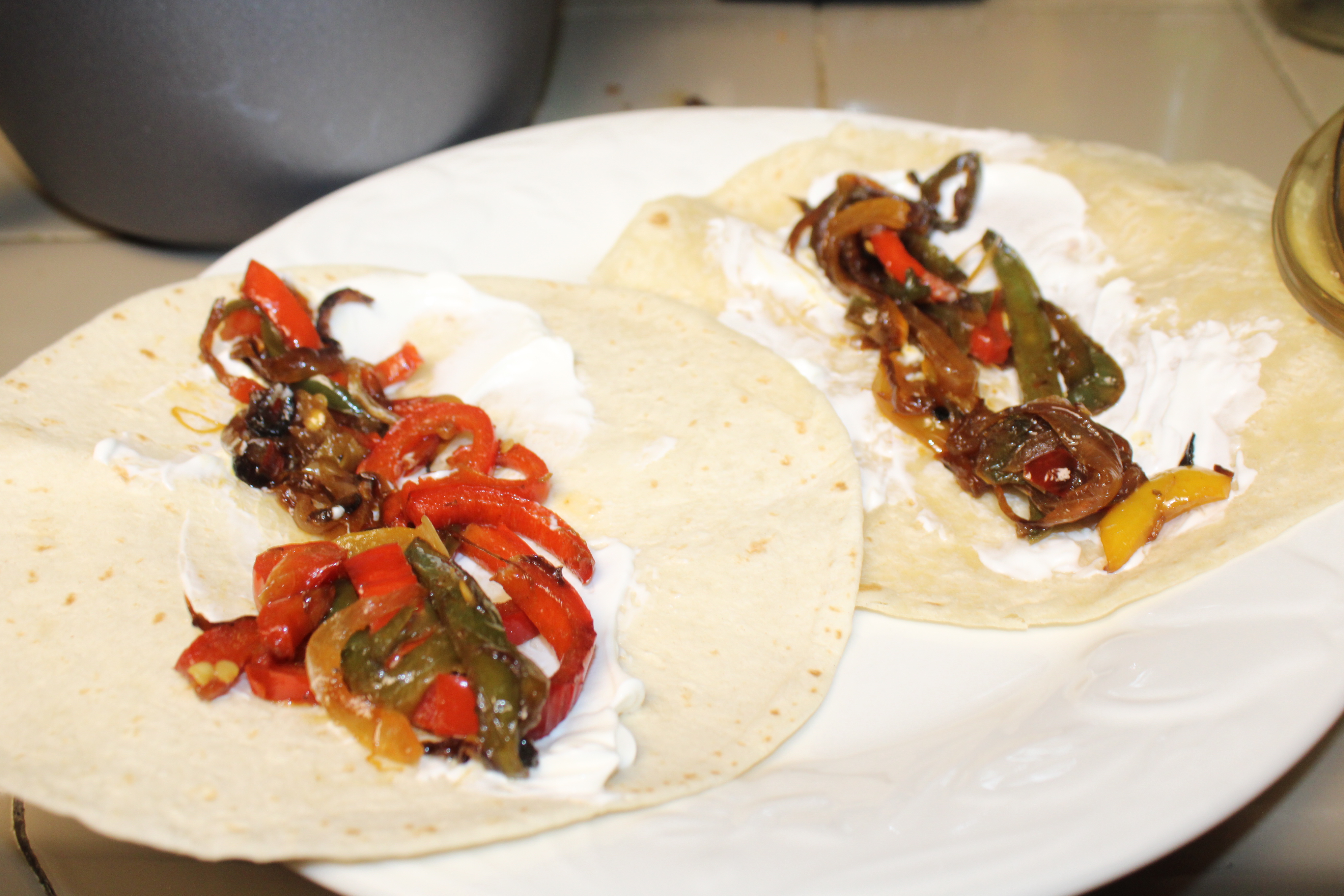Peel onions, cut in half. Cut each half into long slivers. Stem, core and slice bells peppers. Stem jalapeño and slice into strips.