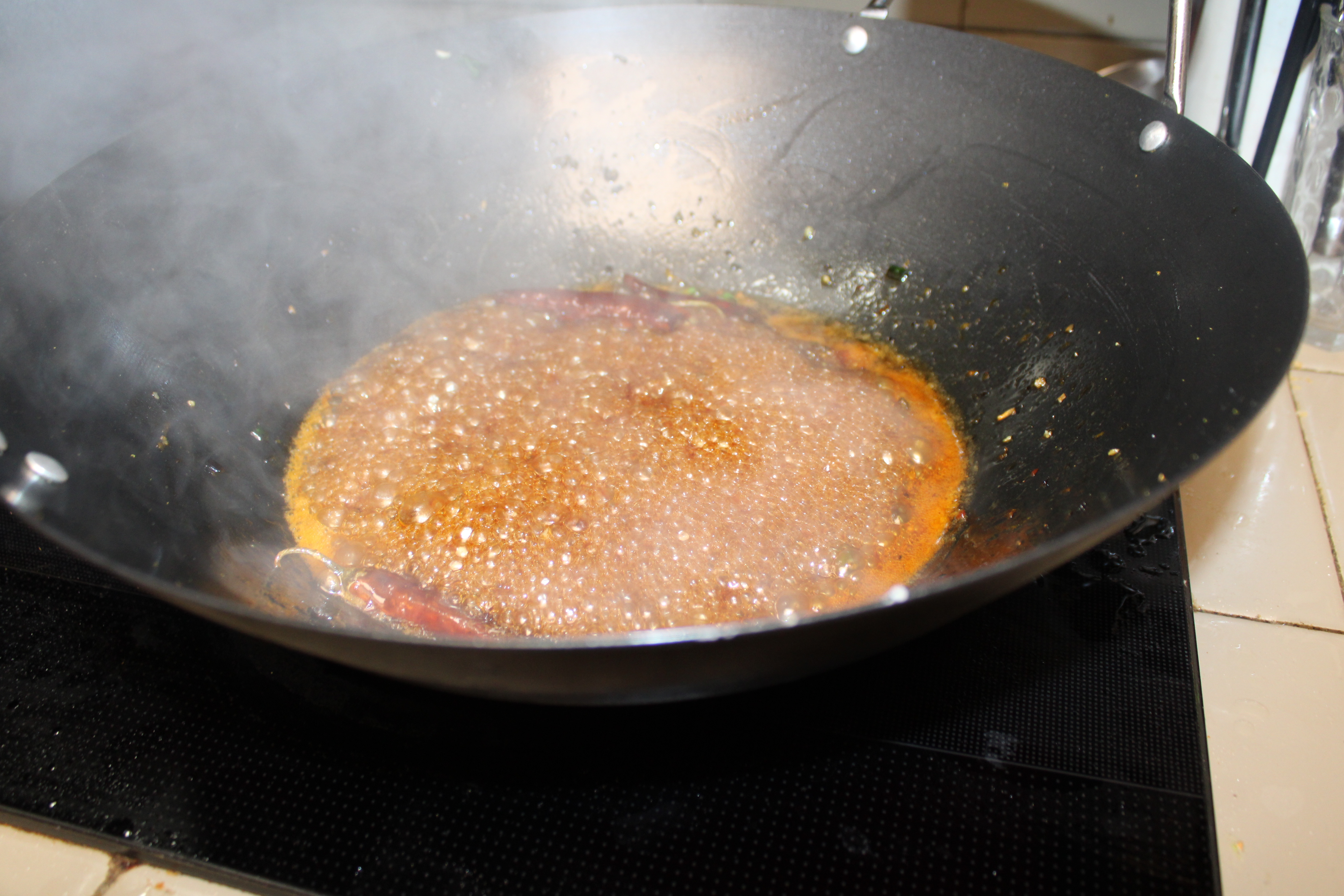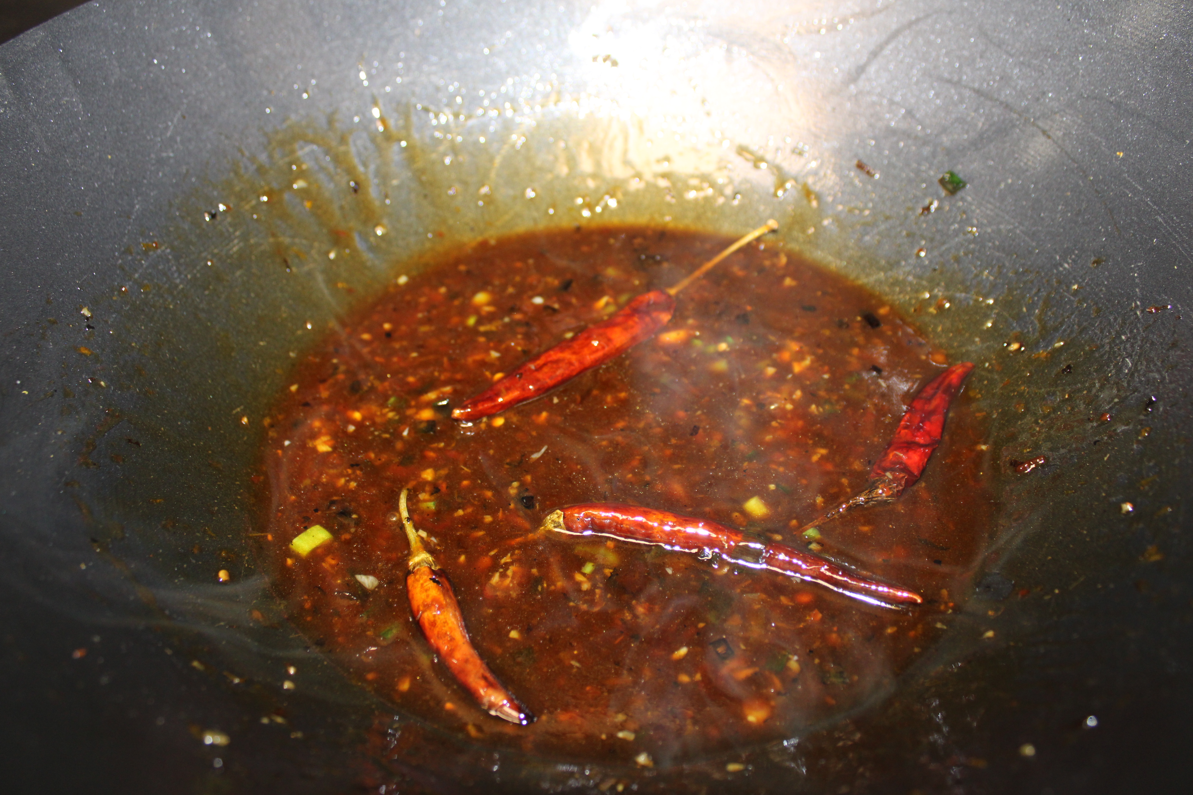 Heat vegetable oil in a wok or large skillet over high heat. Stir in green onions, garlic, whole dried chilies and orange zest. Cook, stirring constantly, until the garlic becomes golden and the chilies brighten, about a minute or so.
