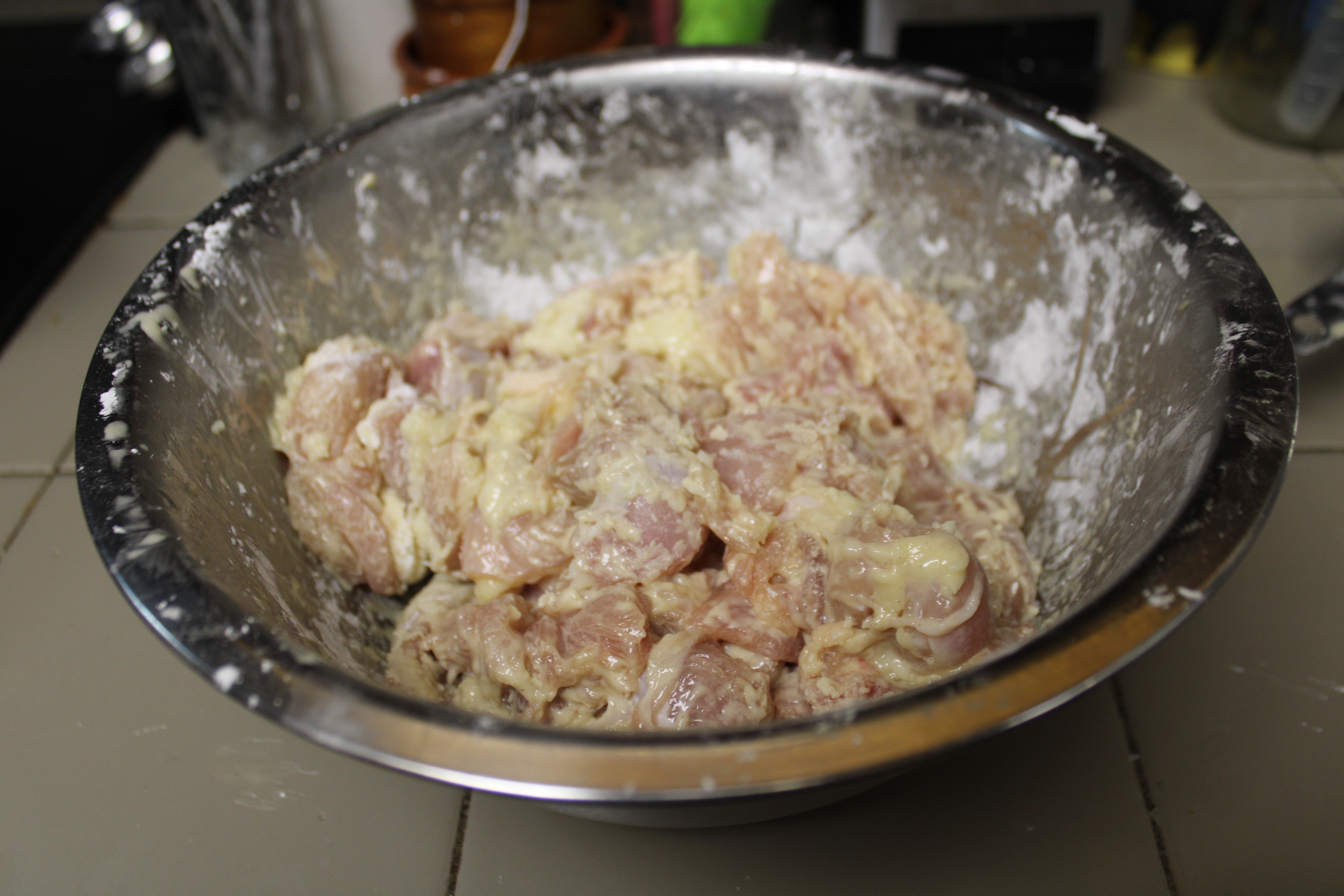 Whisk egg in a large mixing bowl. Cut chicken into 1-1/2 inch pieces, add to the whisked egg. Season with salt, sugar and pepper. Sprinkle with cornstarch, a little at a time, until chicken pieces is well coated.
