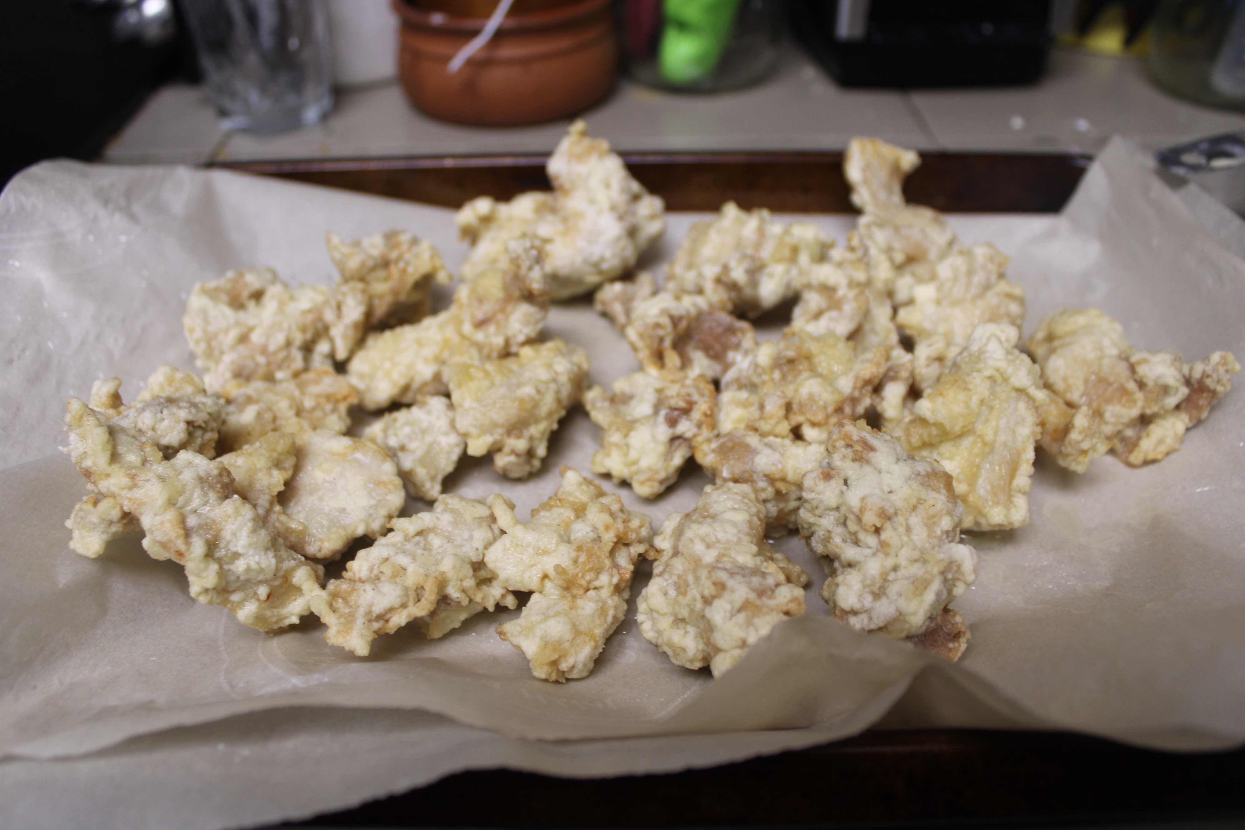 Working in batches, carefully drop one piece of chicken at a time into the hot oil. Fry until chicken turns golden brown and begins to float in the oil, about 3 minutes. Remove chicken with a slotted spoon, place on a baking sheet lined with parchment paper and allow to cool as the next batch is fried.