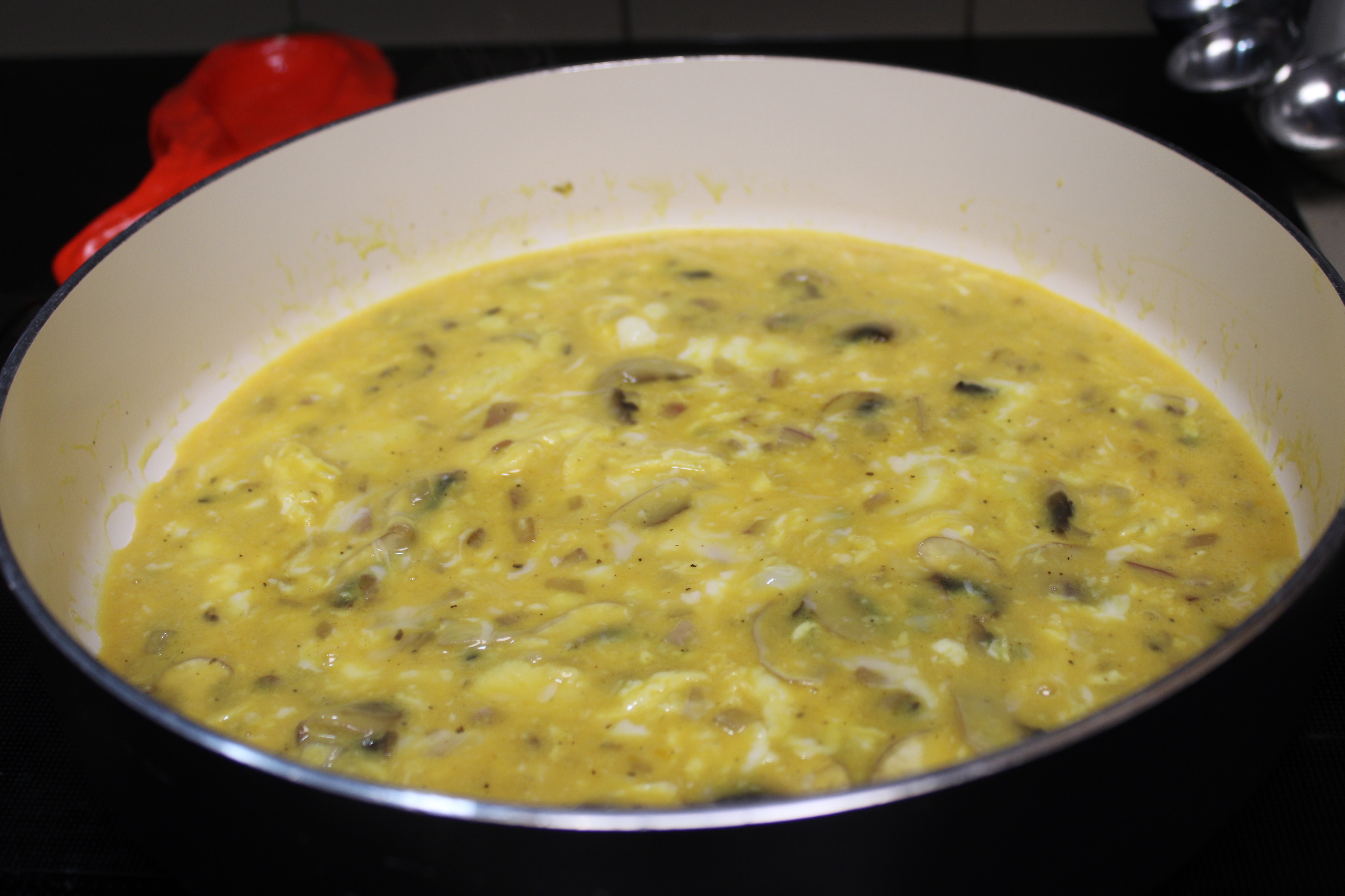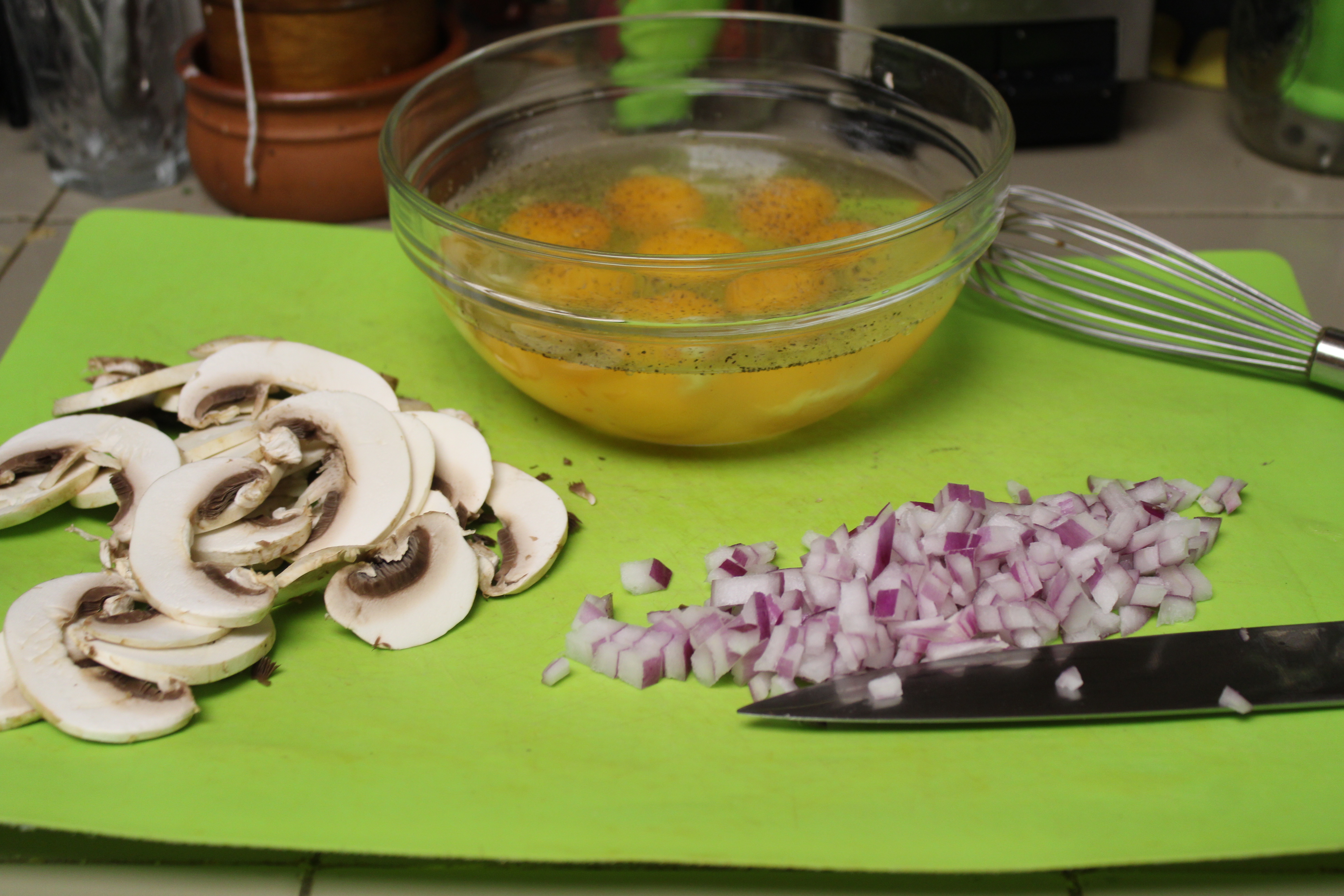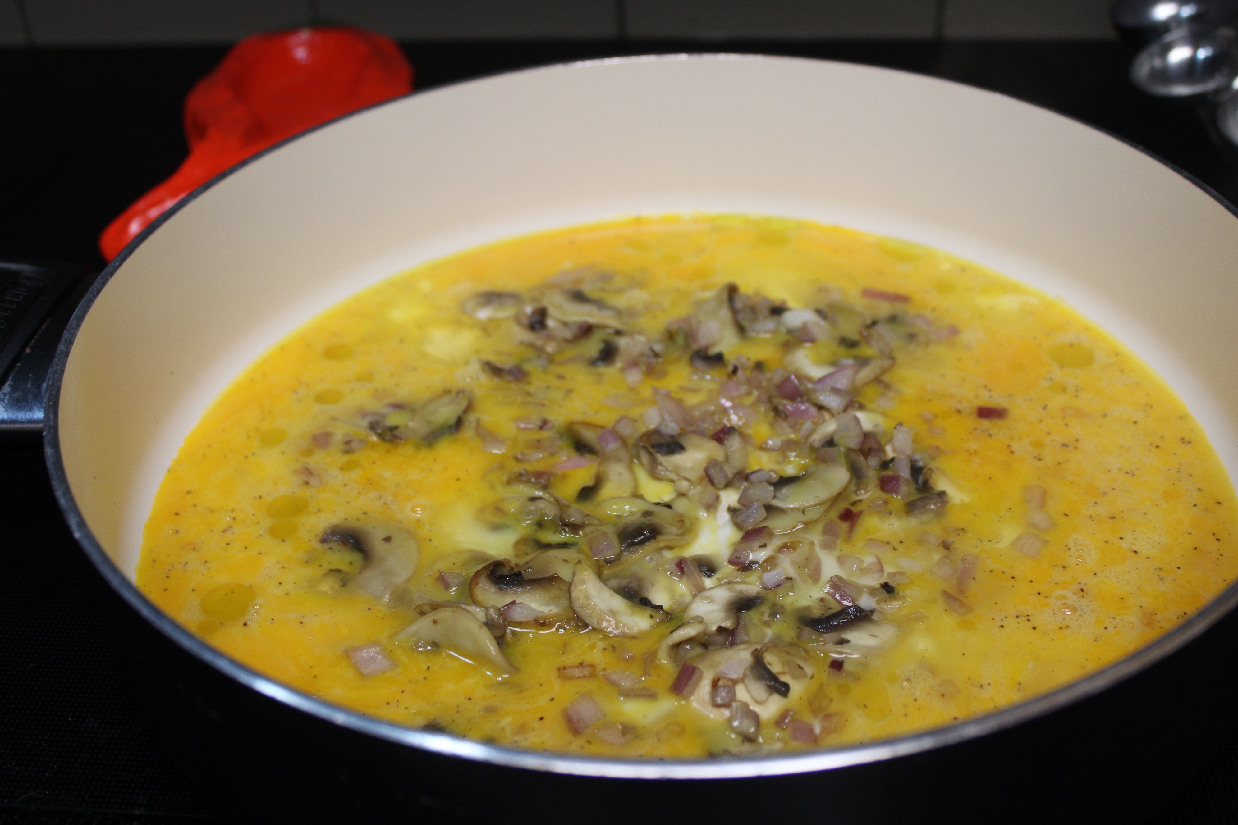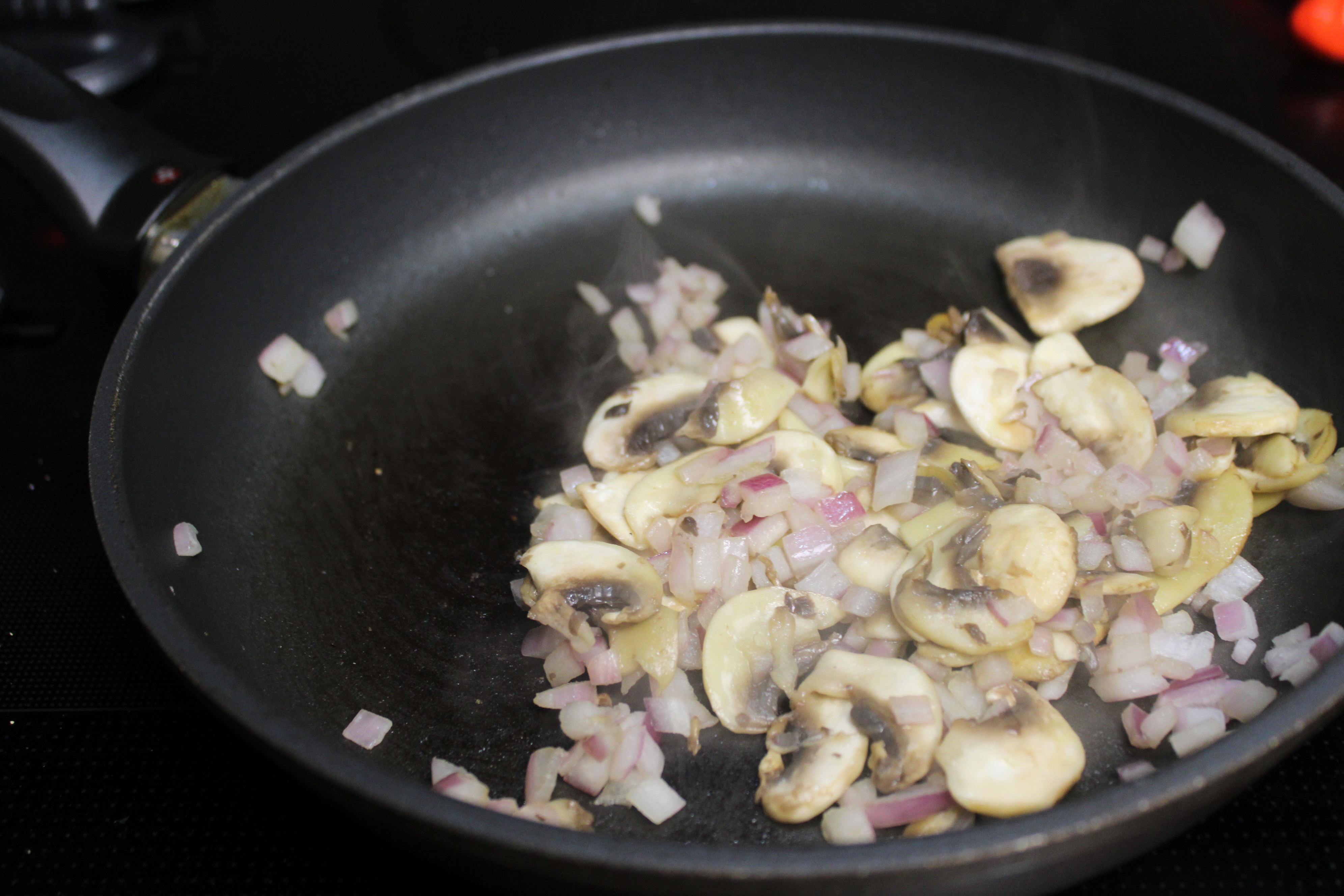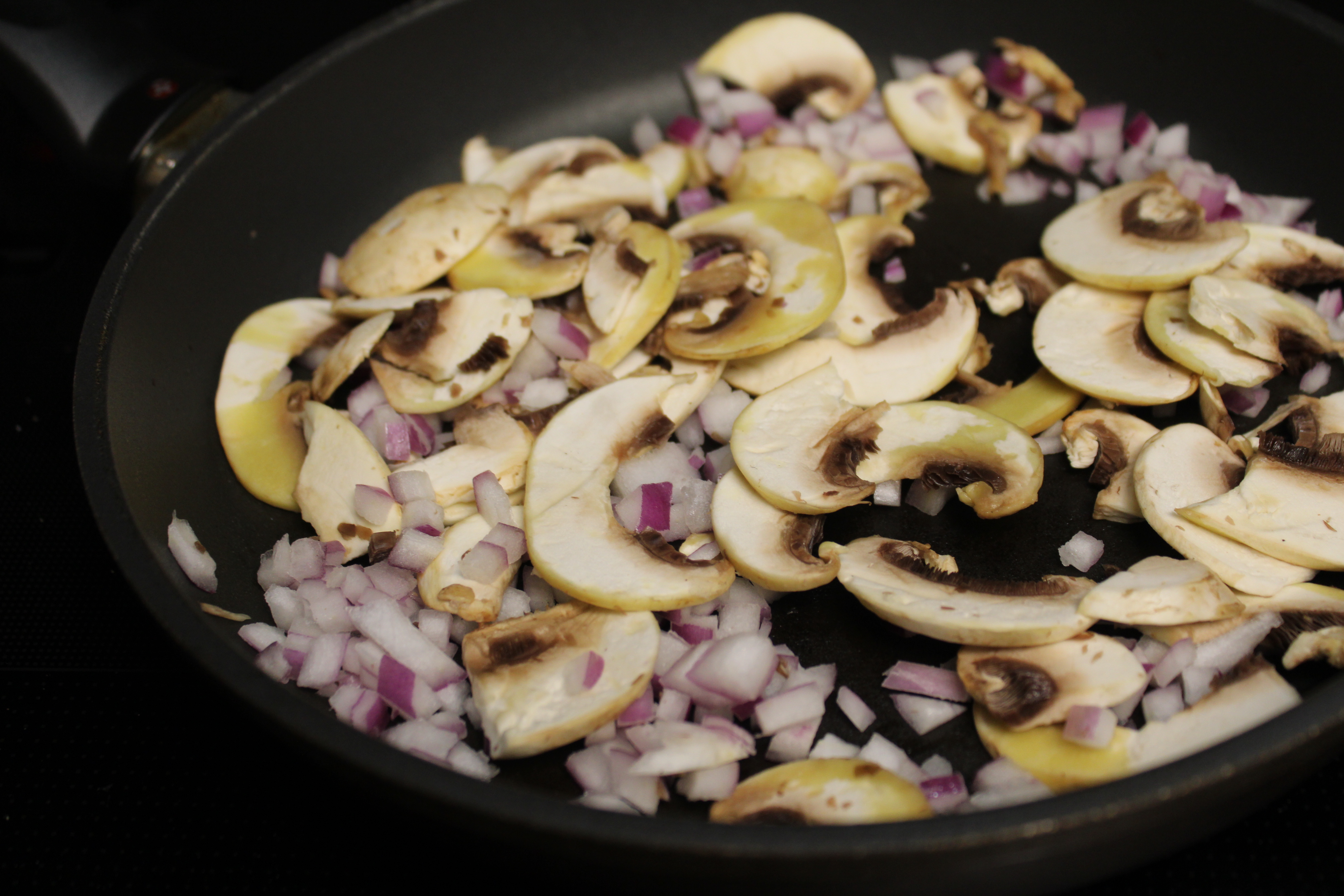 In another small pan, warm oil. Once the oil is warm sauté mushrooms for about 5 minutes to release their liquids. Add onions, let brown slightly. Remove skillet from heat.