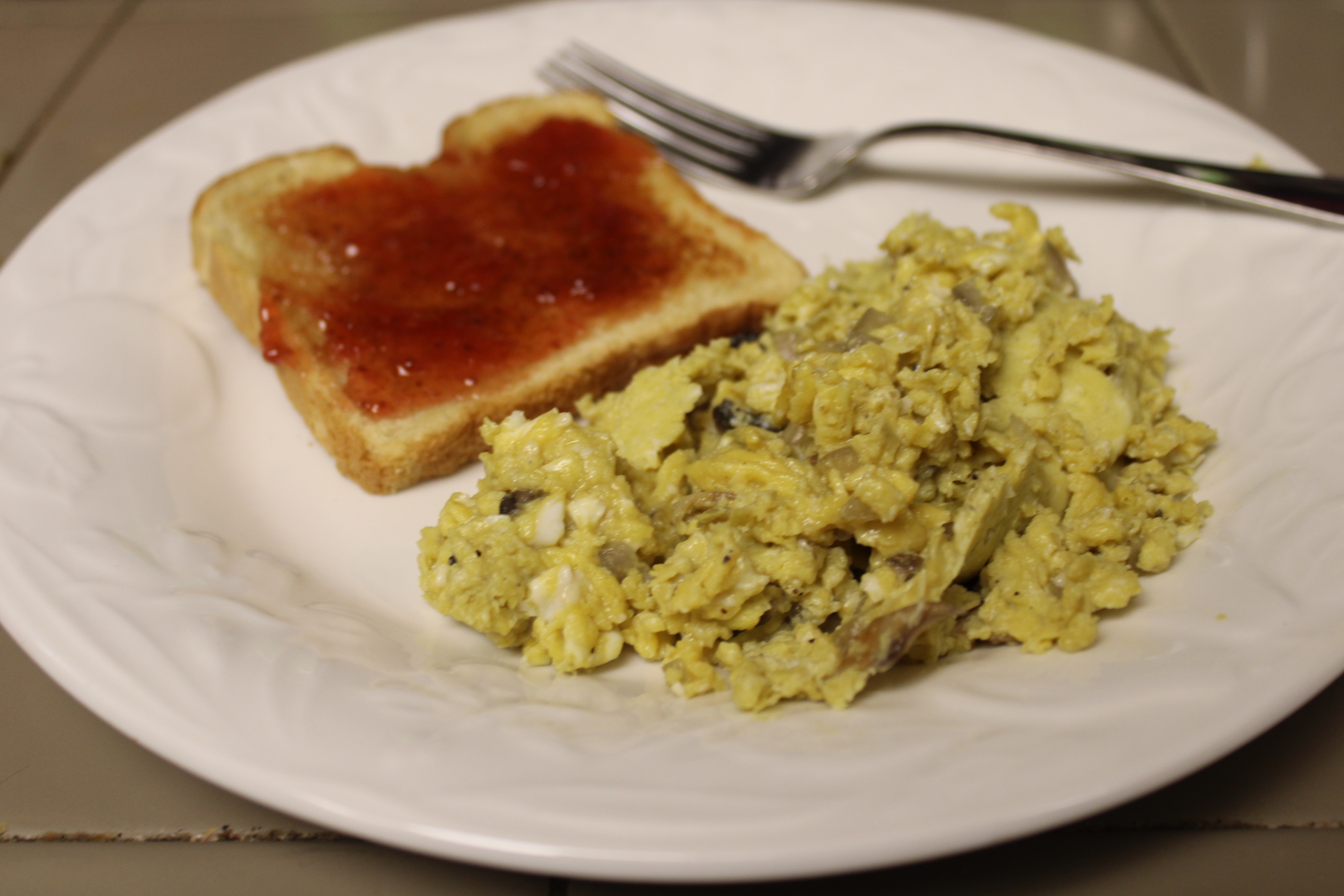 Scatter sautéd mushrooms and onions over the eggs. Return skillet to low heat, let eggs set about a minute or so longer. Scramble until light and fluffy. Serve with toast and jam for a satisfying scramble breakfast or light lunch.