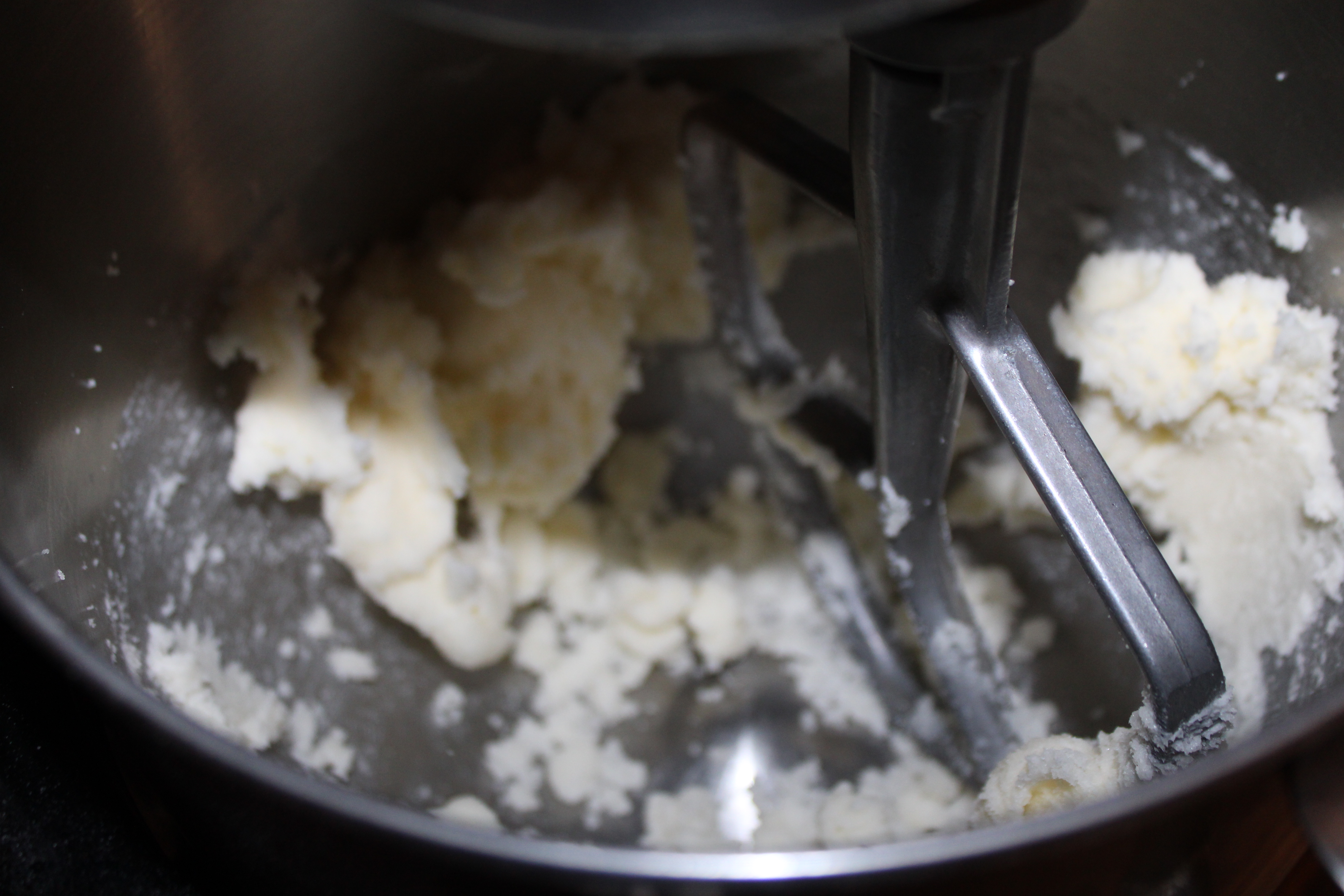 In the bowl of a stand mixter beat butter and sugar until light and fluffy. Add eggs, one at a time, beat until smooth. Add milk, stir briefly. Add the flour mixture all and once and beat until just blended. Finish with the addition of the vanilla.