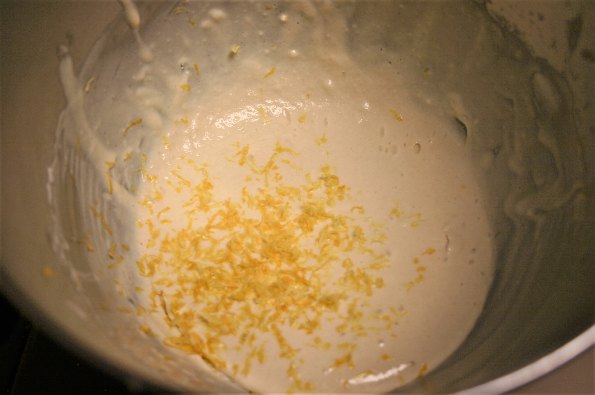 Beat pancake mix, milk, egg and sugar in the bowl of a stand mixer until just blended. Zest lemon into the batter. Fold in. Let batter rest 15 minutes.