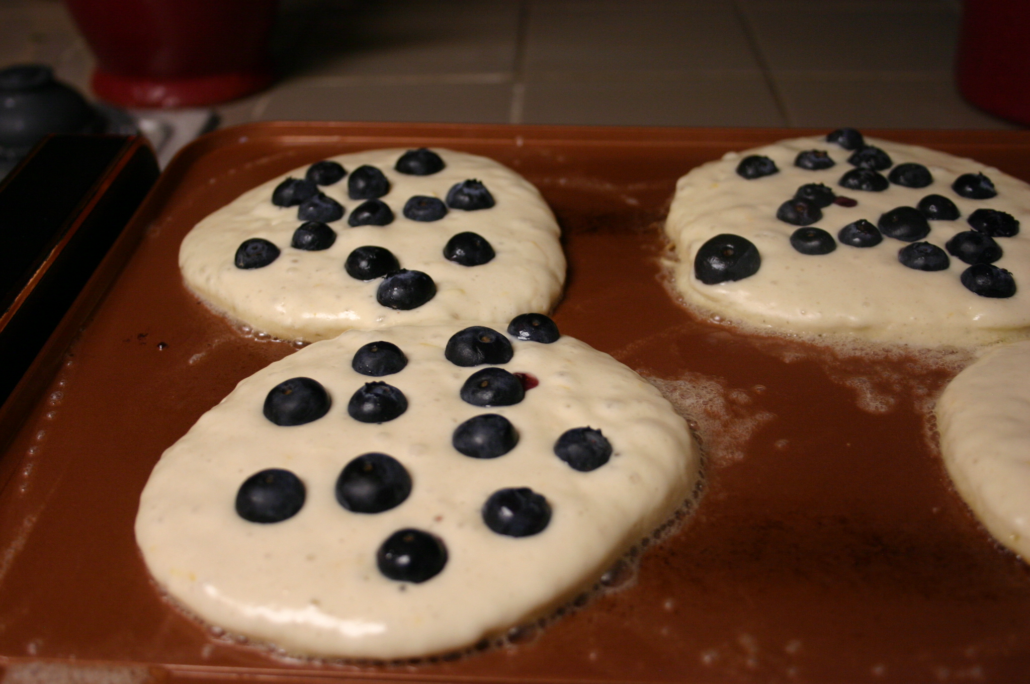 Ladle pancakes onto the griddle. Working quickly, top each pancake with a handful of blueberries. Cook about 2 or 3 minutes. Flip pancakes, increase heat to medium and cook another minute or so.