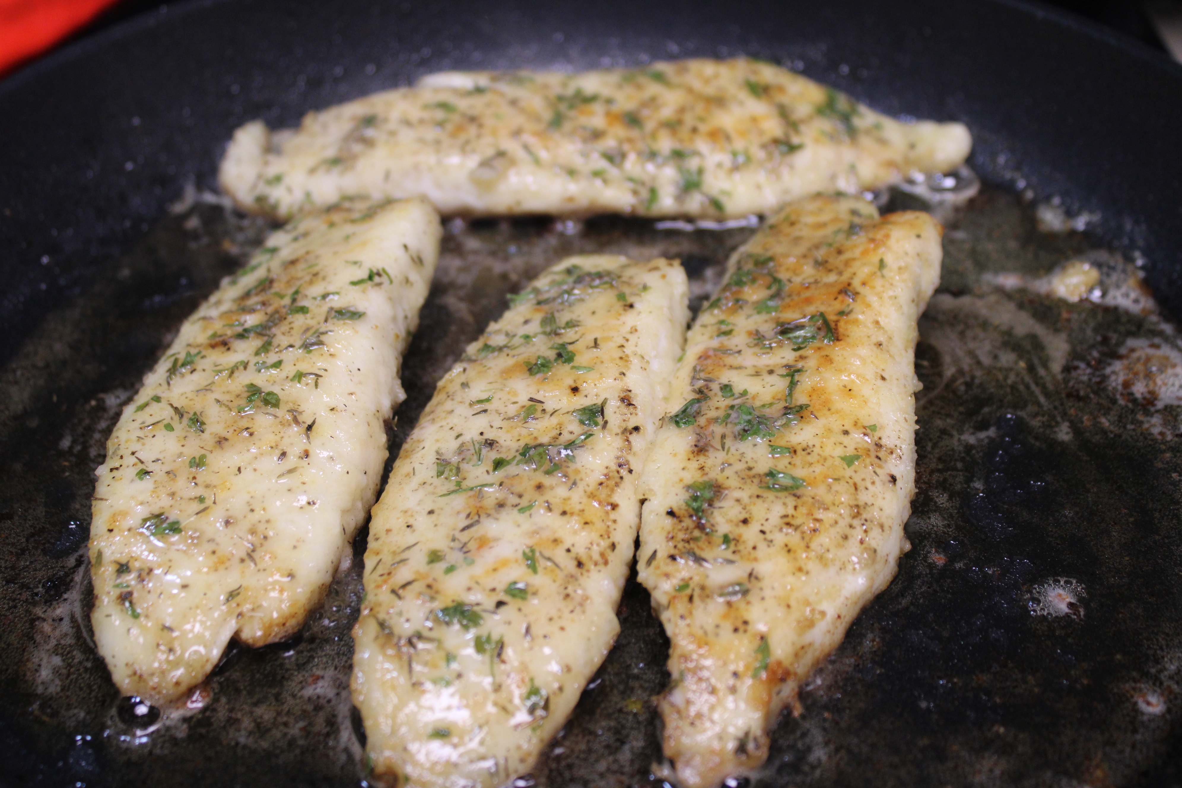 Brush fillet with melted butter during the last minutes or so before removing fish from the skillet. Cut lemon in half, drizzle fillets with fresh juice. Garnish with parsley flakes and thyme just before serving.