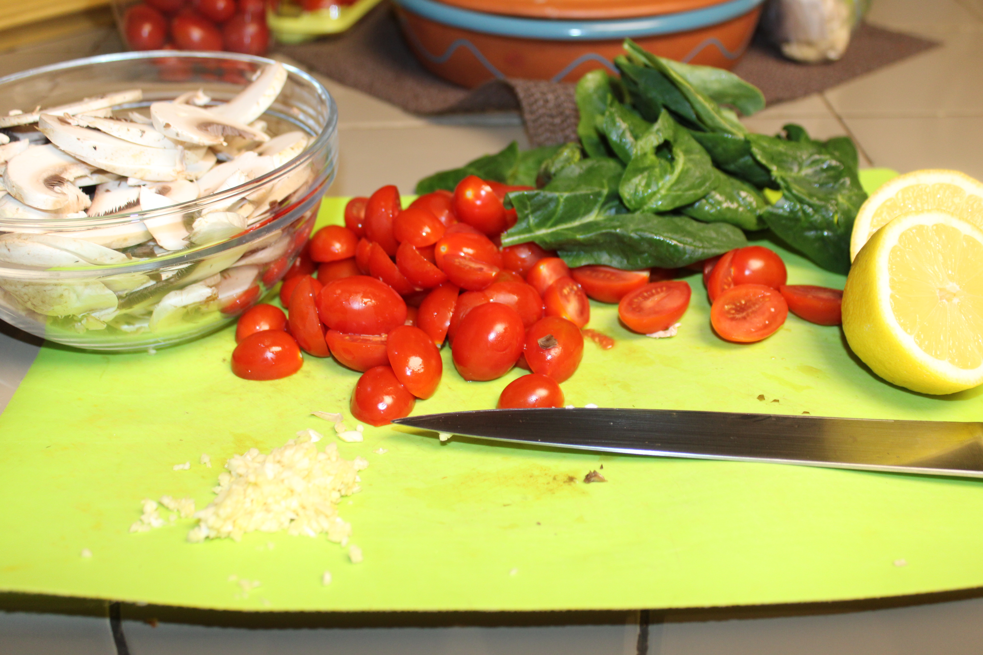 Clean, stem and slice the mushrooms. Cut tomatoes in half. Peel and mince garlic. Cut lemon in half. Set aside.