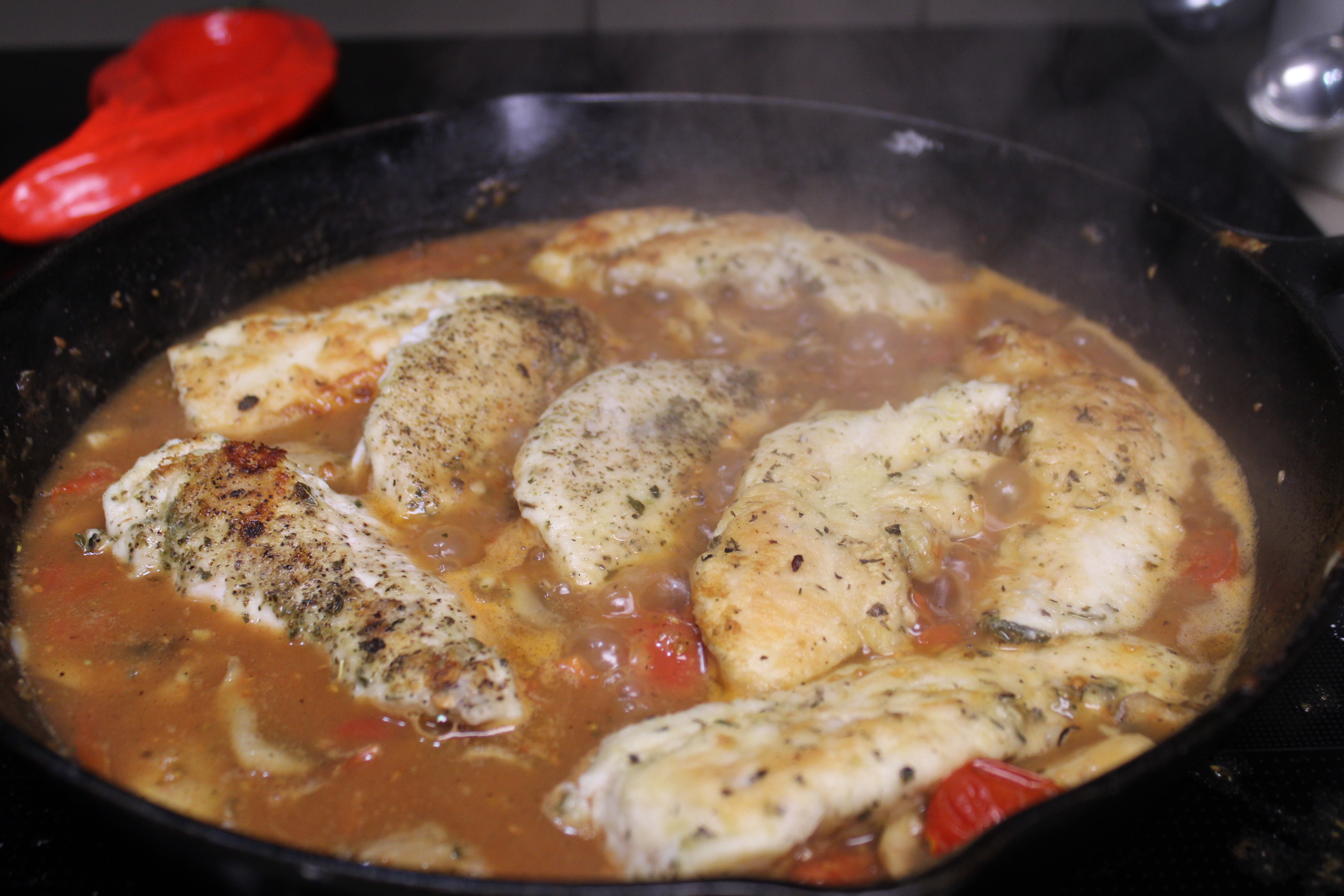 Heat 2 tablespoon olive oi in a large cast iron skillet. Brown the chicken about 3 minutes per side. Transfer browned chicken to a plate, tent to keep warm.