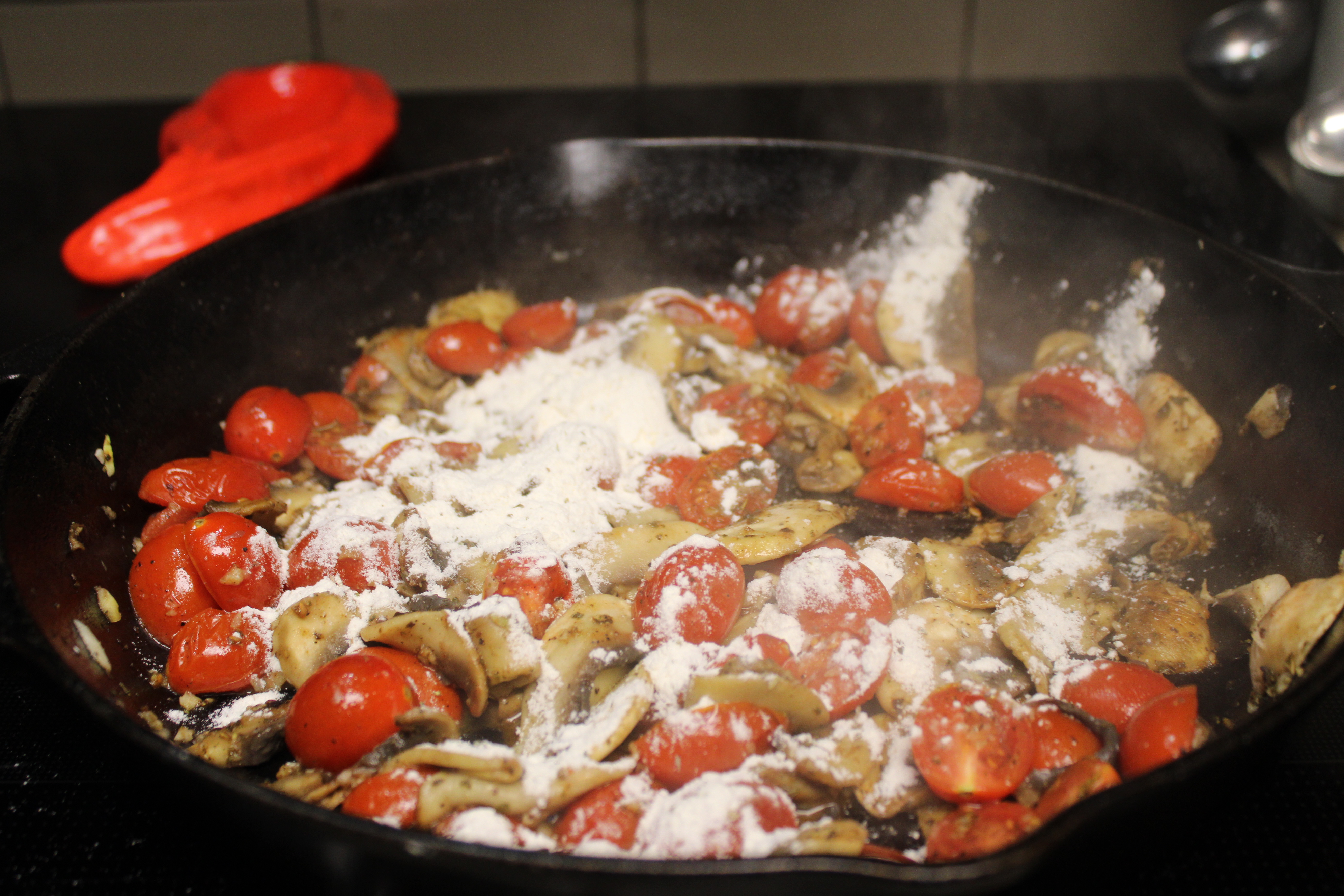 In the same skillet, add more olive oil if needed to lightly coat bottom. Add sliced mushrooms, sauté briefly over medium-high heat for about a minute or so. Add the tomato halves, minced garlic and remaining oregano, salt and pepper. Scatter about 2 tablespoons of flour over the mixture. Let cook, stirring constantly, for about 3 minutes to cook off the raw flour taste.