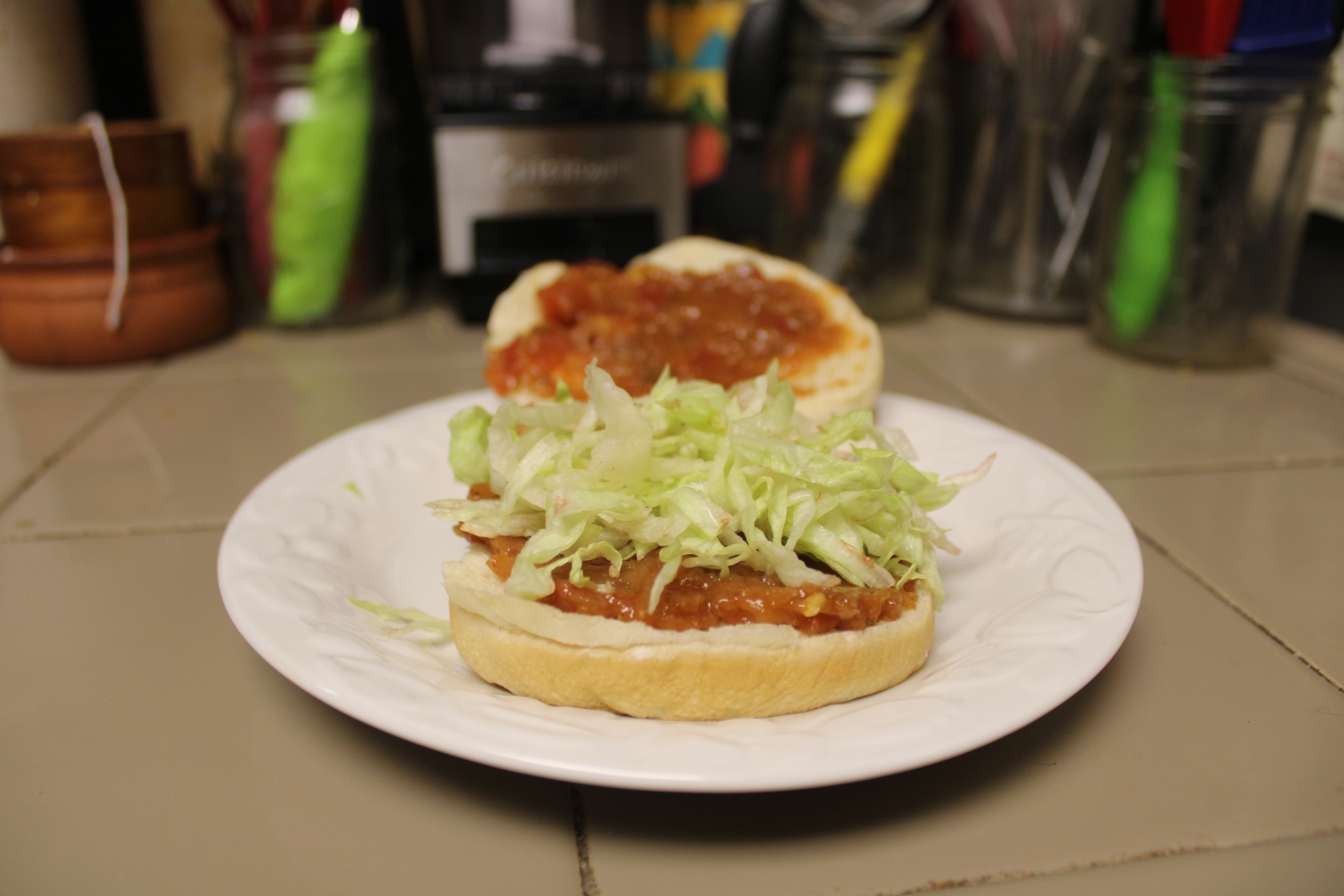 Spread Onion-Tomato Relish over the top and bottom buns. Stack lettuce, chiffonade to create shredded ribbons of lettuce. Scatter lettuce over the bottom buns. Set aside.