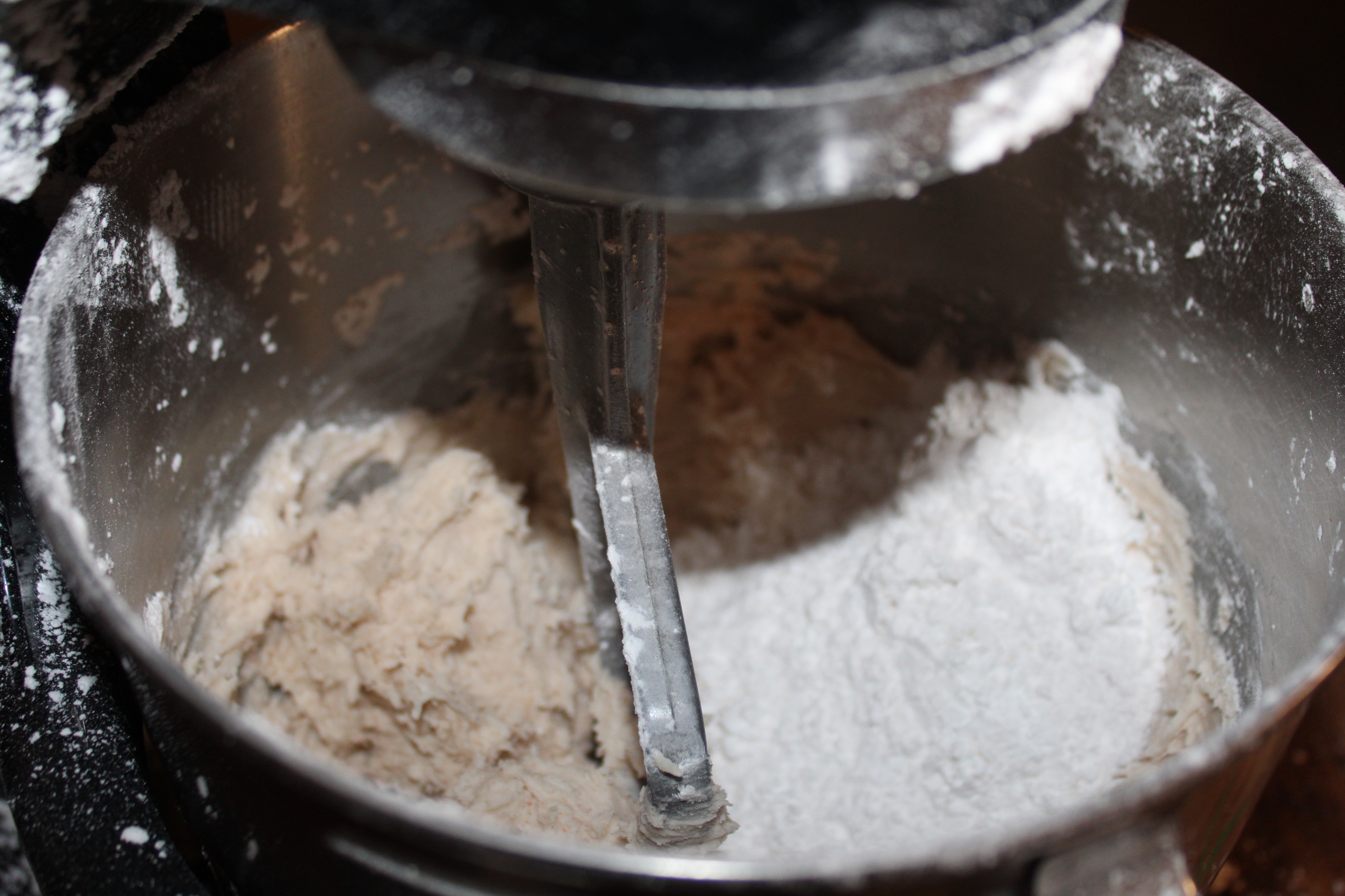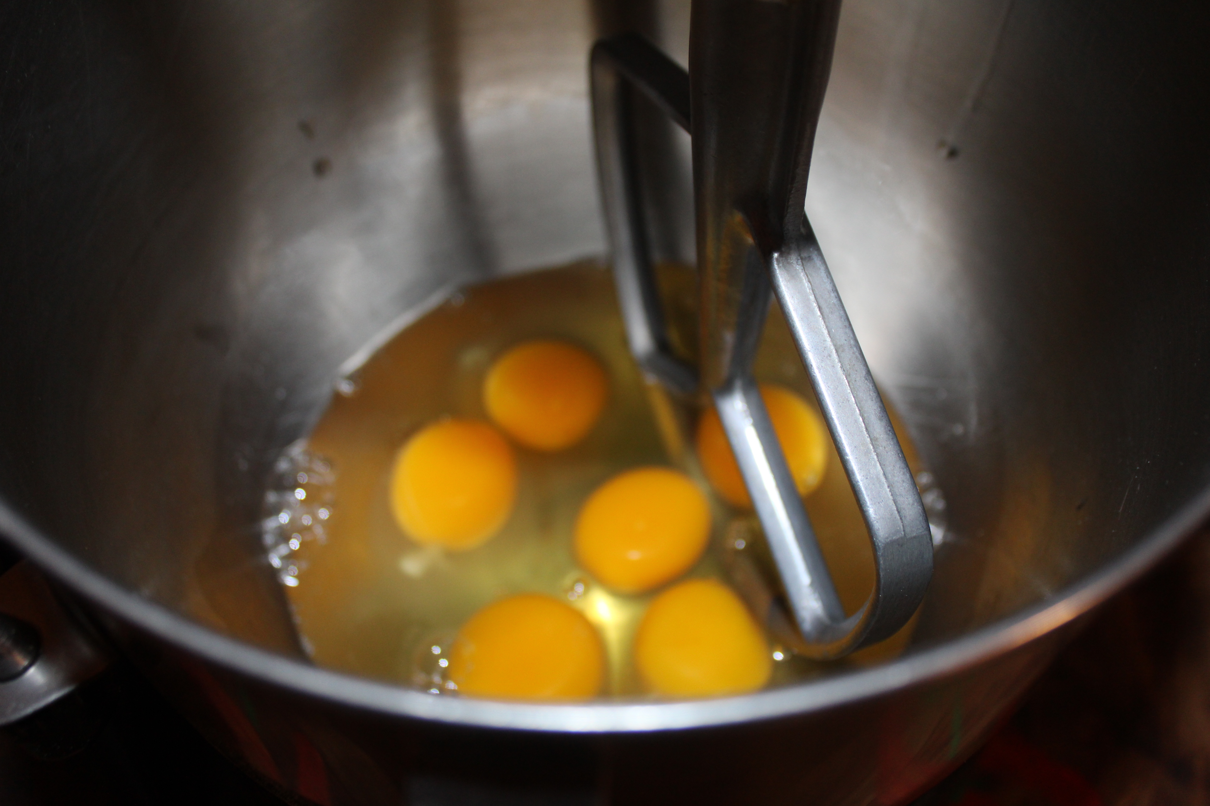 In the bowl of a stand mixer fitted with a paddle stir together the eggs, milk, water, butter, and oil until well incorporated.
