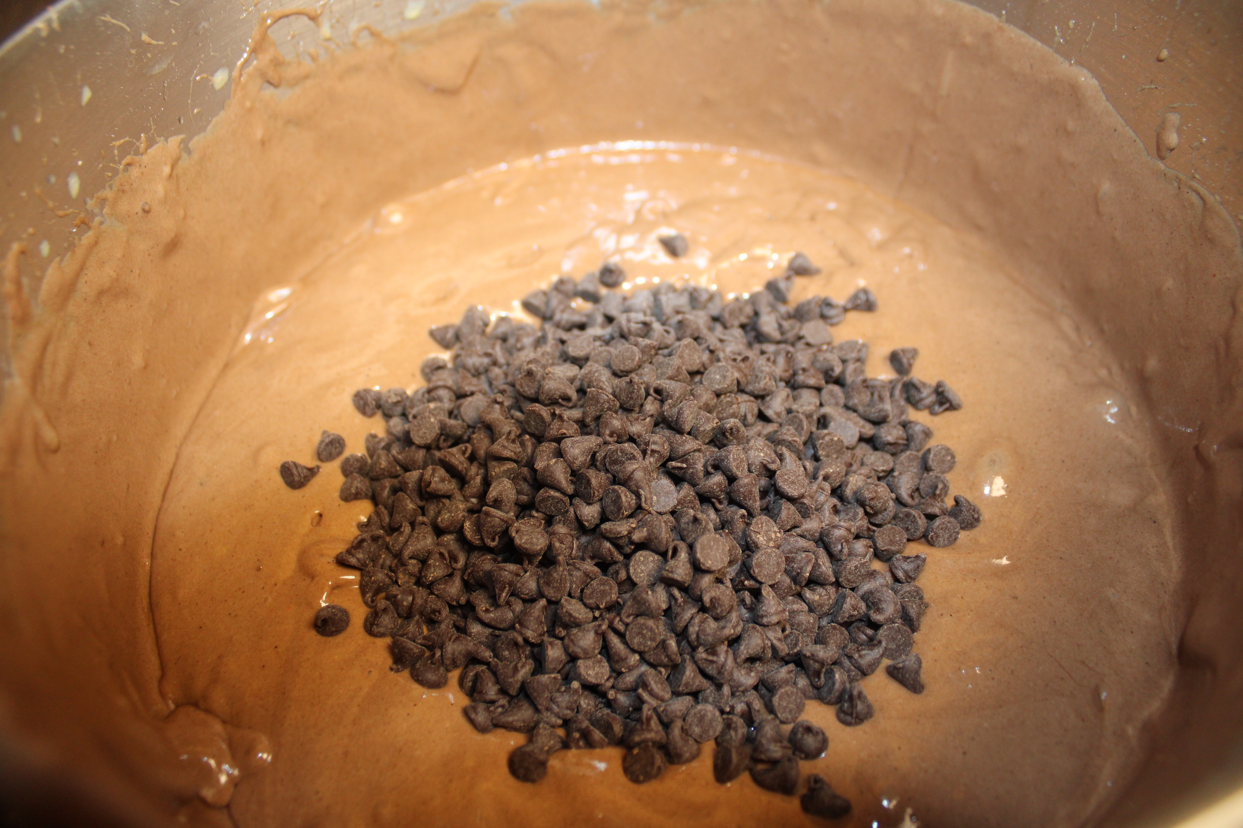 Fold in the chocolate chips. Spread cake batter out evenly in the prepared pan. Tap on the counter to release any trapped air bubbles.