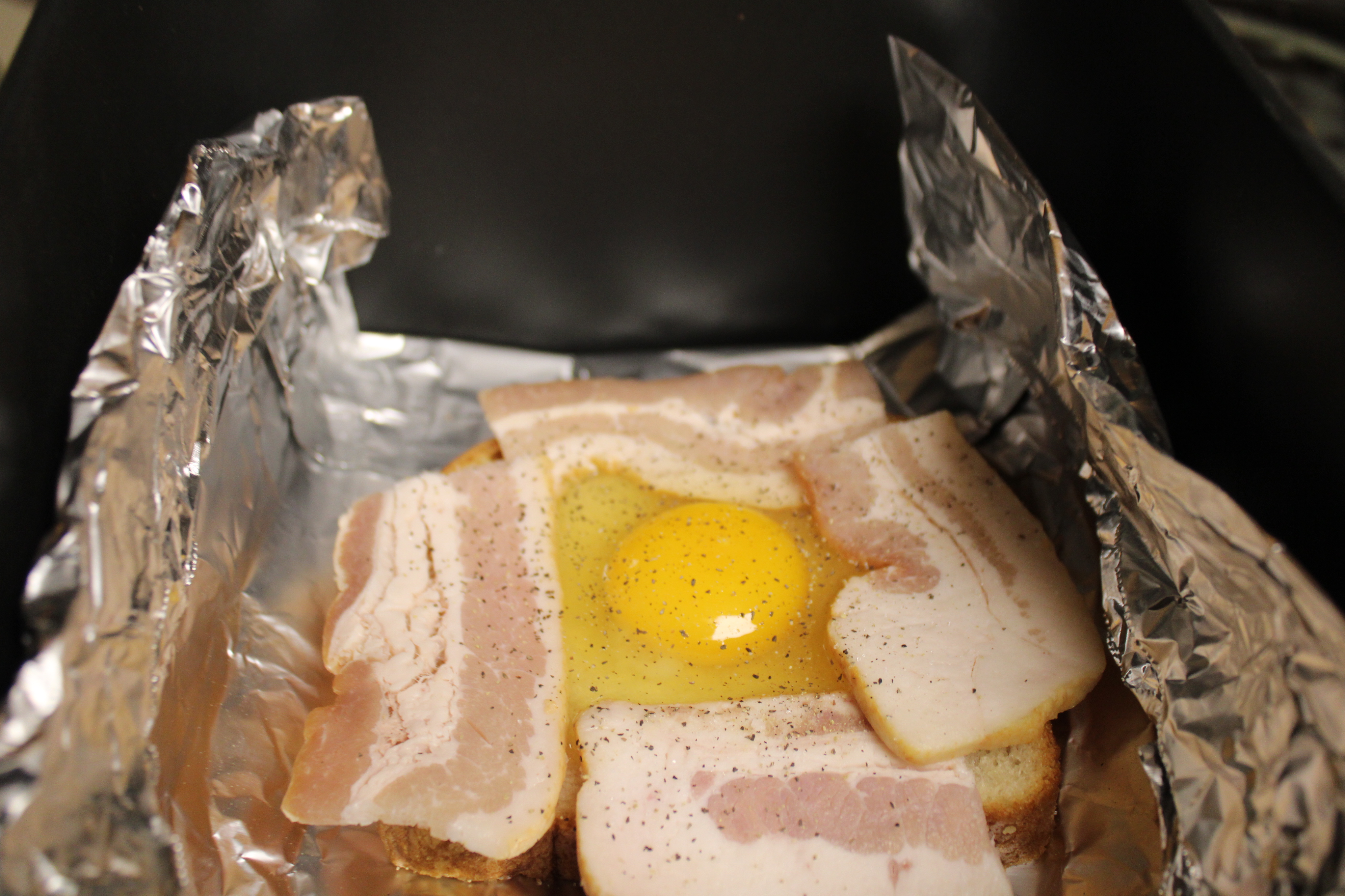 Place a slice of bread on the foil. Press a dent into the center of the bread using a 1/2-cup Measuring Cup. Cut a slice of bacon in half, then cut the halves in half again. Lay the bacon pieces around the outer edge of the bread to frame the indentation. Crack an egg, gently drop egg into the dent. Season with salt and pepper.