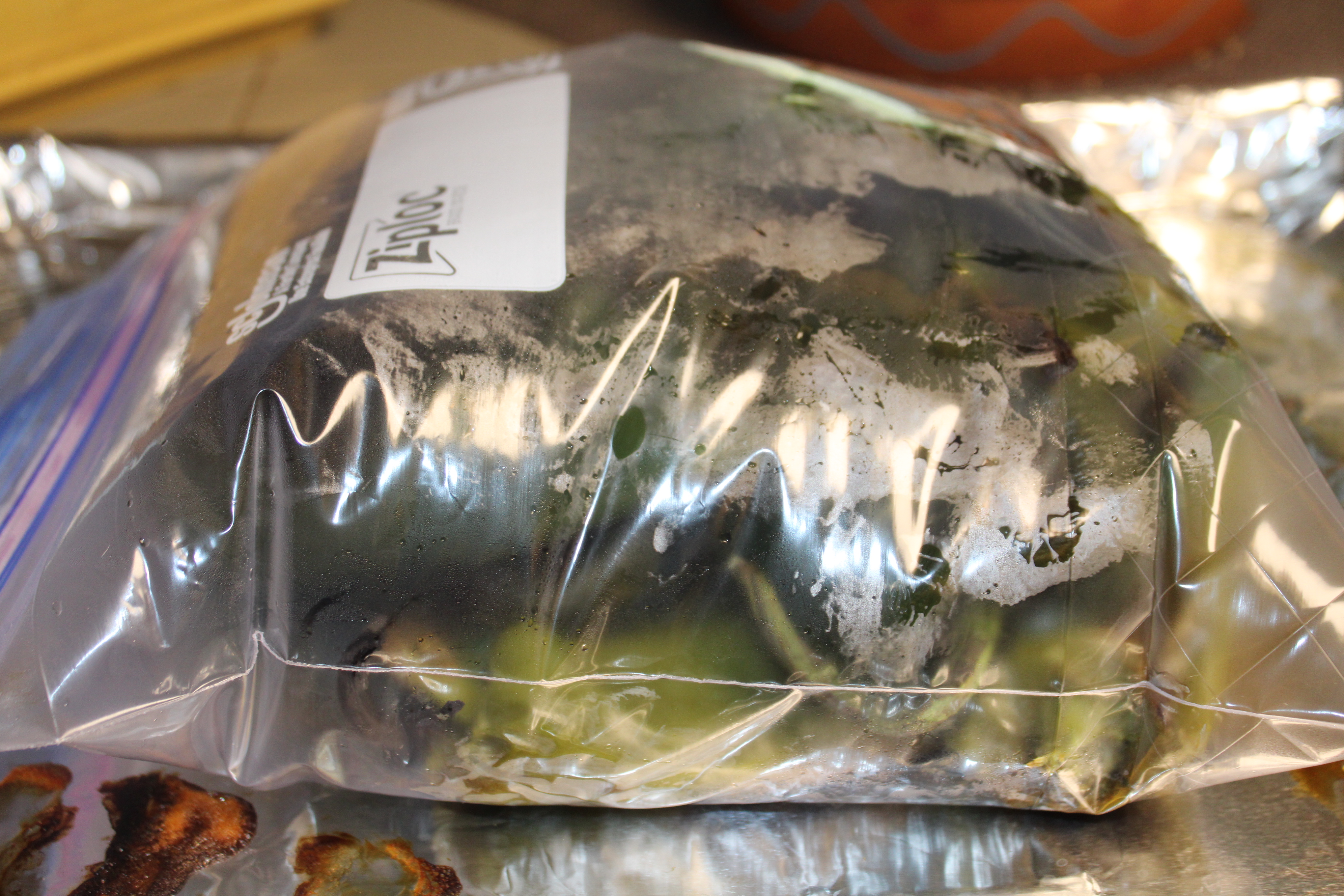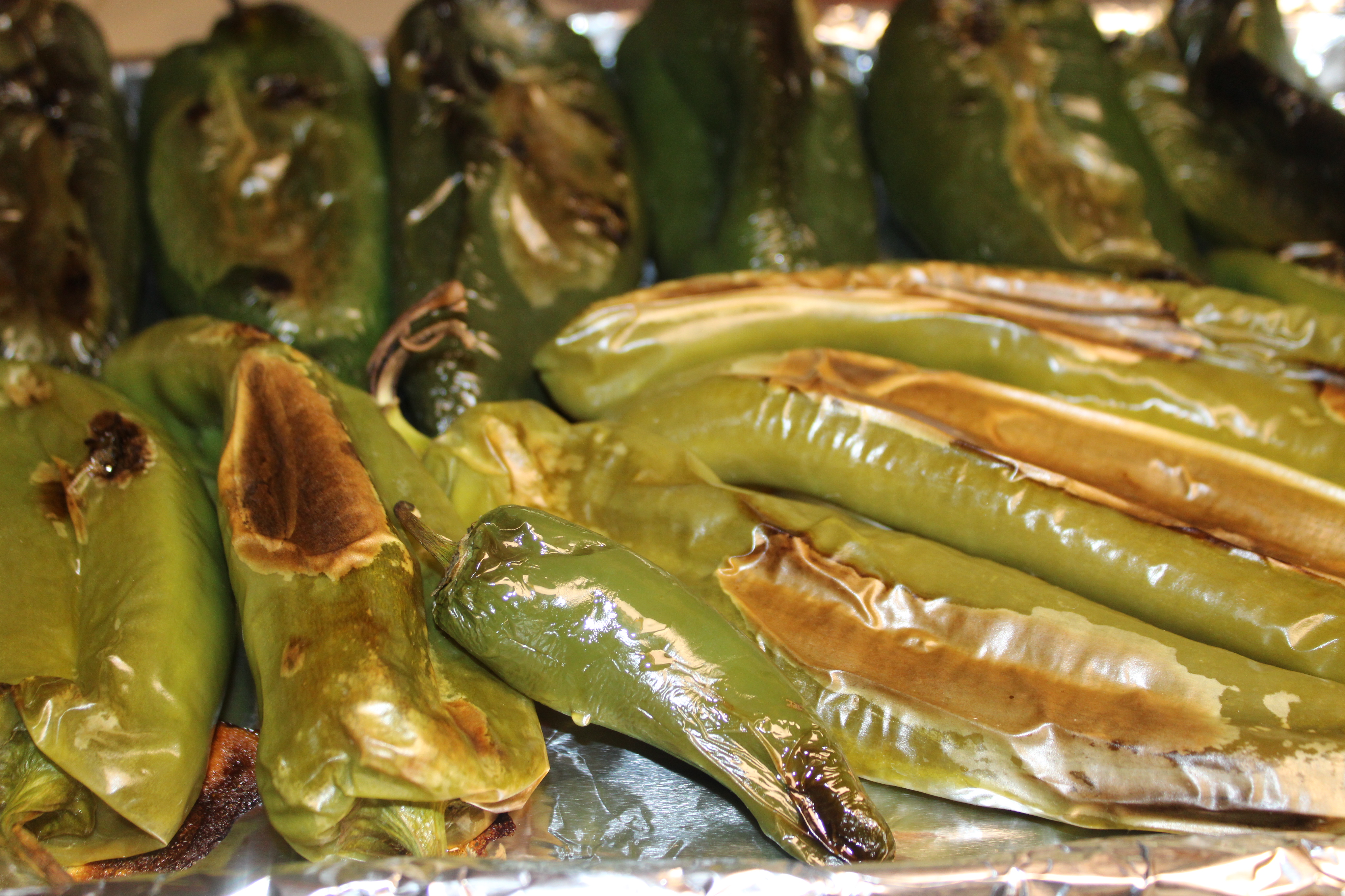 Remove roasted chlie peppers from the oven; place in a sealable plastic bag and let set for 10 minutes to steam while they cool. Remove chilies from the bag, split open and peel away skins. Remove some or all of seeds and membrane depending on desired heat level. Chop and set aside.
