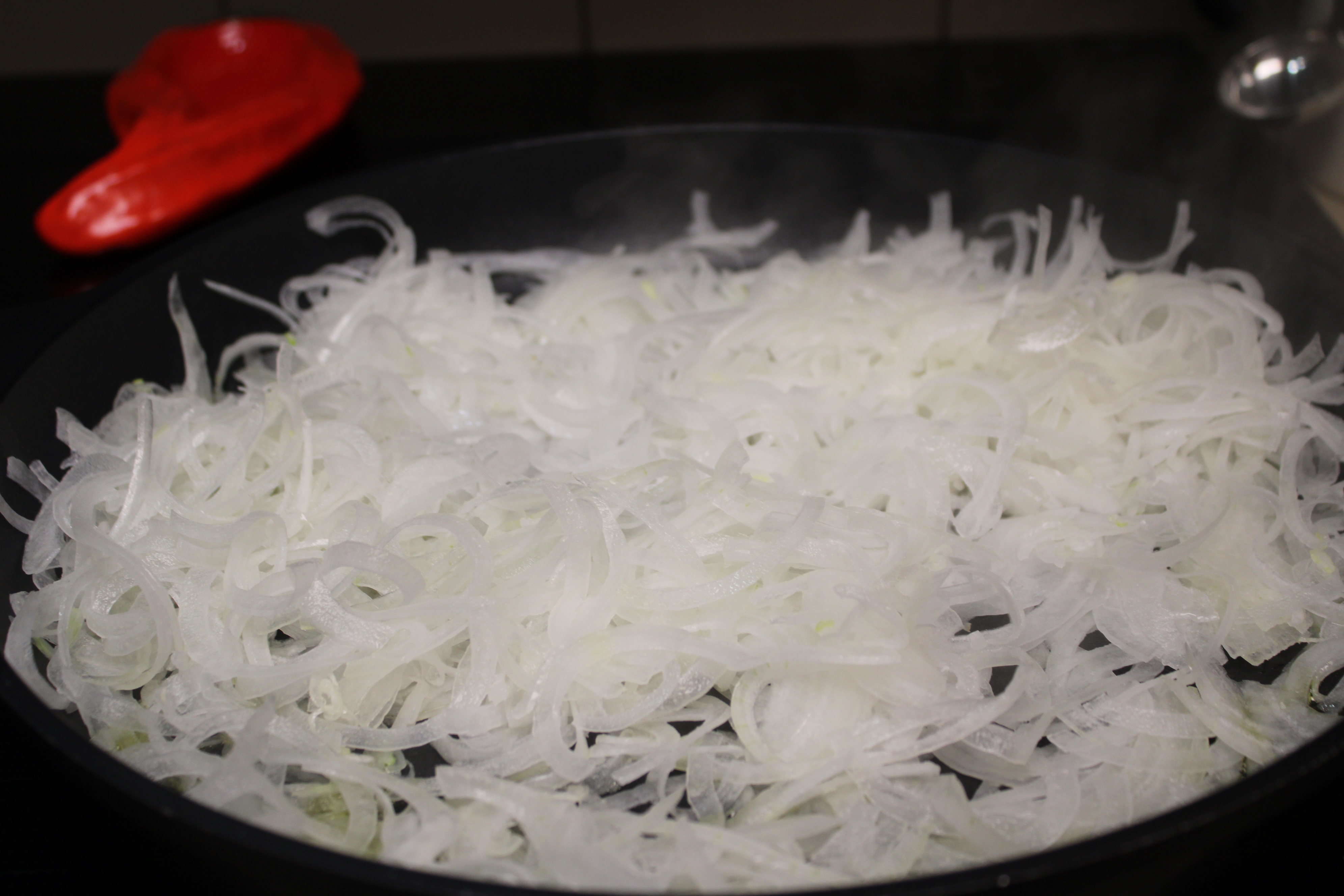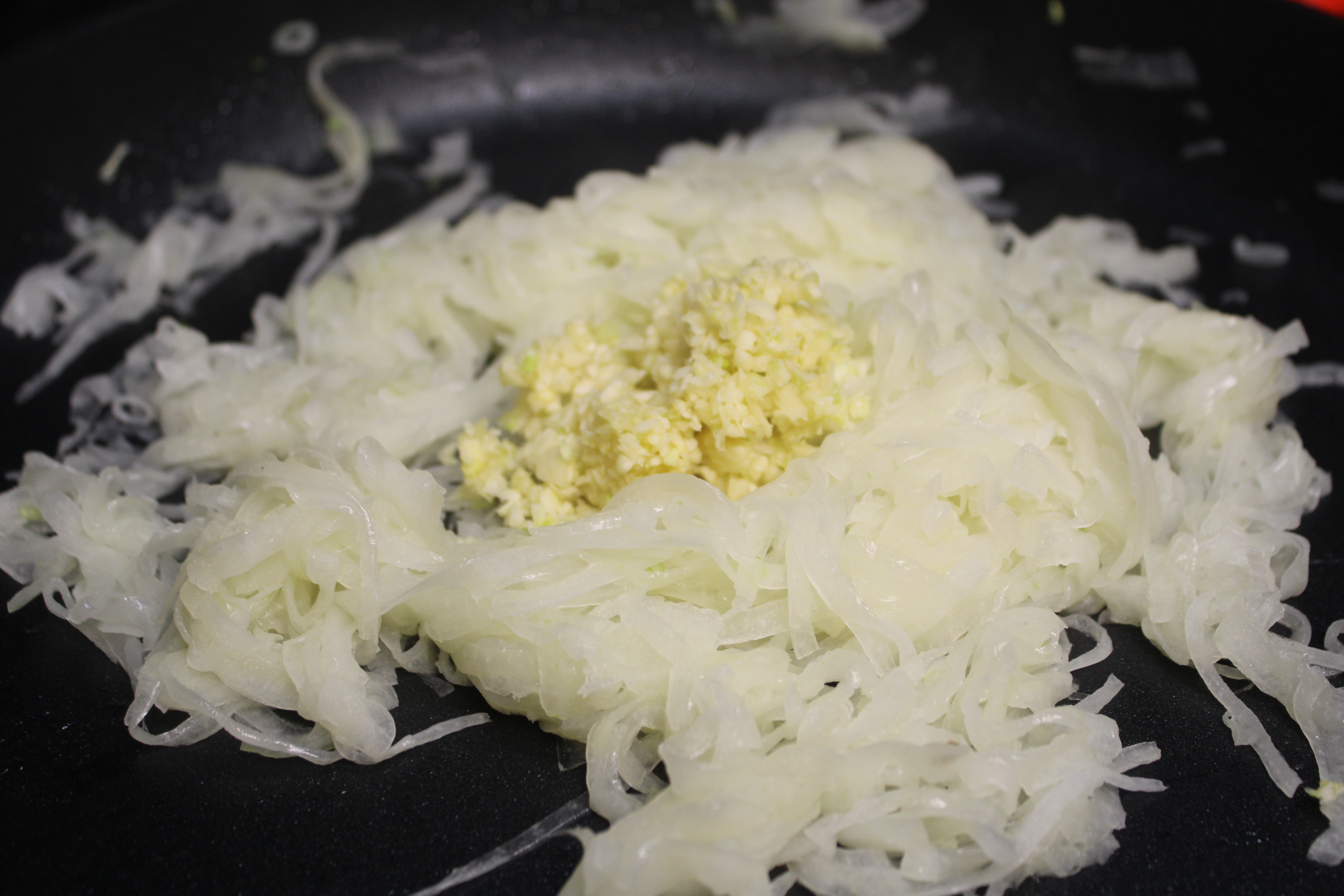 Heat olive oil in a large skillet over medium heat. Sauté onions until tender and translucent, about 6 minutes or so. DO NOT let onions caramelize. Add garlic, sautéed until aromatic, about 30 seconds longer.