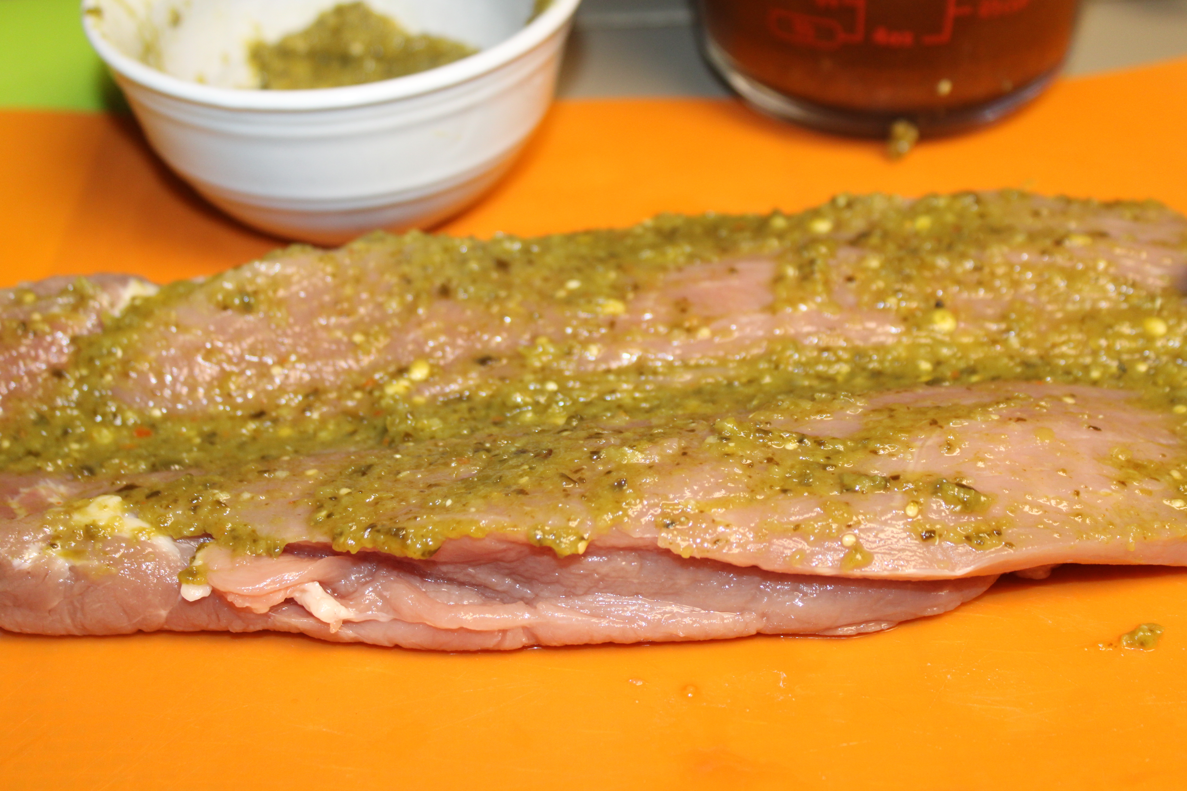 Butterfly pork tenderloin. Brush about a quarter cup of the Enchilada Sauce on the cut side of the tenderloin. Close, brush more sauce on the outside of the pork. Place in the roasting pan. Pour seasoned stock around the pork. If necessary, add more stock to fill the pan half-way up the side of the roast. Scatter onion slices and celery all around the pork.