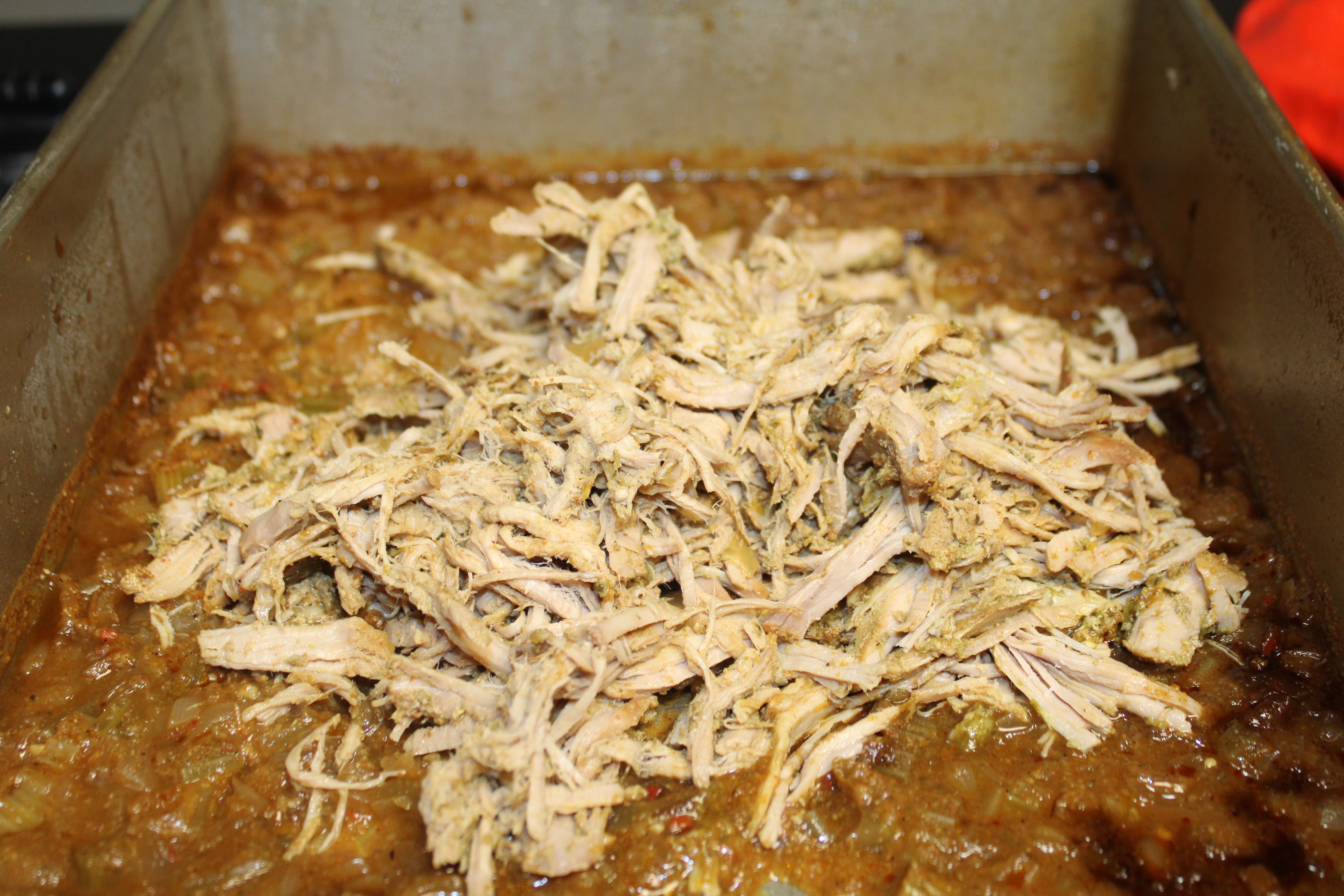 Remove pan from oven, let rest on the counter until meat has cooled to the touch. With clean hands, shred the pork. Work cooking liquid along with the onions and celery into the pork filling.
