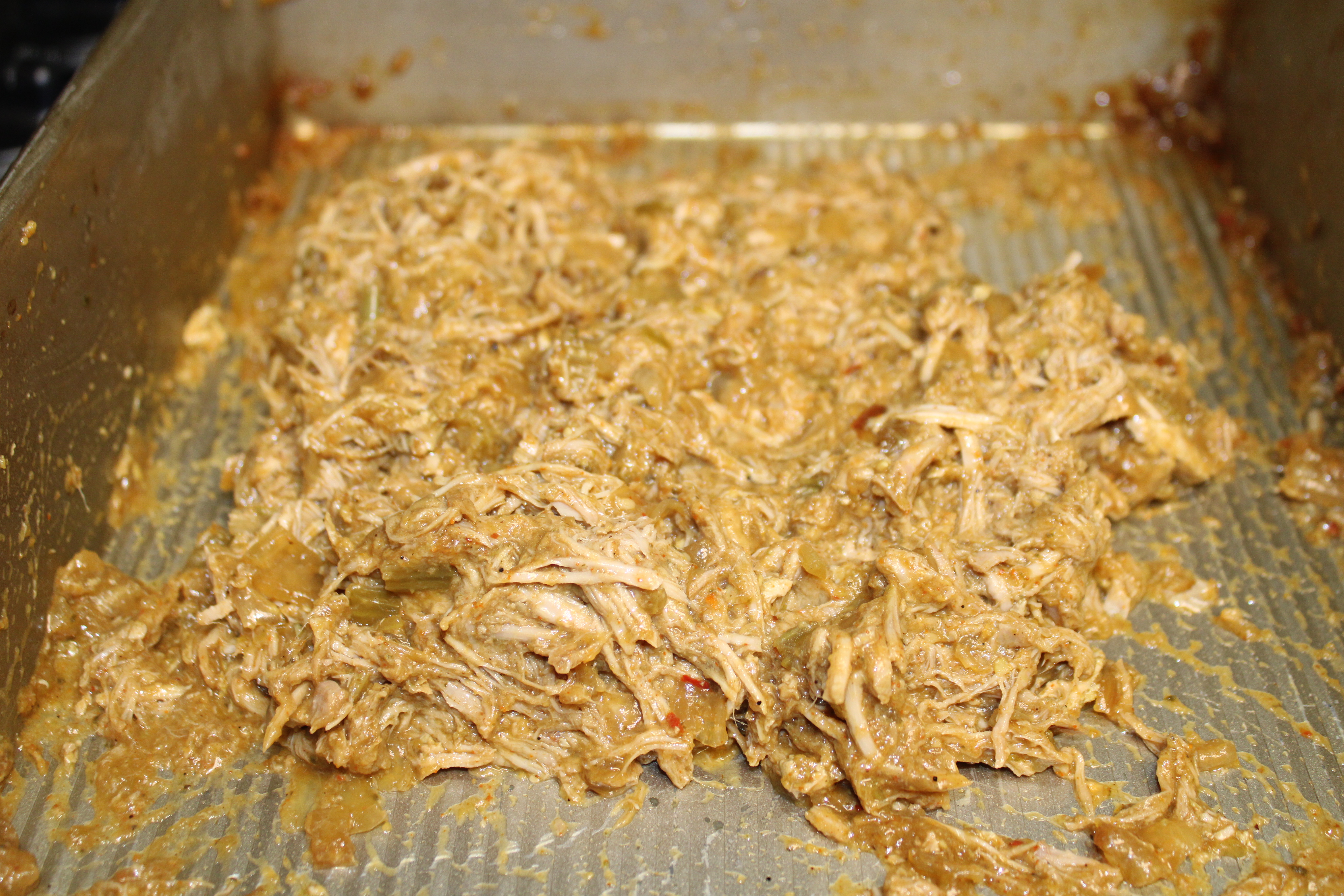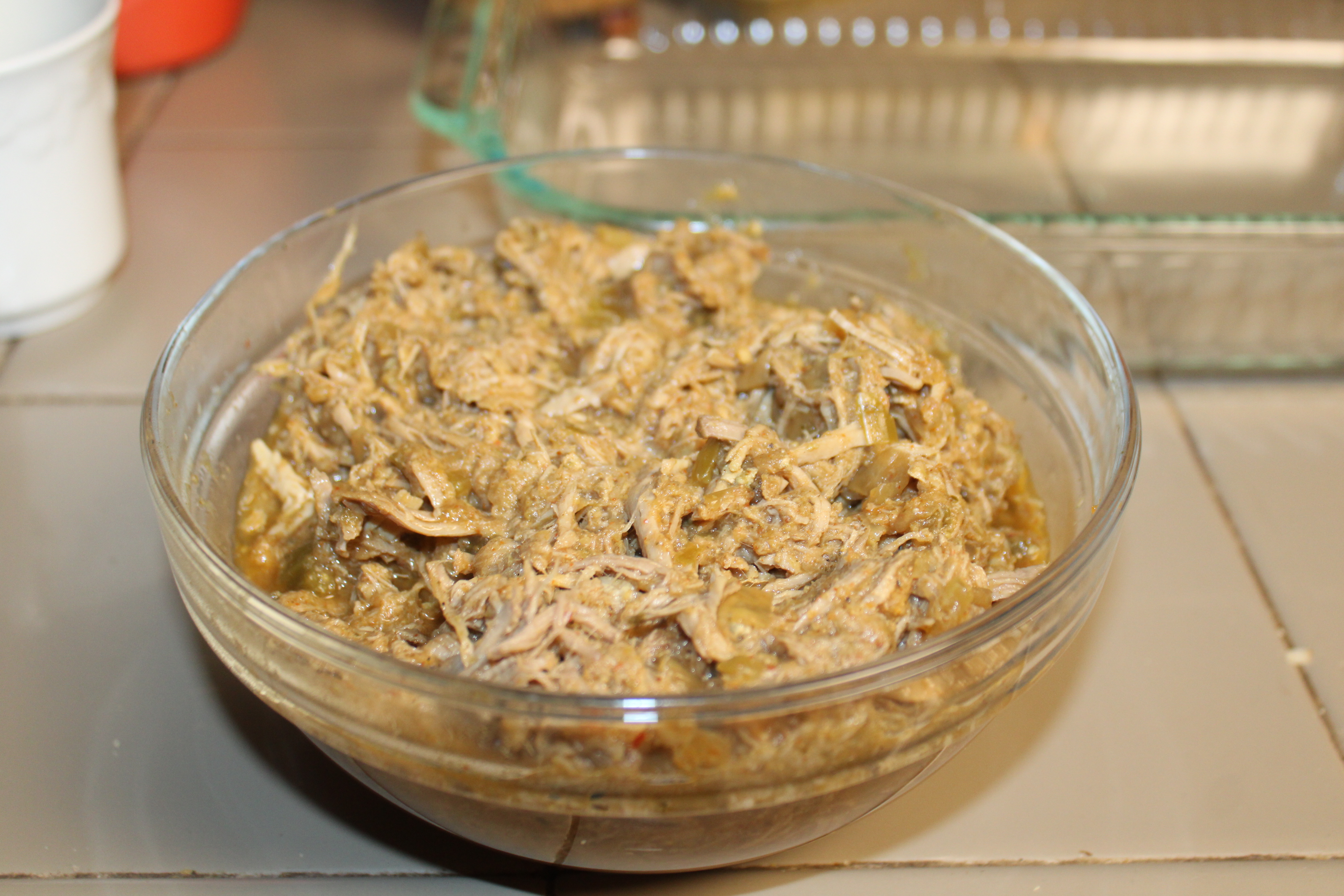 Place shredded pork mixture into a bowl. Add enough enchilada sauce to moisten meat mixture for easy rolling. Gently warm the pork filling.