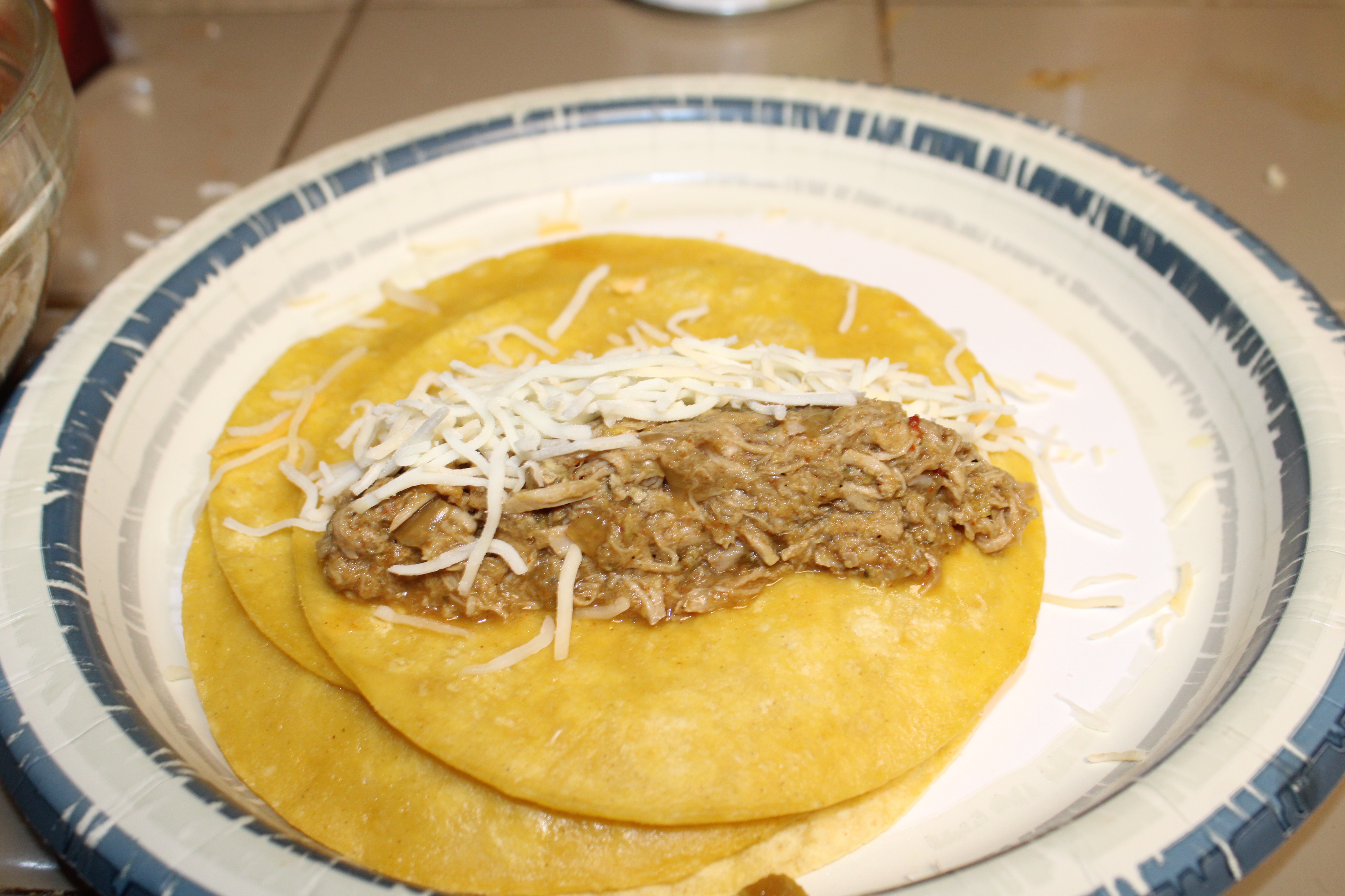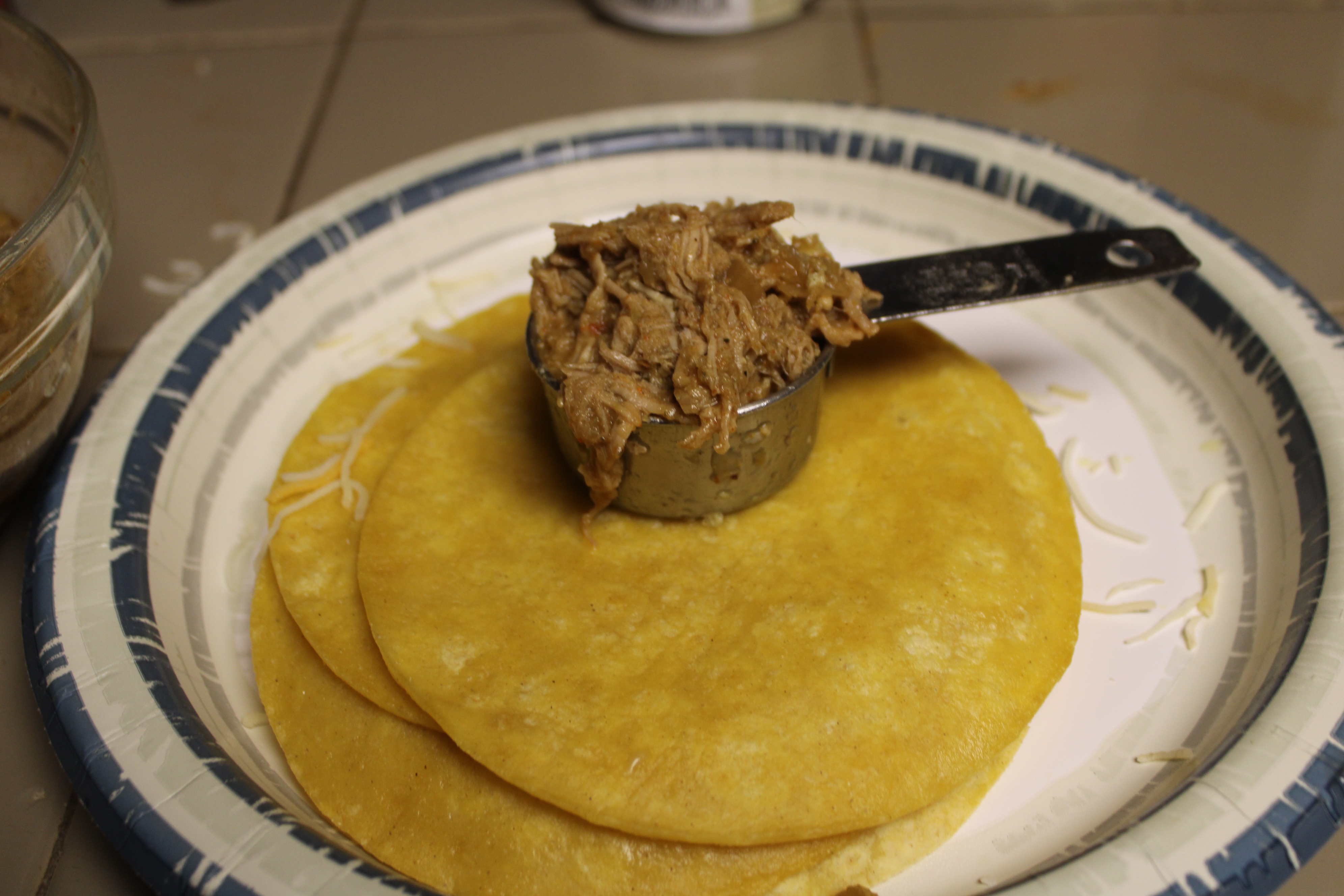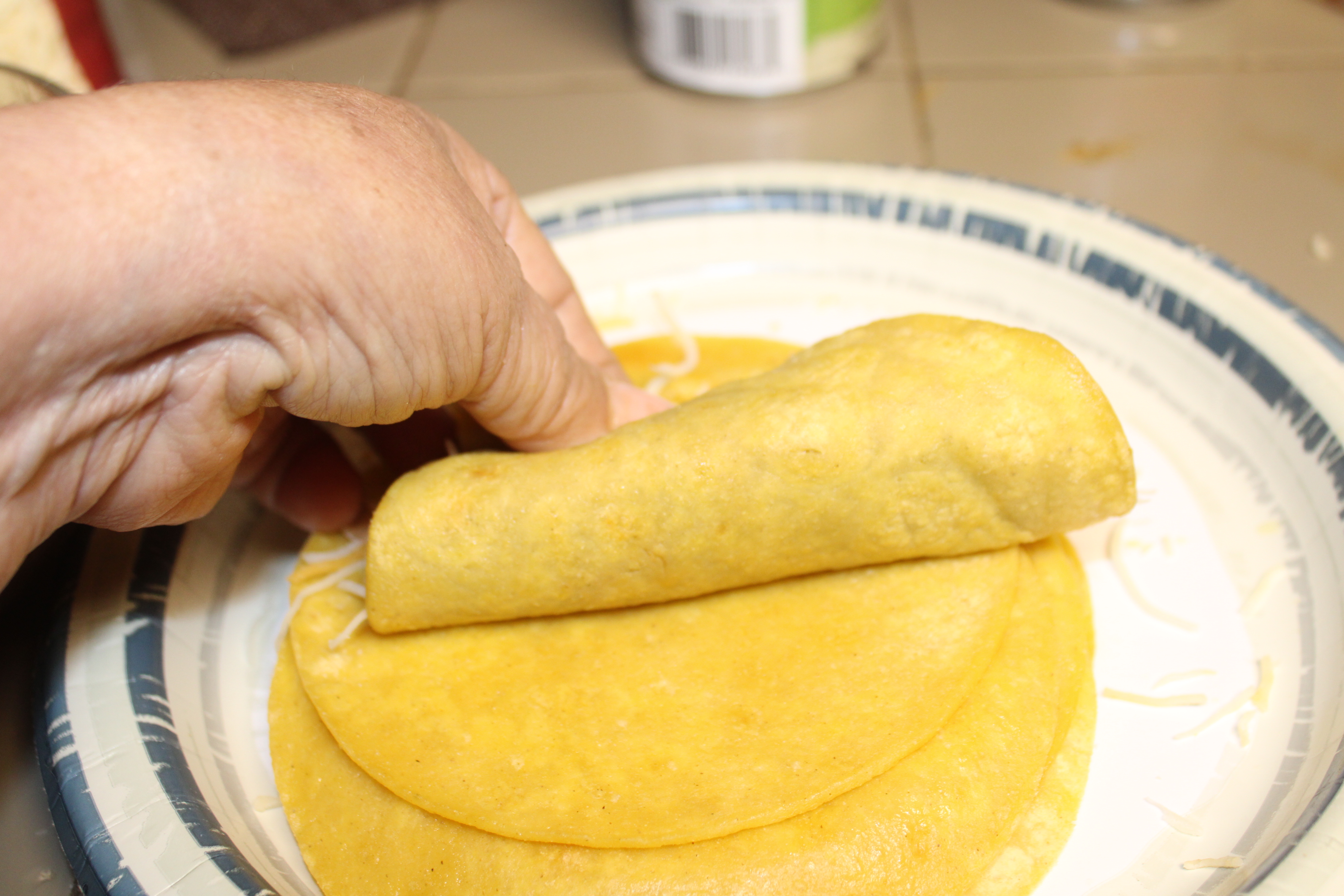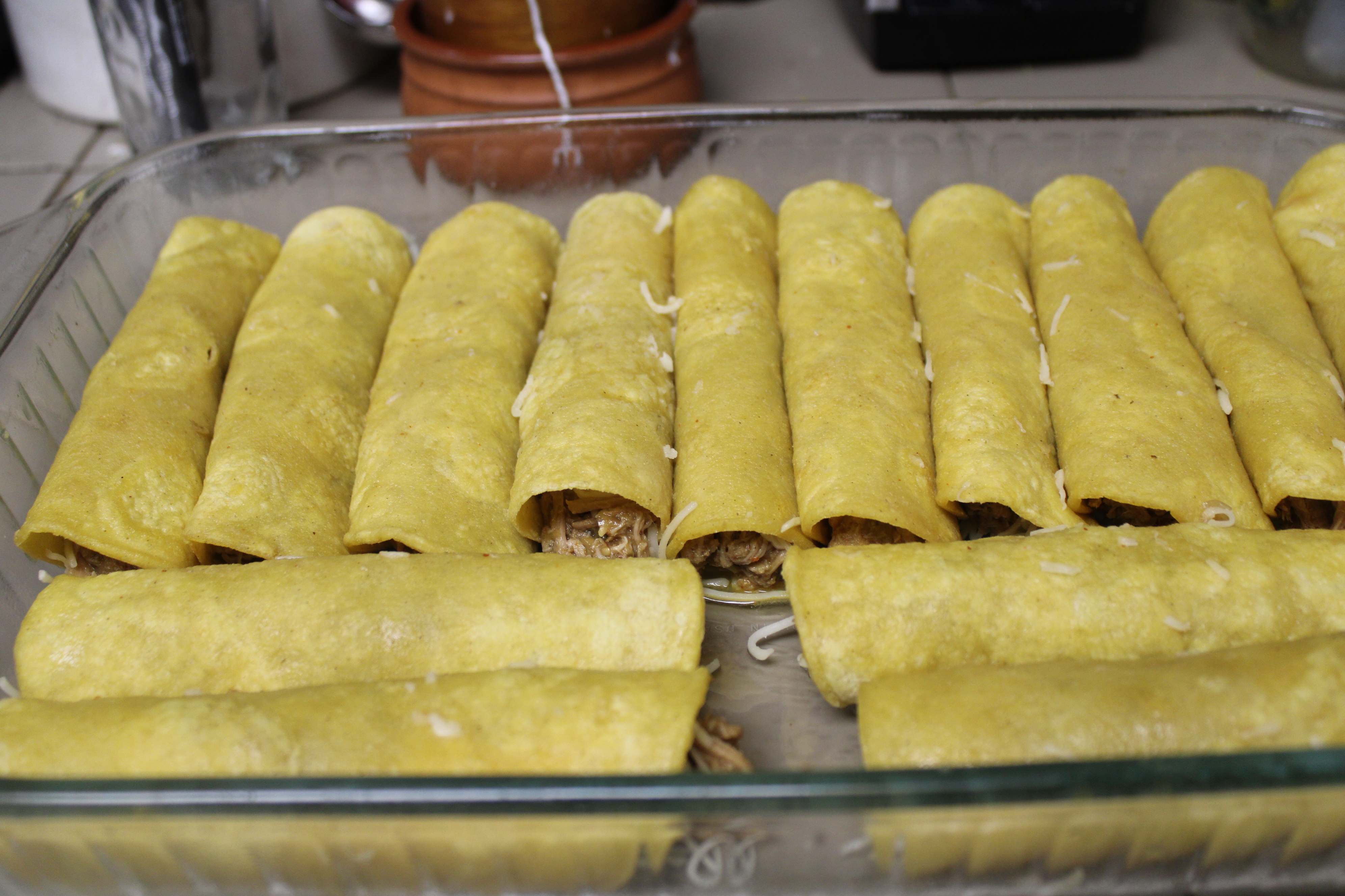 Transfer tortillas to a plate. Place a quarter cup of shredded pork down the center of a tortilla, top with a scattering of the finely shredded cheese. Fold tortilla over the filling, roll firmly around the meat. Place seam-side-down in the prepared casserole dish. Repeat until all the tortillas have been filled with shredded meat.