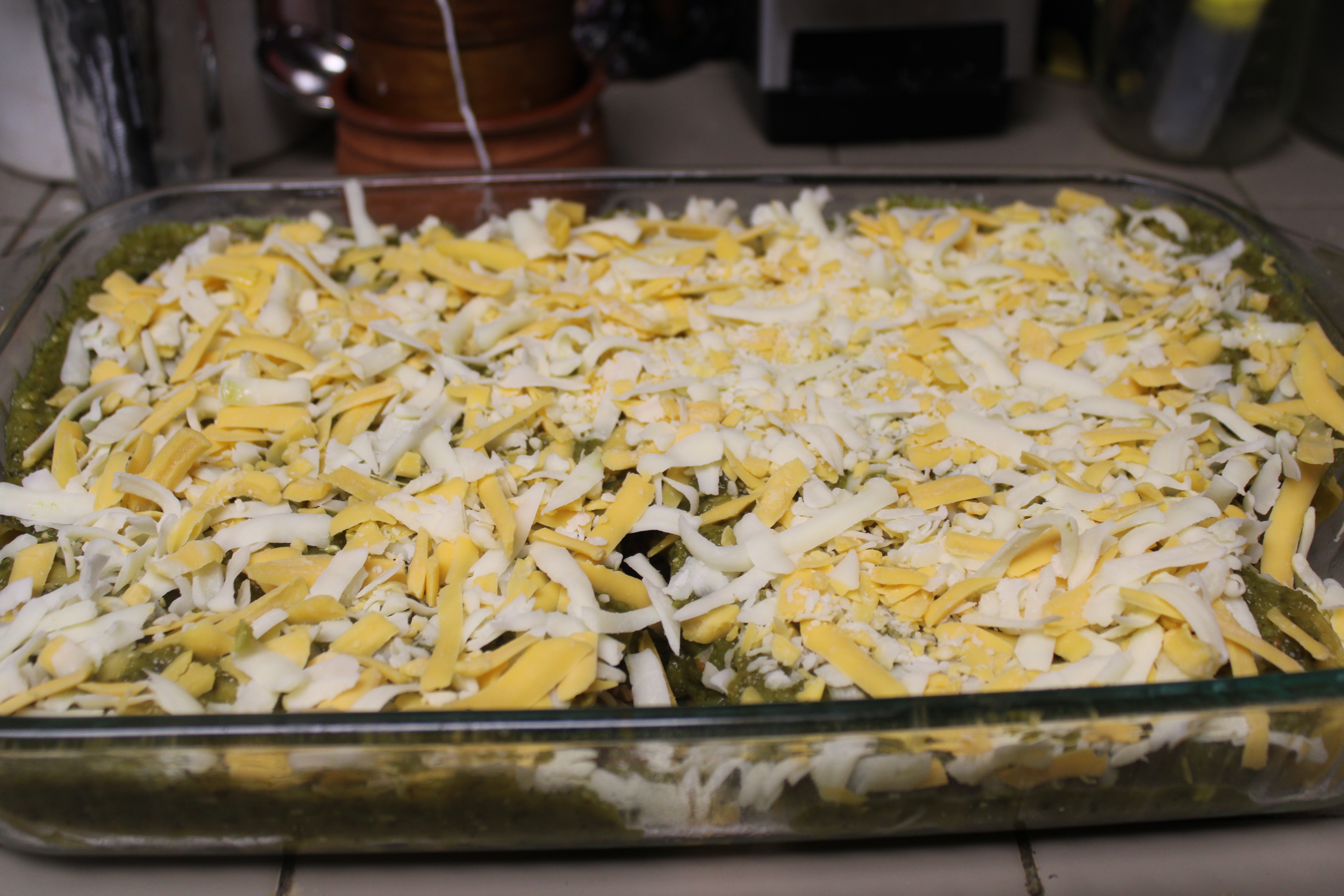 Ladle sauce over the enchiladas, spread out to coat. Scatter the thickly shredded cheese over the enchiladas. Spray foil with cooking spray to prevent sticking, cover casserole with foil. Place in the heated oven and bake until warmed through and bubbling, about 25 minutes.