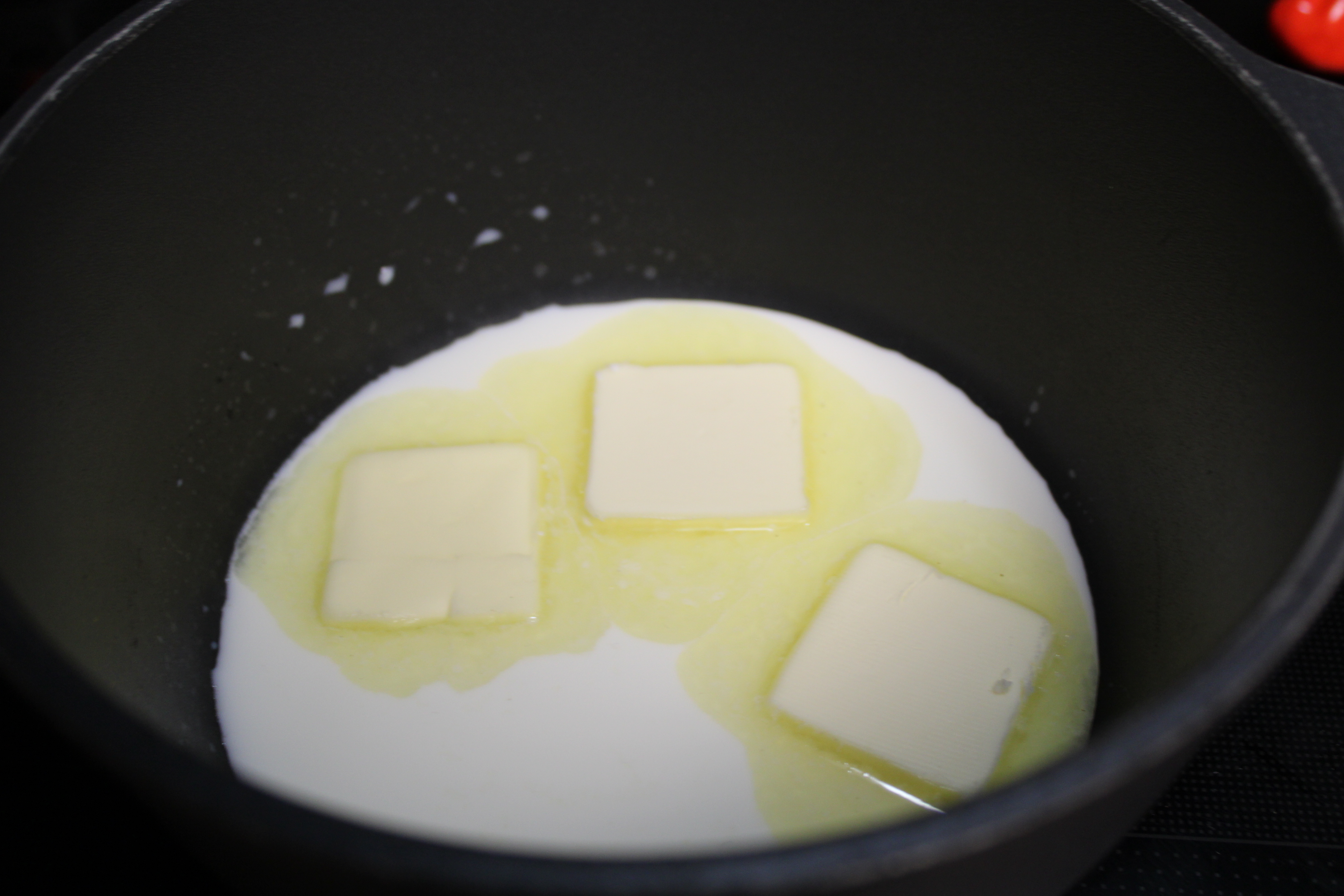 Meanwhile, heat milk, butter, salt and pepper in a small saucepan over medium-low heat, whisking until smooth, about 3 minutes. Cover and keep warm.