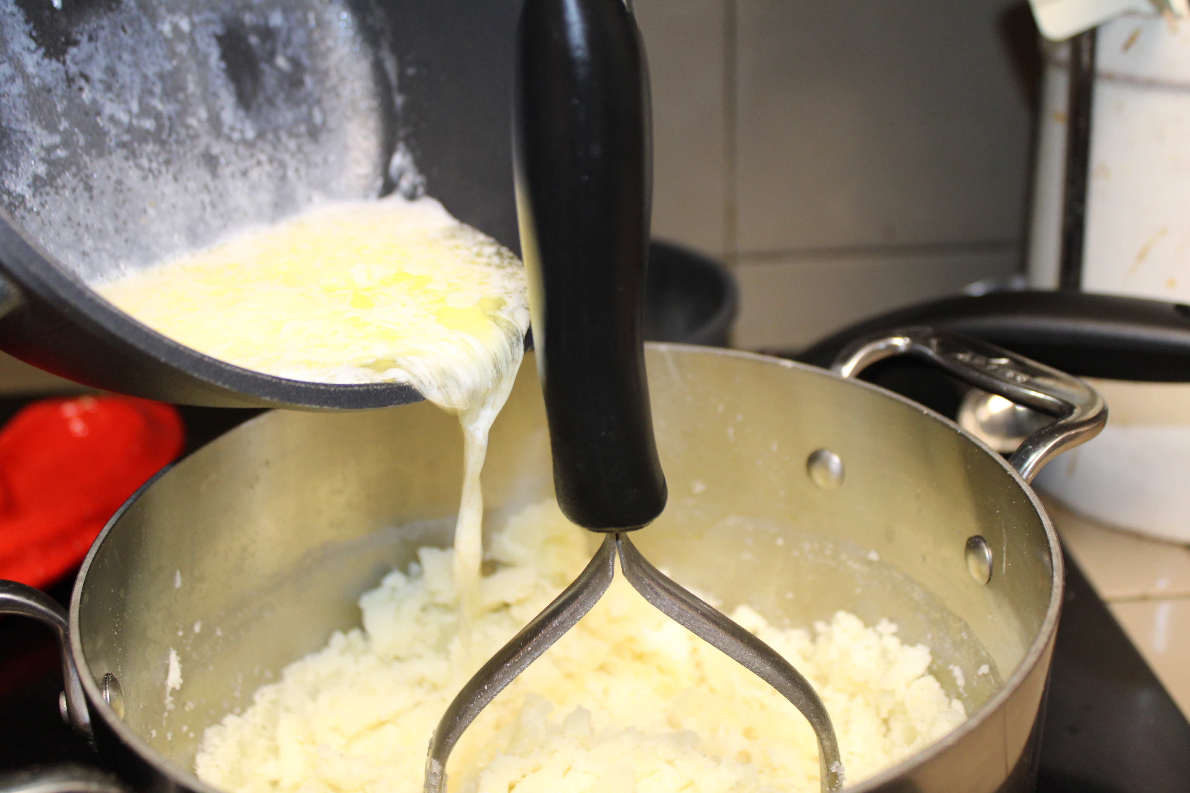Lightly smash the dried potatoes with a potato masher. Add warmed milk mixture, continue to mash to desired consistency. Taste, adjust seasoning. If necessary, gently warm just before serving.