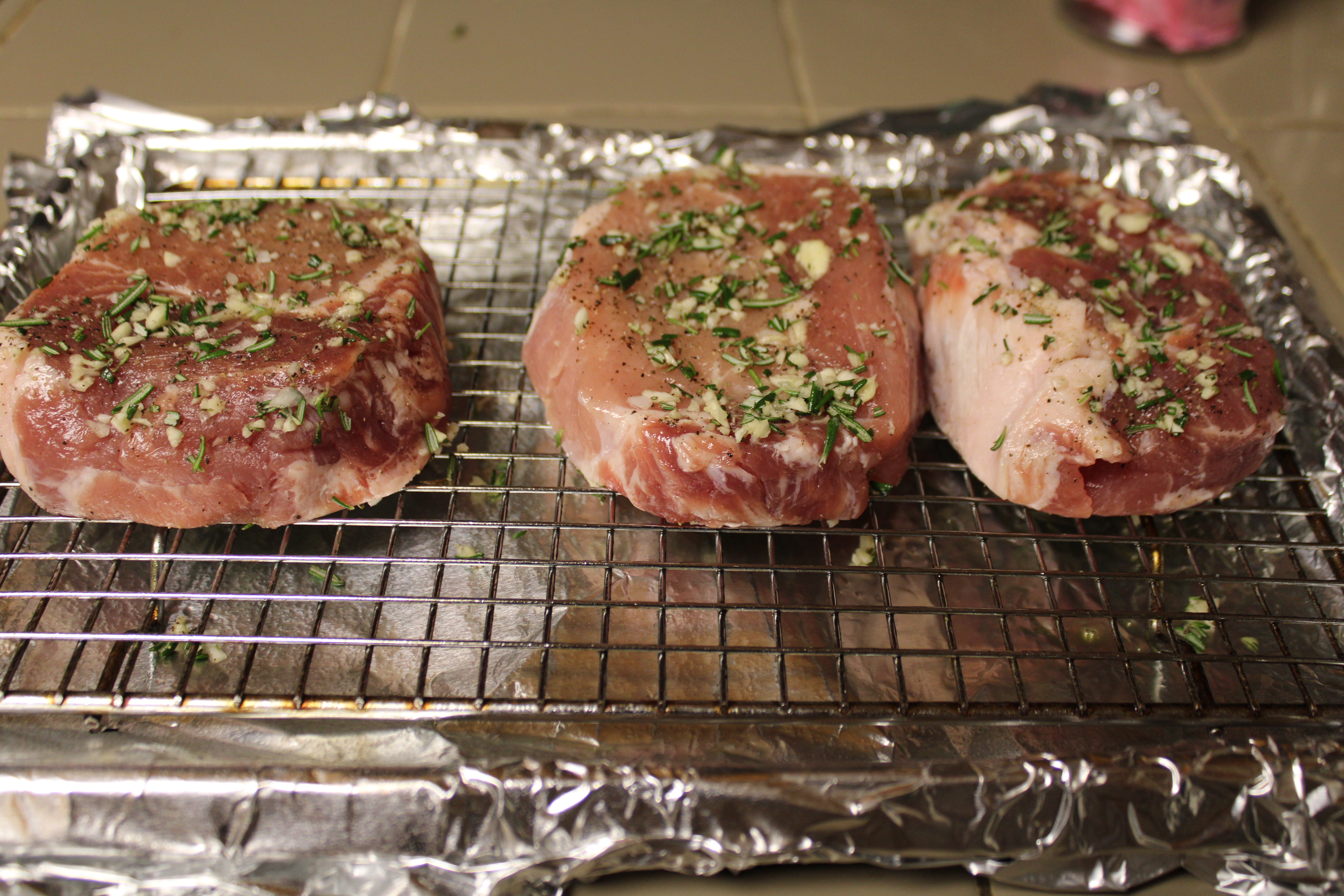 Season pork with salt and pepper to taste. Sprinkle half of the rosemary mixture evenly over the chops, massaging into the meat. Place chops, massaged side down, on the roasting rack. Sprinkle remaining rosemary mixture over the chops; work into the meat.