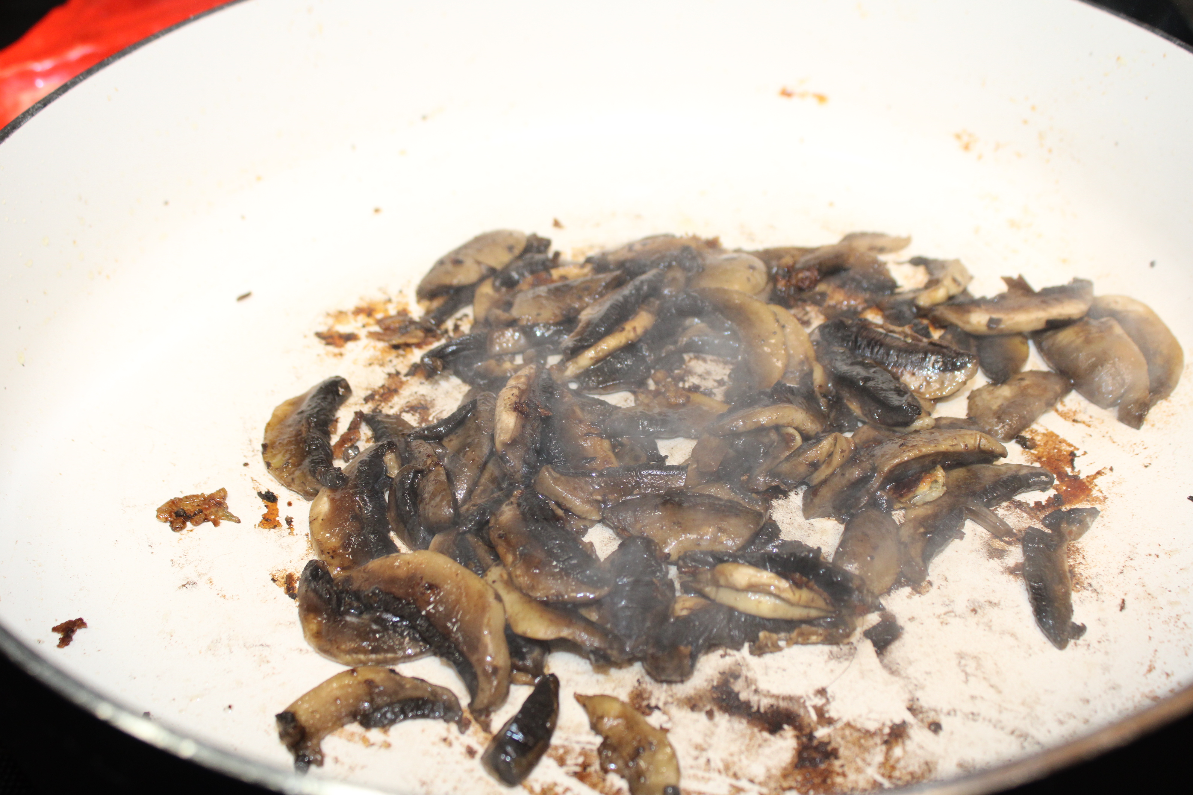 Reduce heat under skillet to medium. Add remaining tablespoon of olive oil. Sauté mushrooms until tender and the liquid has been released; stirring often.