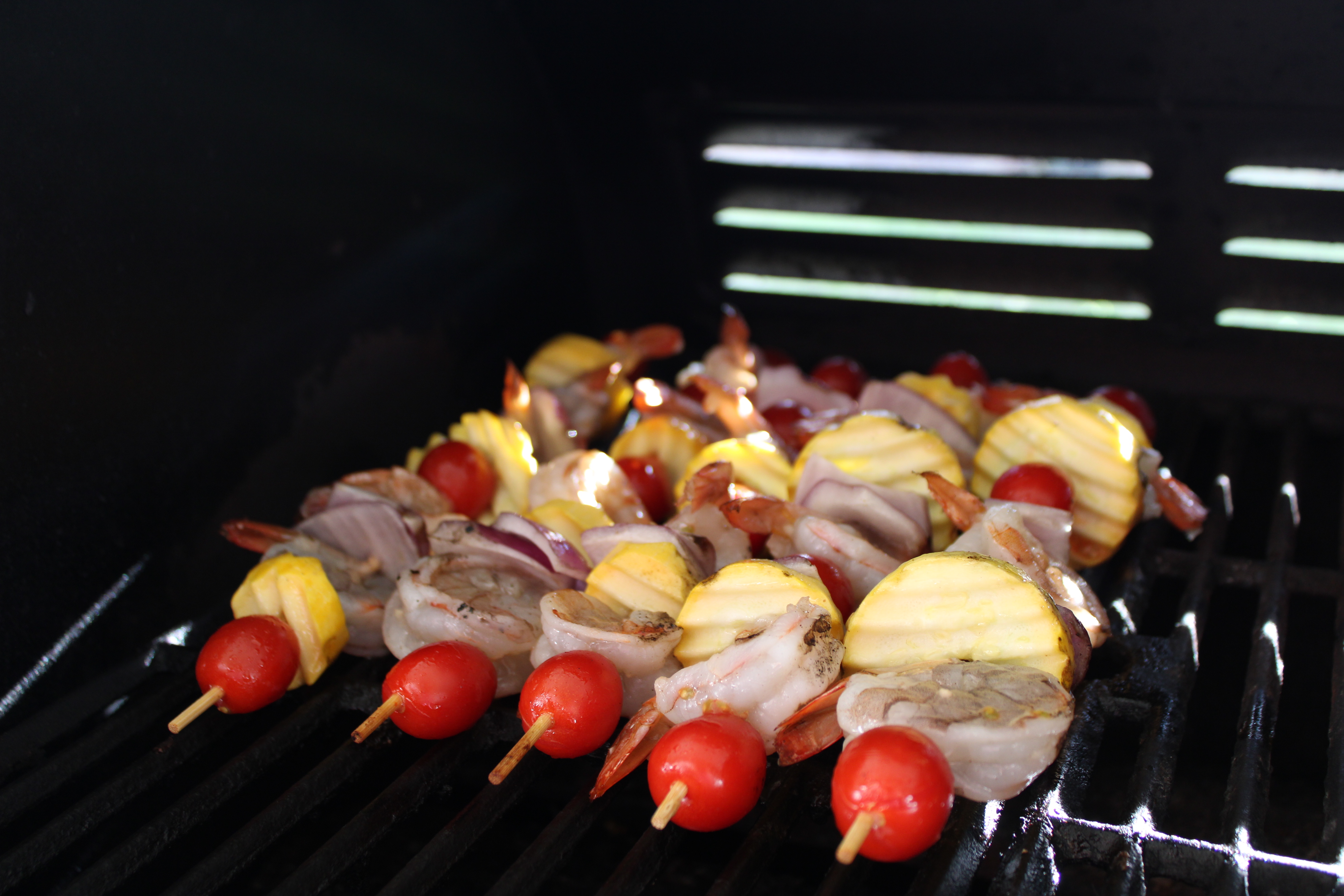 Alternate threading shrimp, squash, onion and tomato onto each skewer; leaving ample room at either end for easy of handling. DO NOT OVER-CROWD so air can circulate for even grilling.