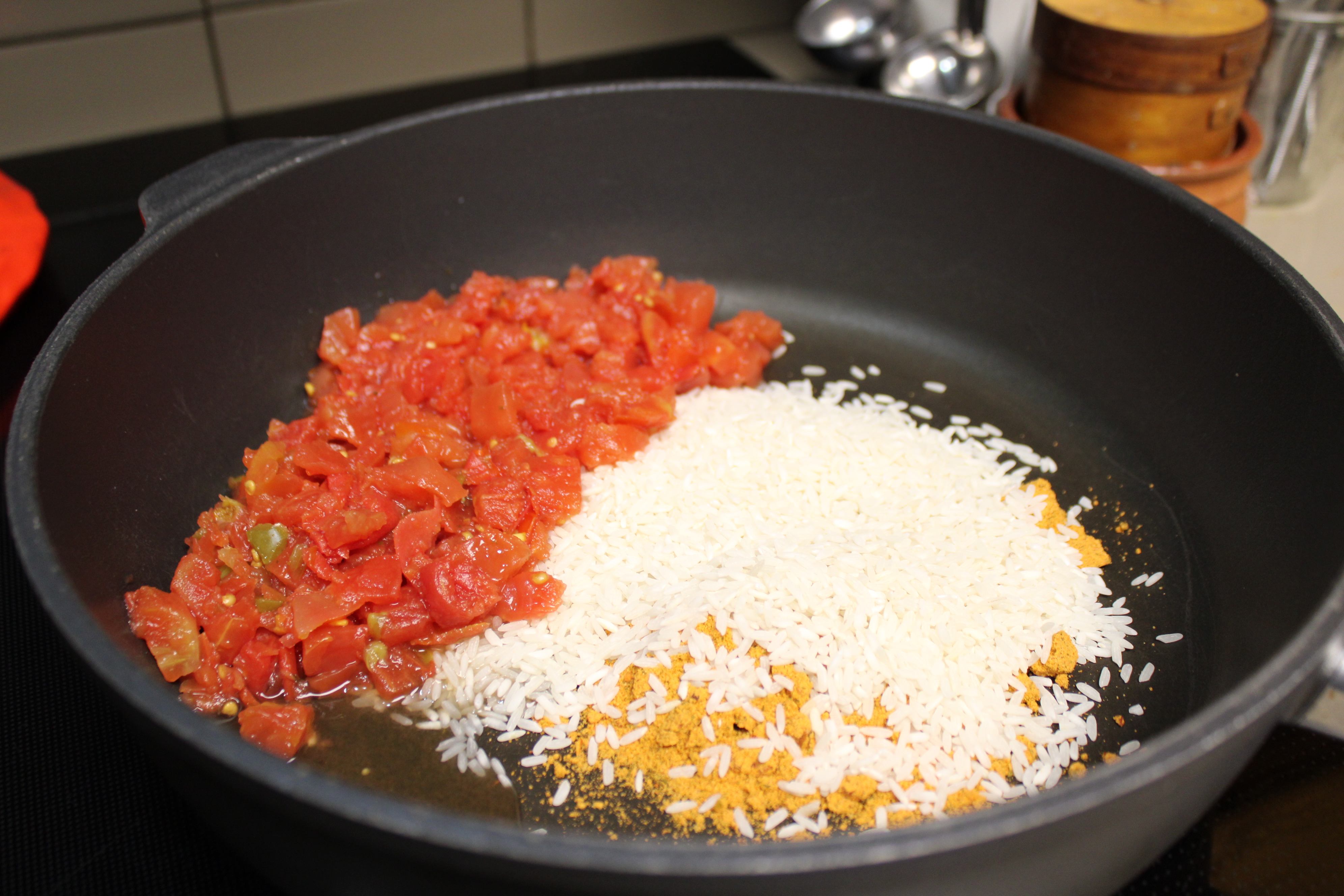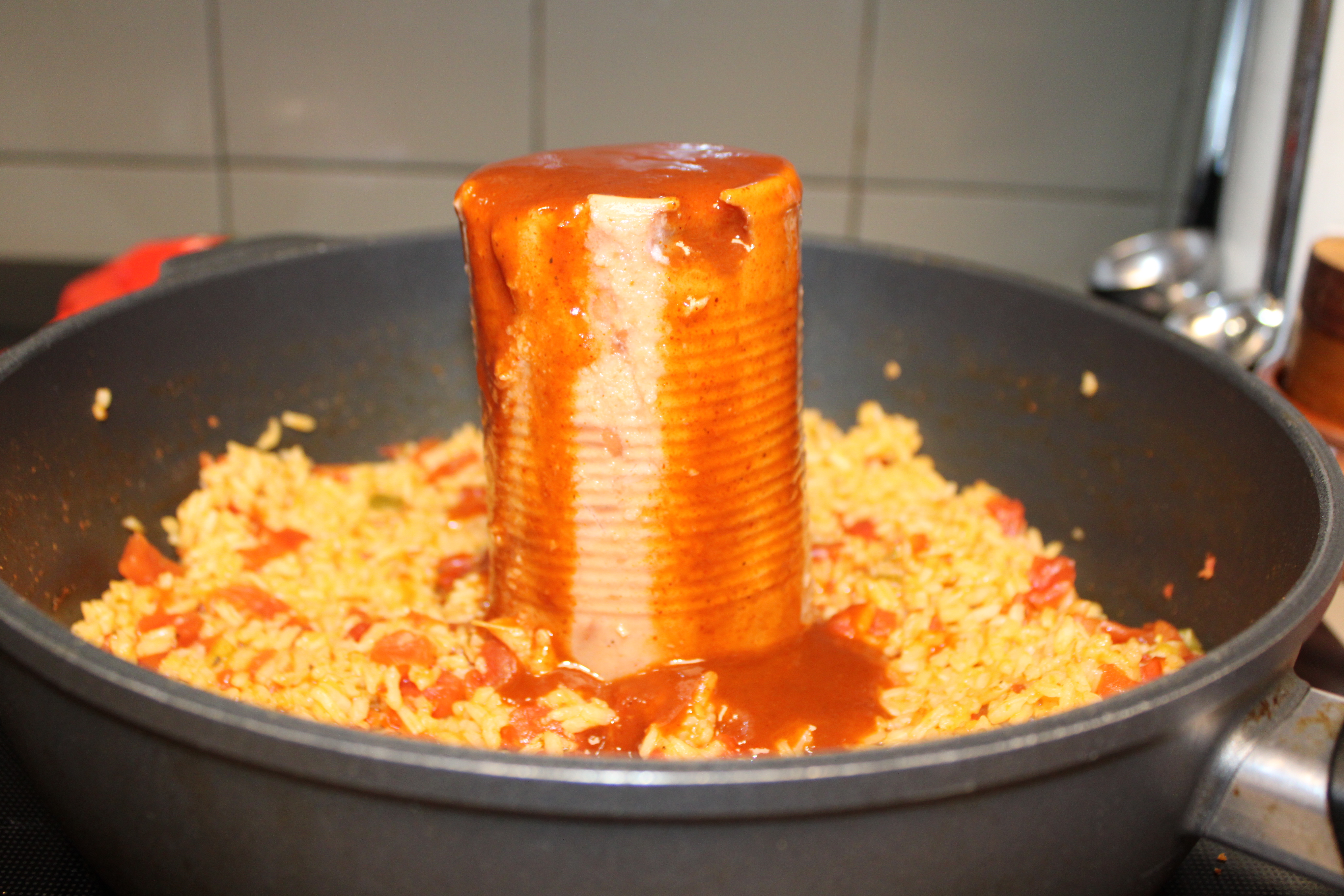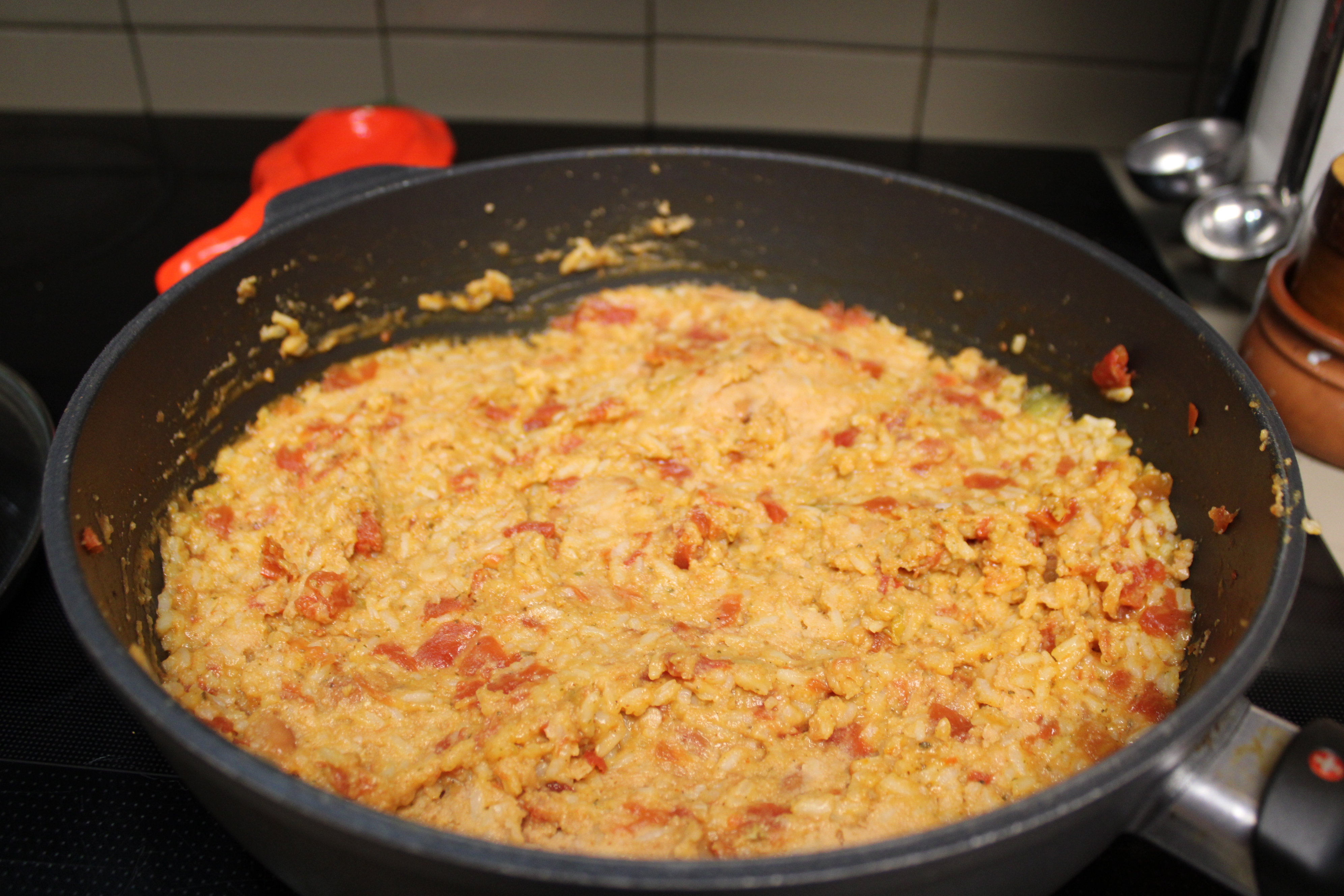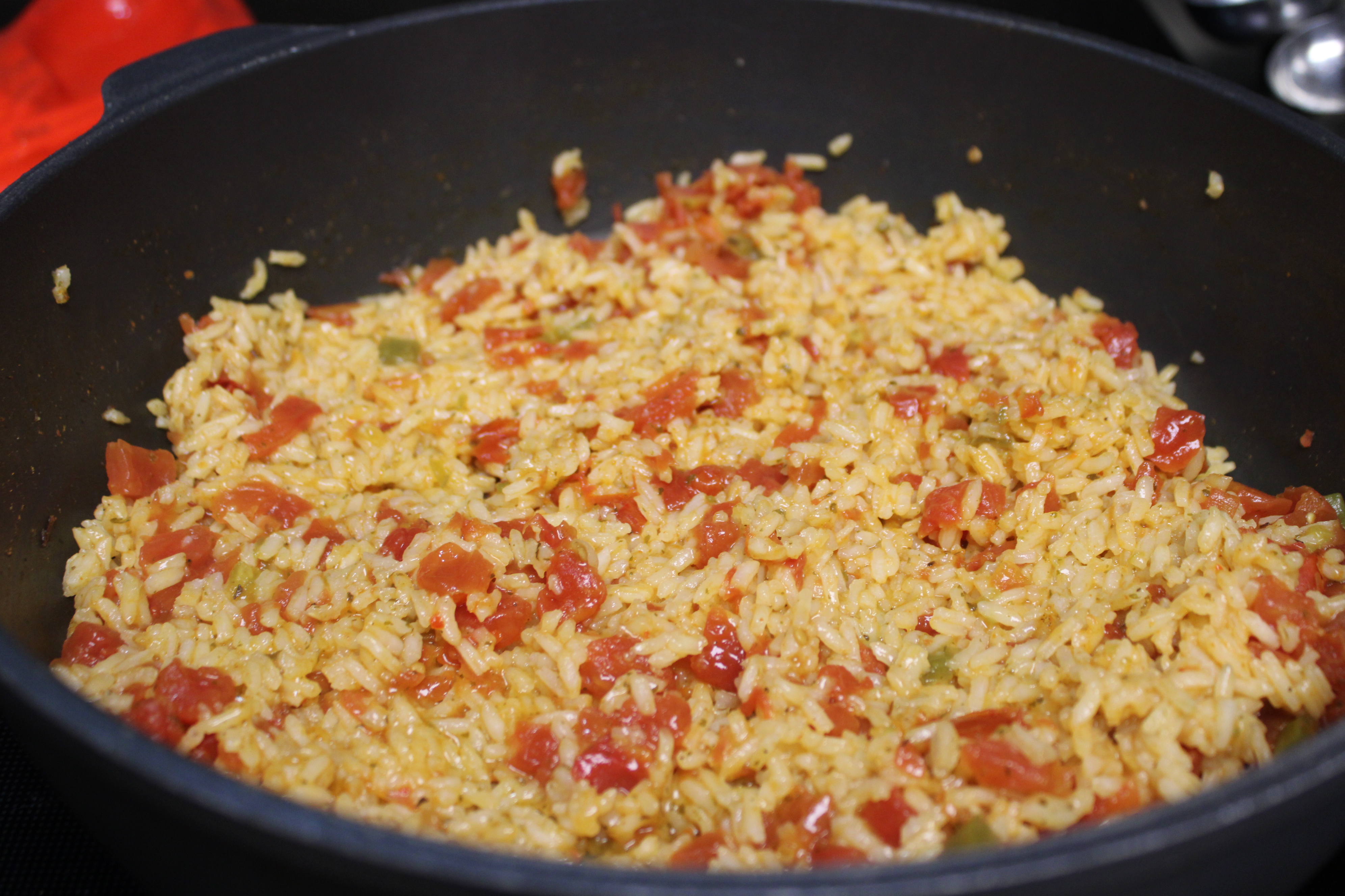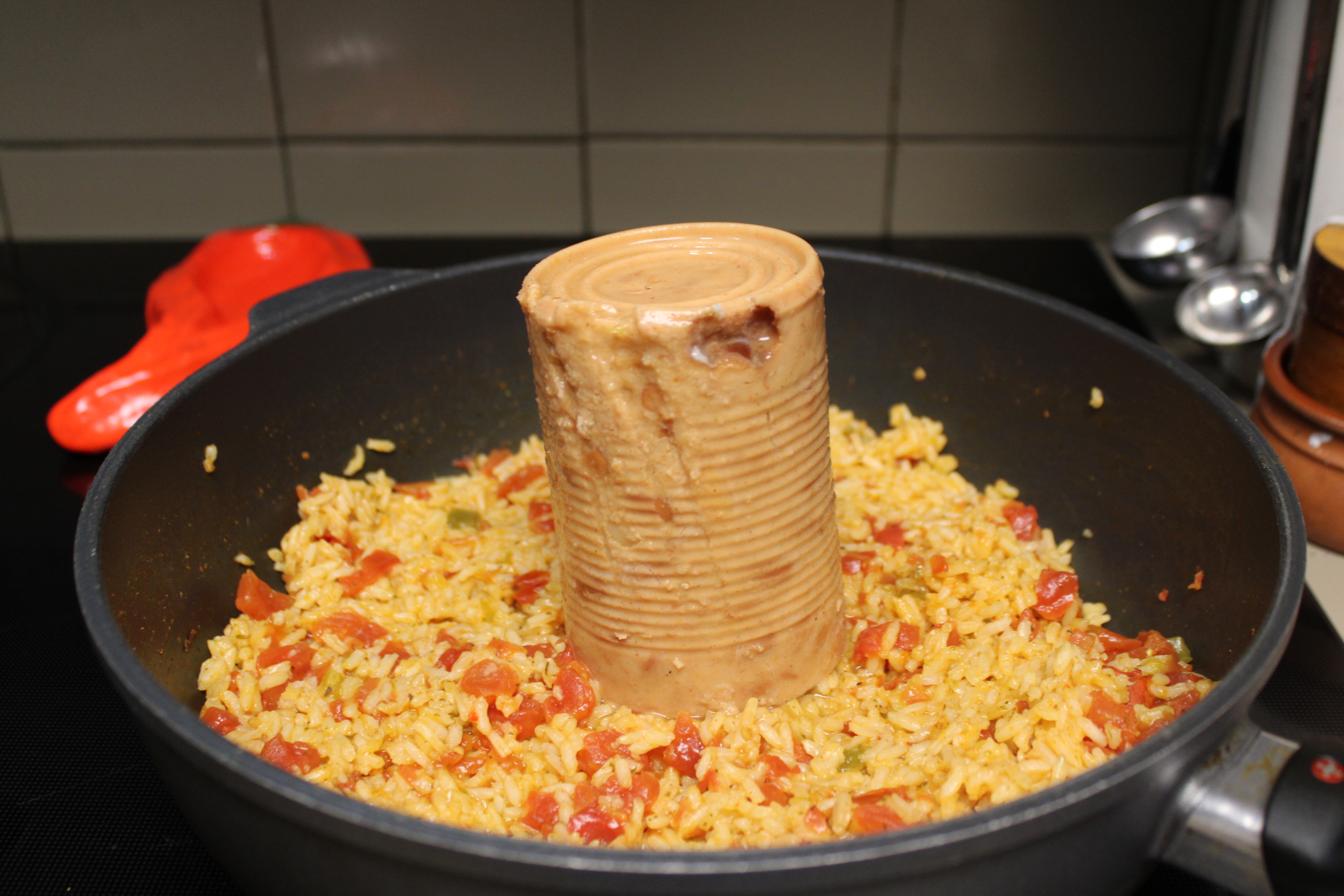When the rice is ready, stir in Refried Beans and a few tablespoons of Enchilada Sauce. Let mixture warm on low heat.