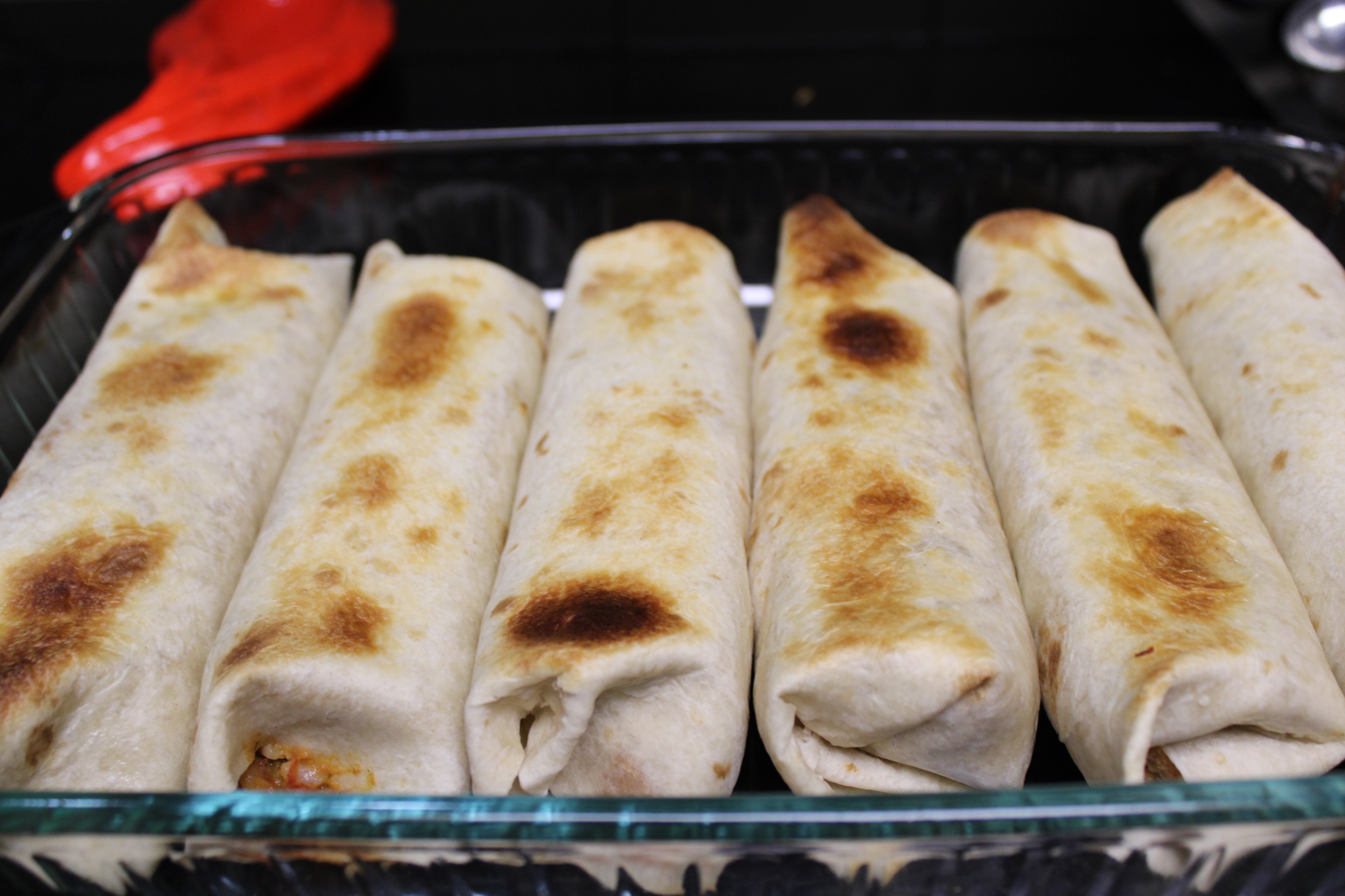 Spray burritos with cooking spray to help brown. Place casserole dish in the heated oven, bake until burritos are warmed through, about 8 minutes. Switch to broil, continue to brown until tops of tortillas are beginning to crisp, about 2 or 3 minutes longer.