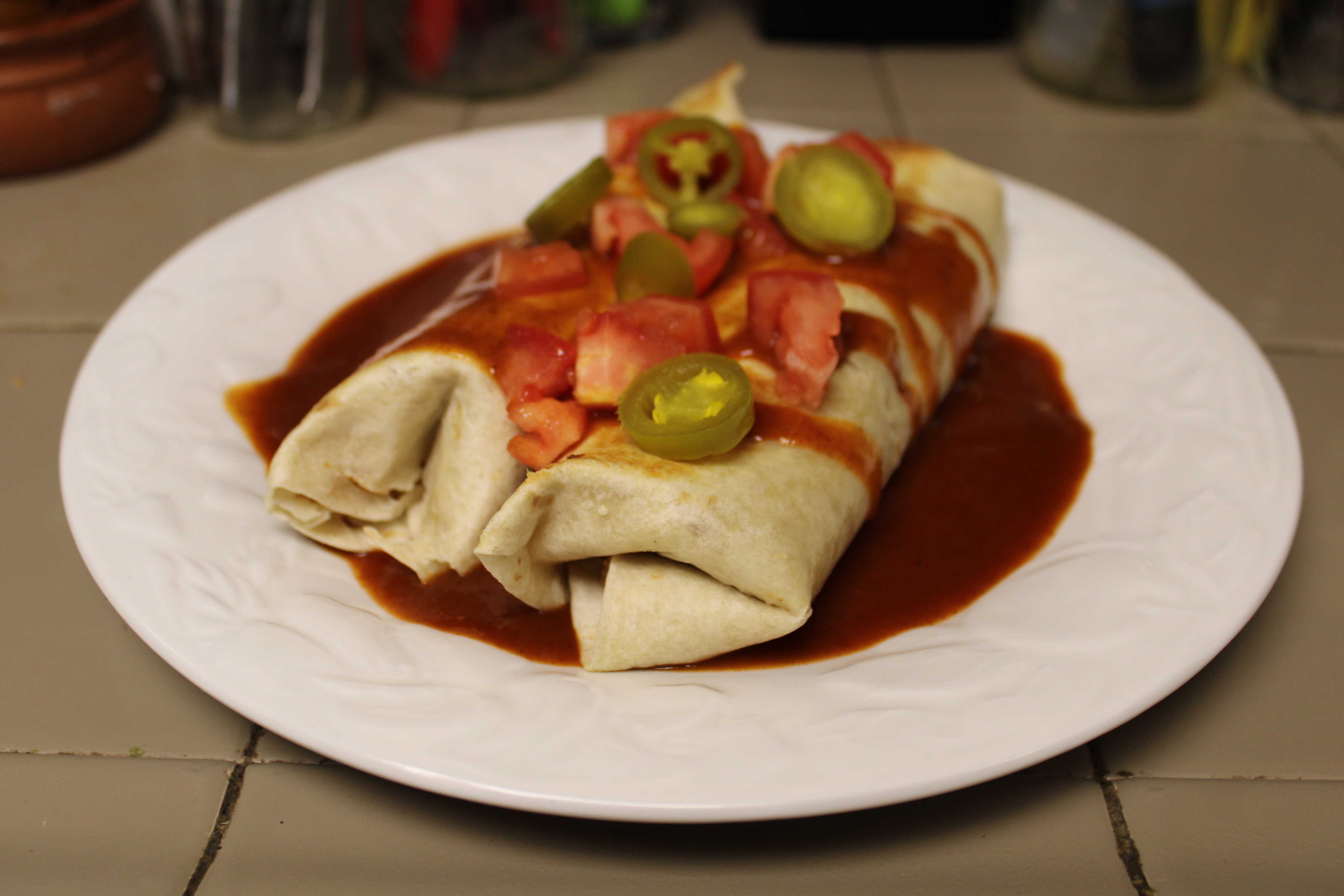 To serve, lade a little enchilada sauce down the center of individual plates. Top the sauce with a burrito or two. Garnish with diced tomatoes, Jalapeño Peppers and a dollop of sour cream.