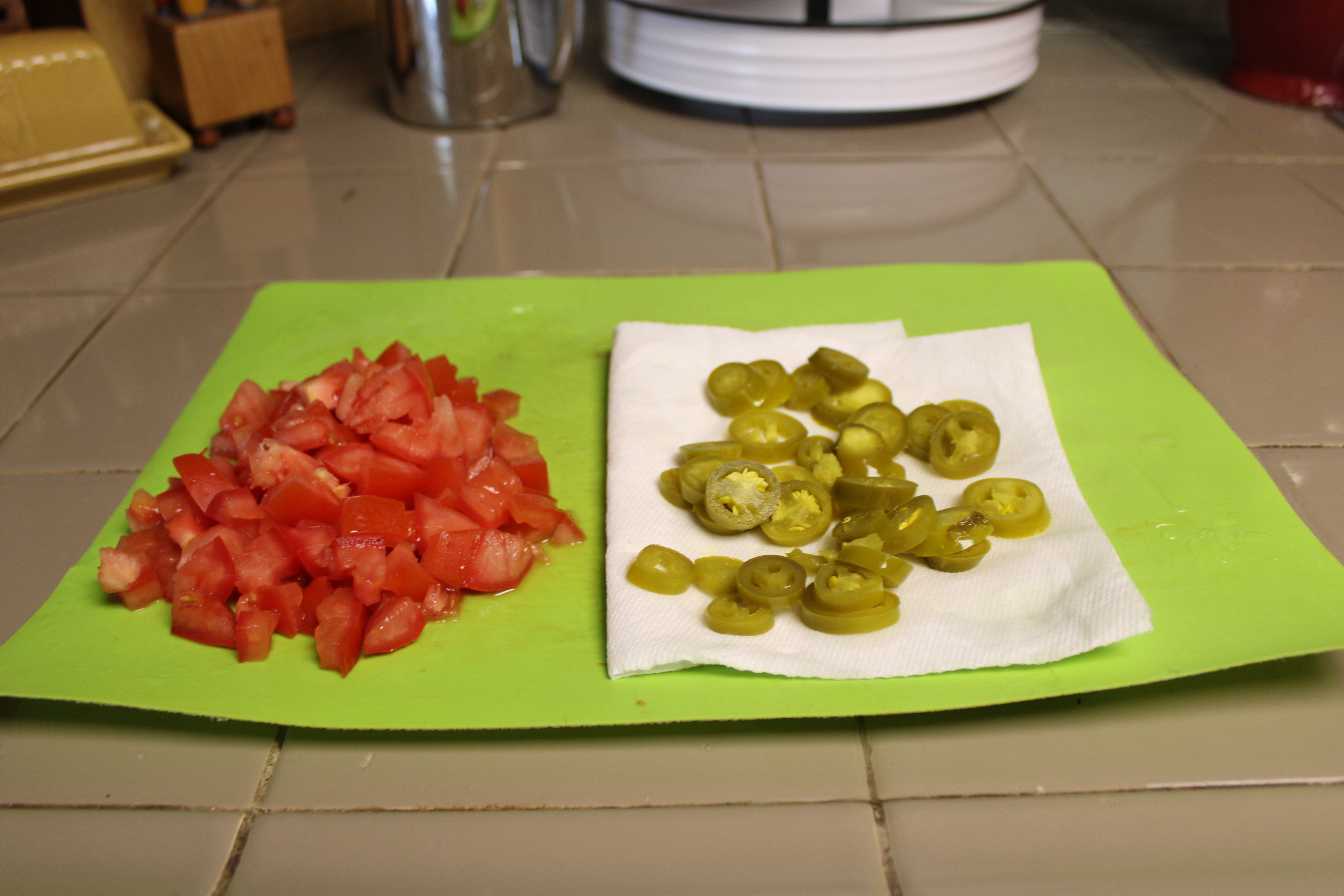 While the rice cooks, heat the oven to 400-degrees. Spray a casserole dish with cooking spray, set aside. Seed and dice tomatoes. Drain Jalapeño Peppers on paper towels, set aside.