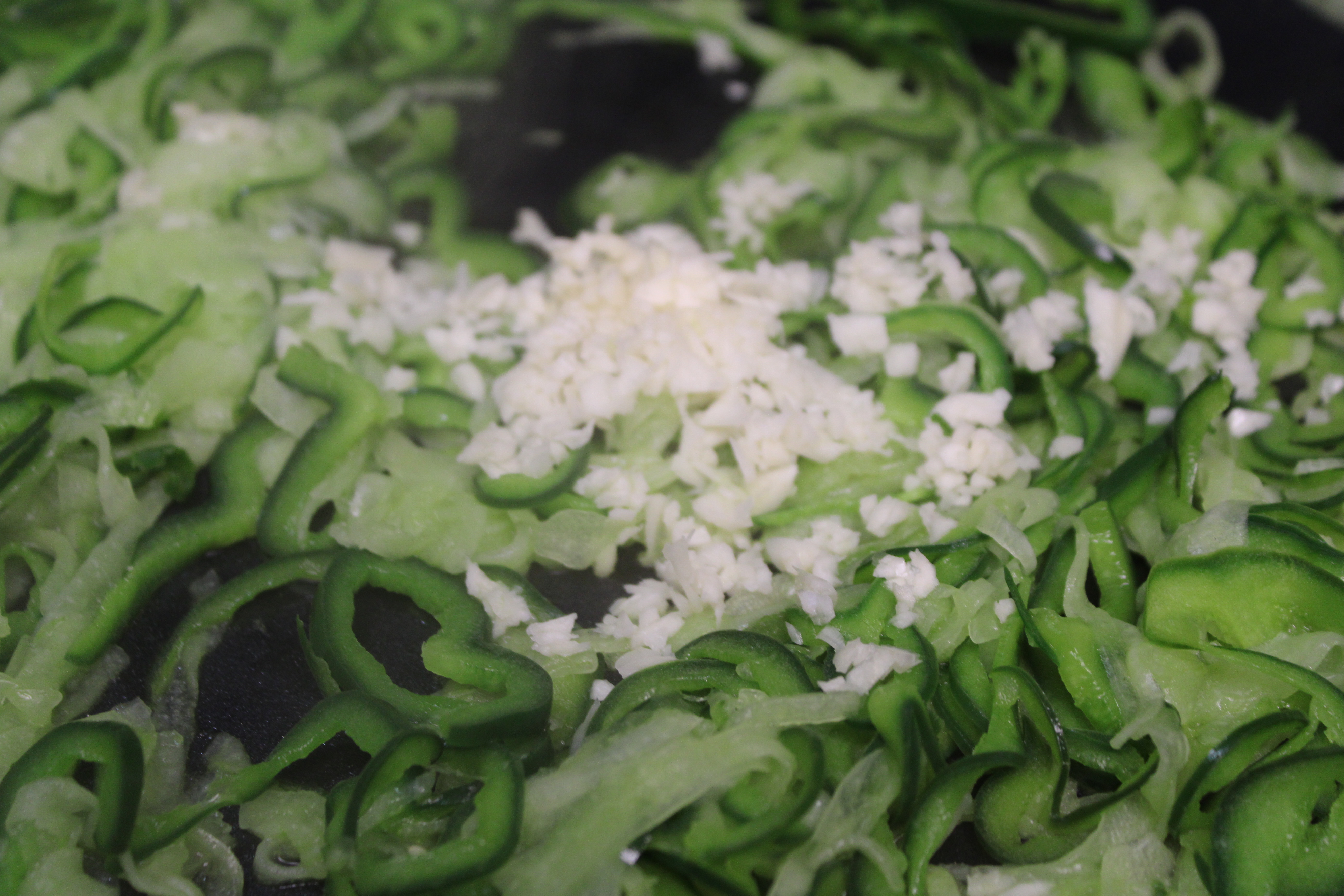 Stem and thinly slice Poblano Chilies. Stem Jalapeño, slice half into rounds. Reserve remaining half for the beans. Peel and thinly slice onion. Peel and finely dice garlic. Set aside.