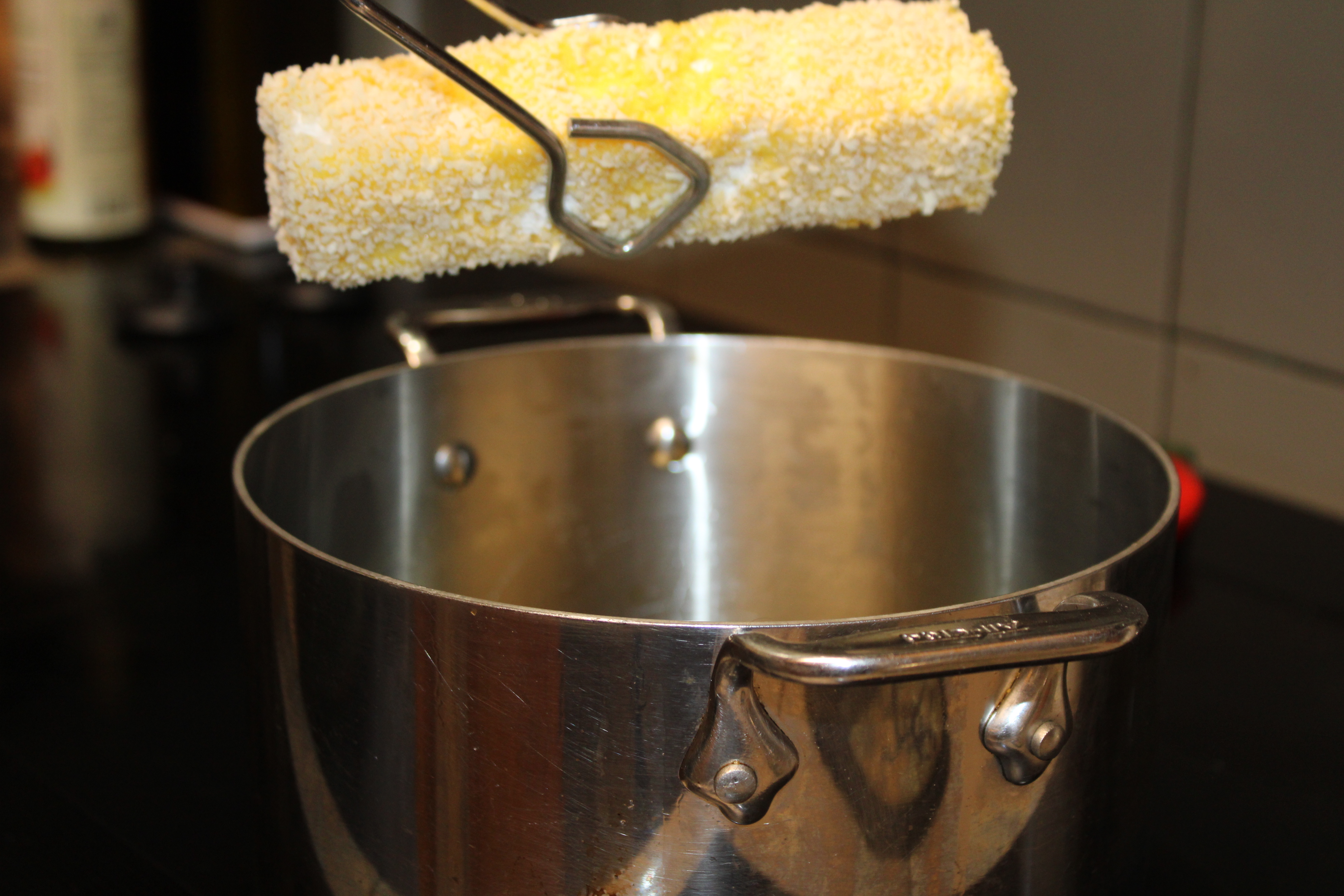Place flour in a pie tin. In a second pie tin whisk 2 eggs. In the third pie tin place half of the breadcrumbs. Dust the Mozzarella sticks, one at a time in the flour, then roll to coat in the egg, with a coating of breadcrumbs. Don’t forget to flour, egg and bread the ends of each stick. Shake off any excess that might not have stick to the cheese. Repeat a second time in flour, egg and breadcrumbs. Set coated sticks aside. About half way through breading process, add 2 more eggs to the egg tin and the remaining breadcrumbs to the breadcrumb tin.