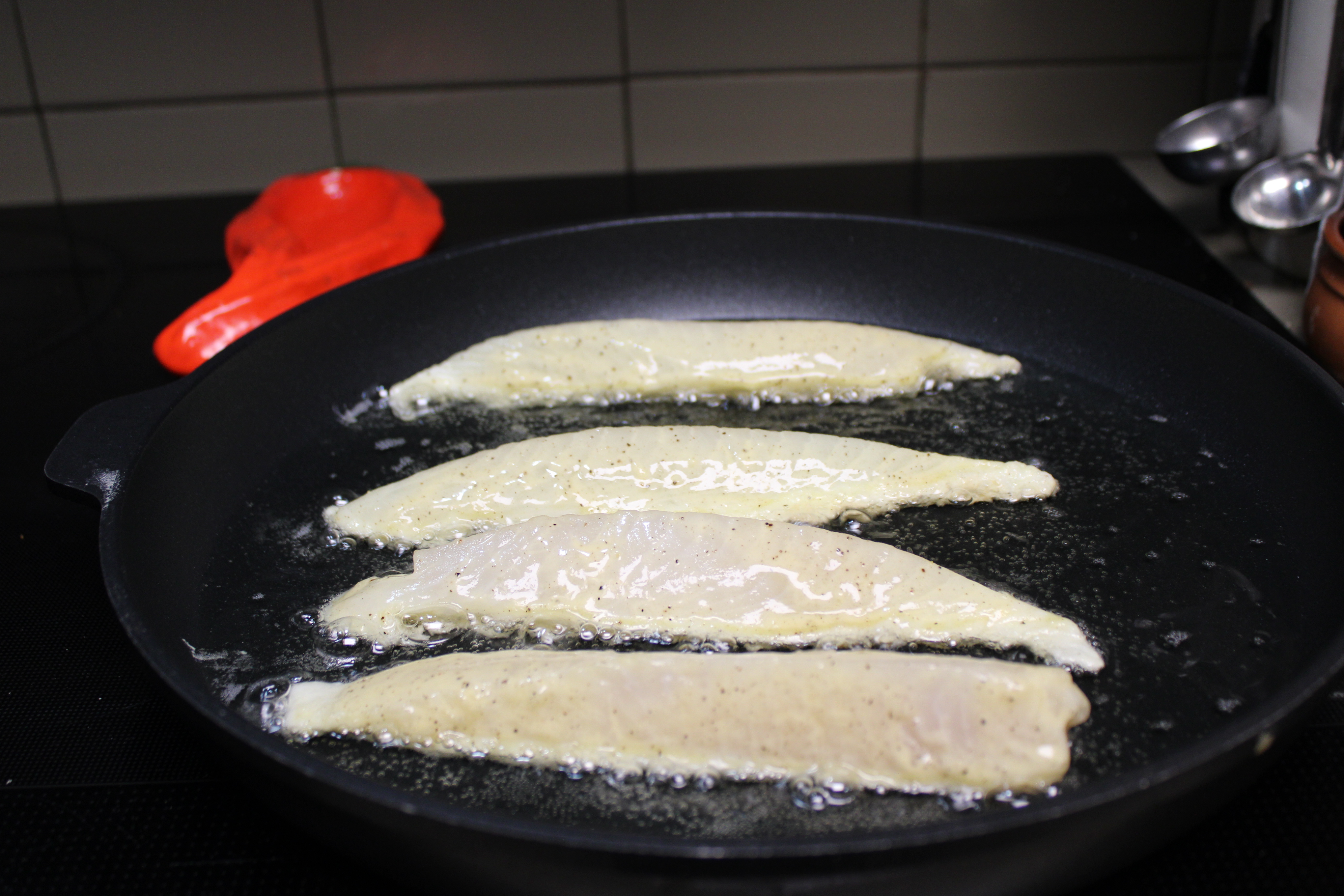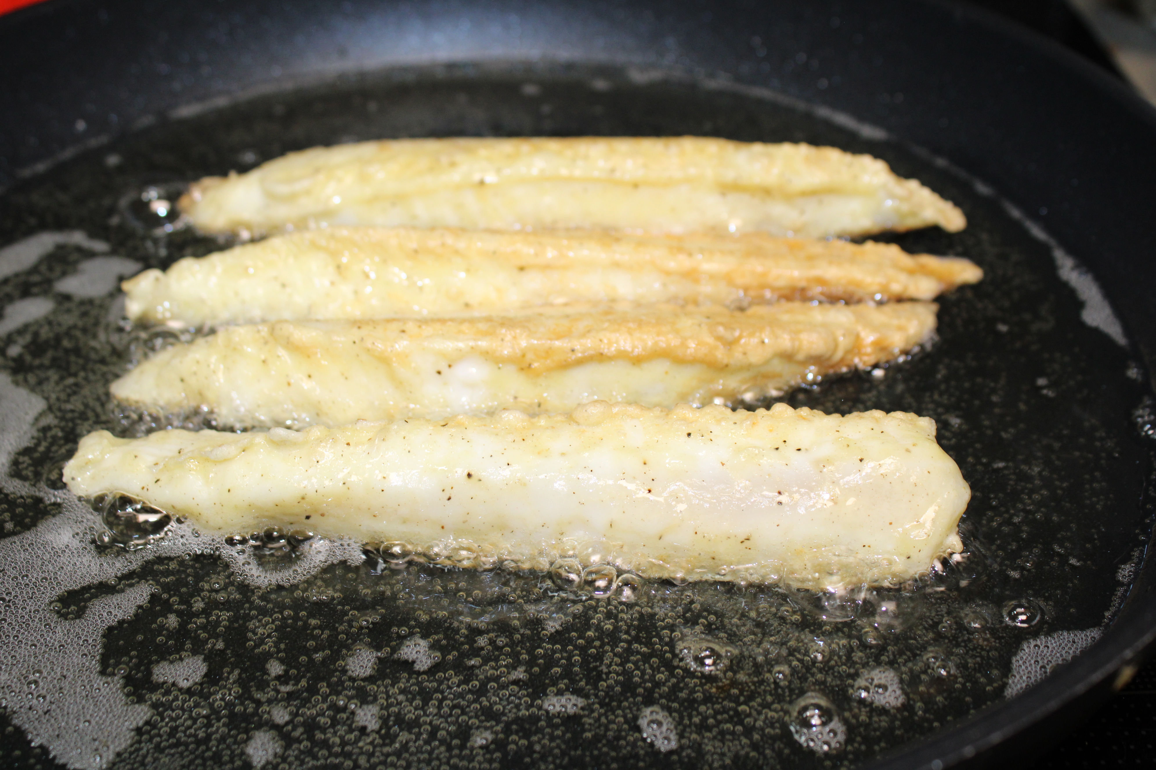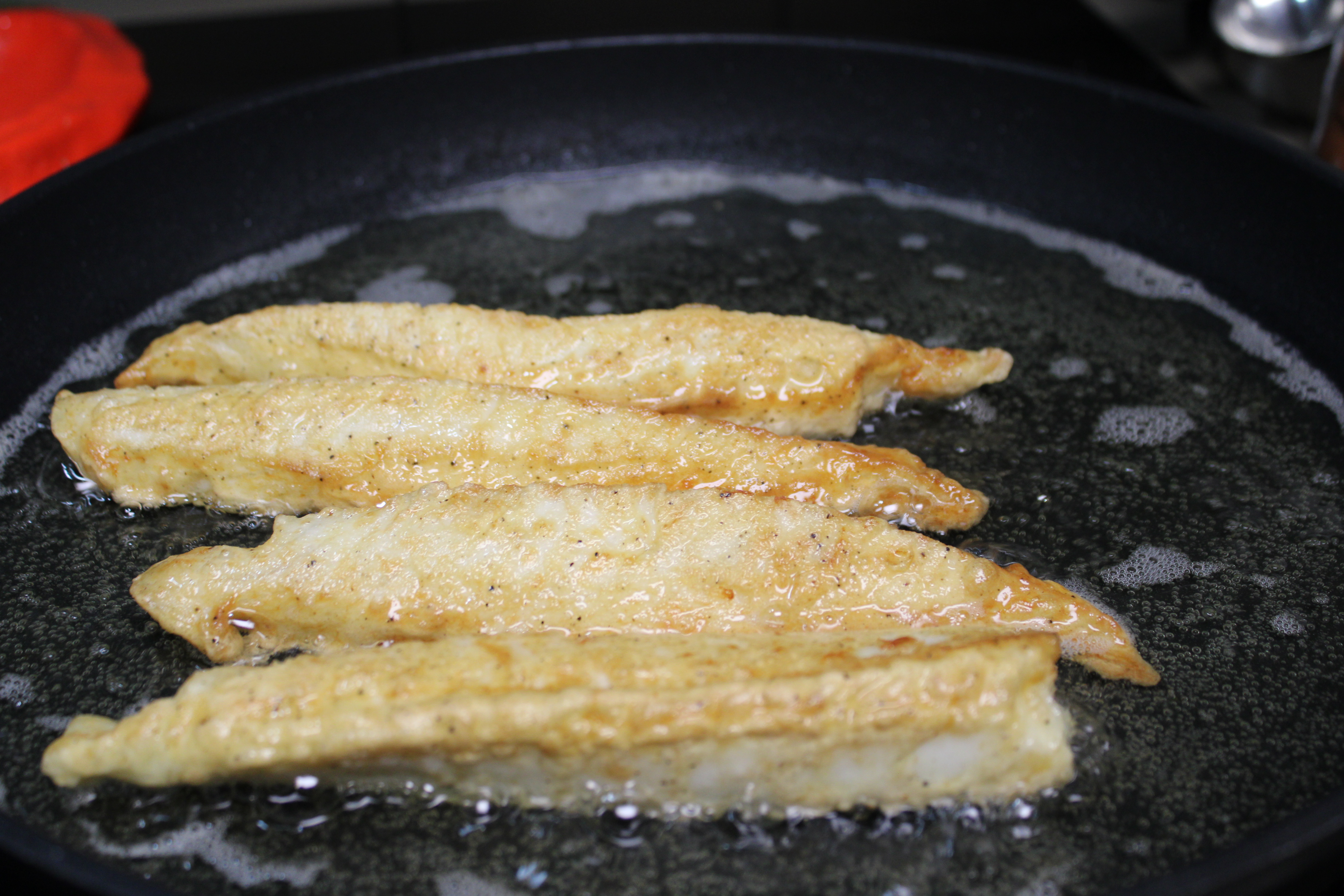 Heat oil in a large shallow frying pan over medium-high heat. Add the fish to the hot oil and fry until golden brown on both sides, about 4 minutes per side. Hold fish in a warm place until ready to serve. Let the oil cool in the skillet, then strain through a fine sieve to use for the sauce.