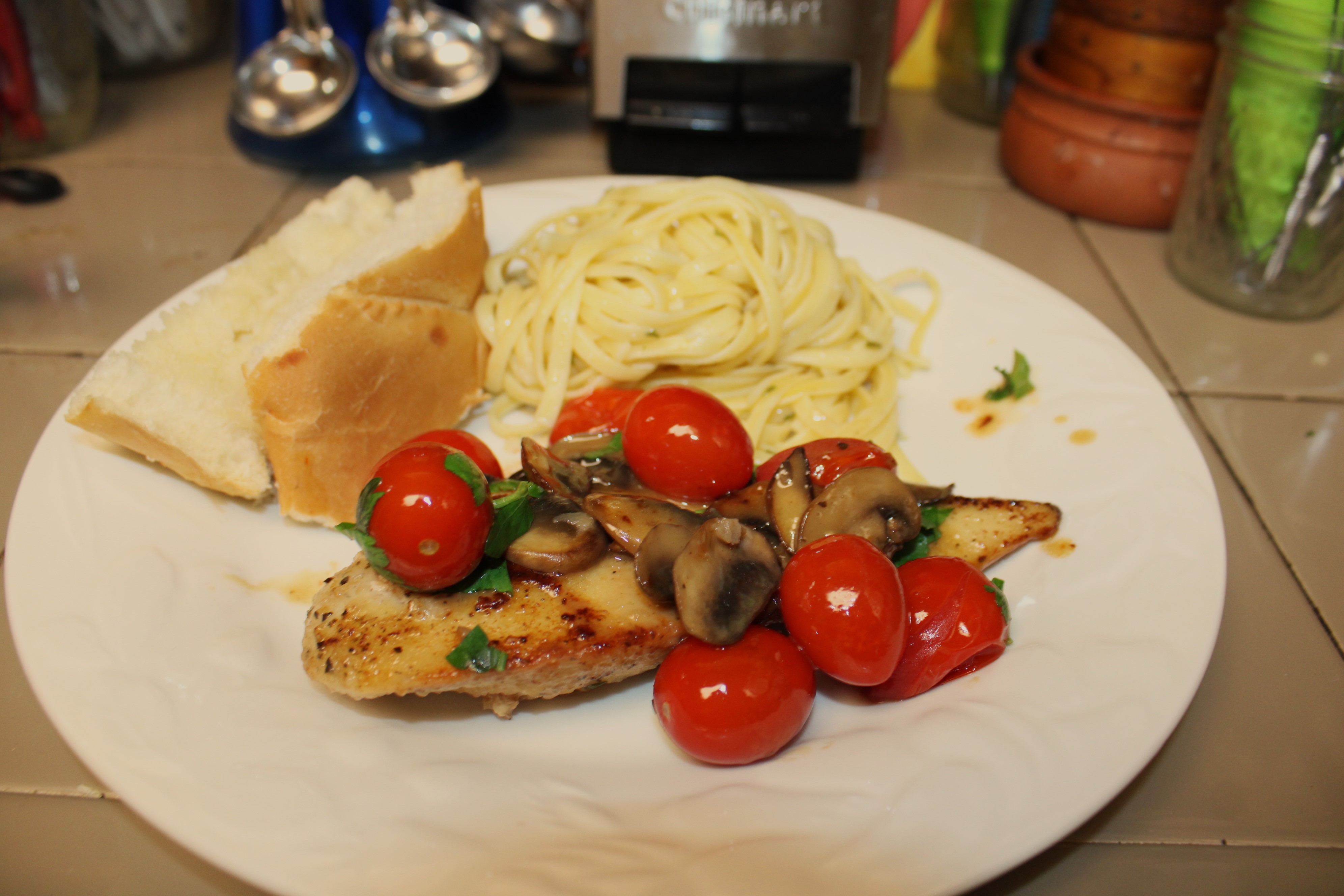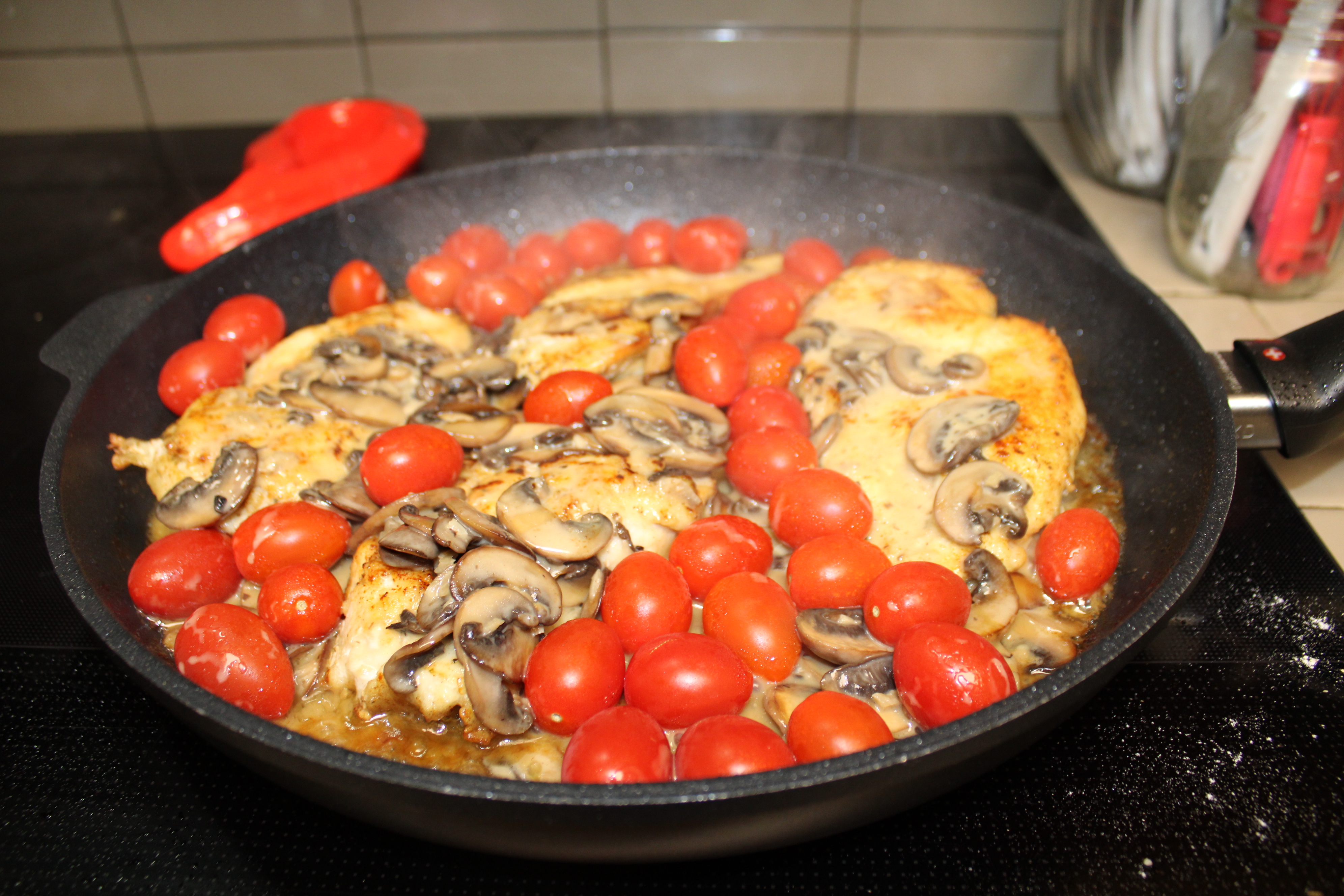 Ladle the Marsala sauce with mushrooms over the chicken. Top with tomatoes and let simmer until the tomatoes have softened and begin to burst. Snip parsley, garnish the chicken and serve straight from the skillet.