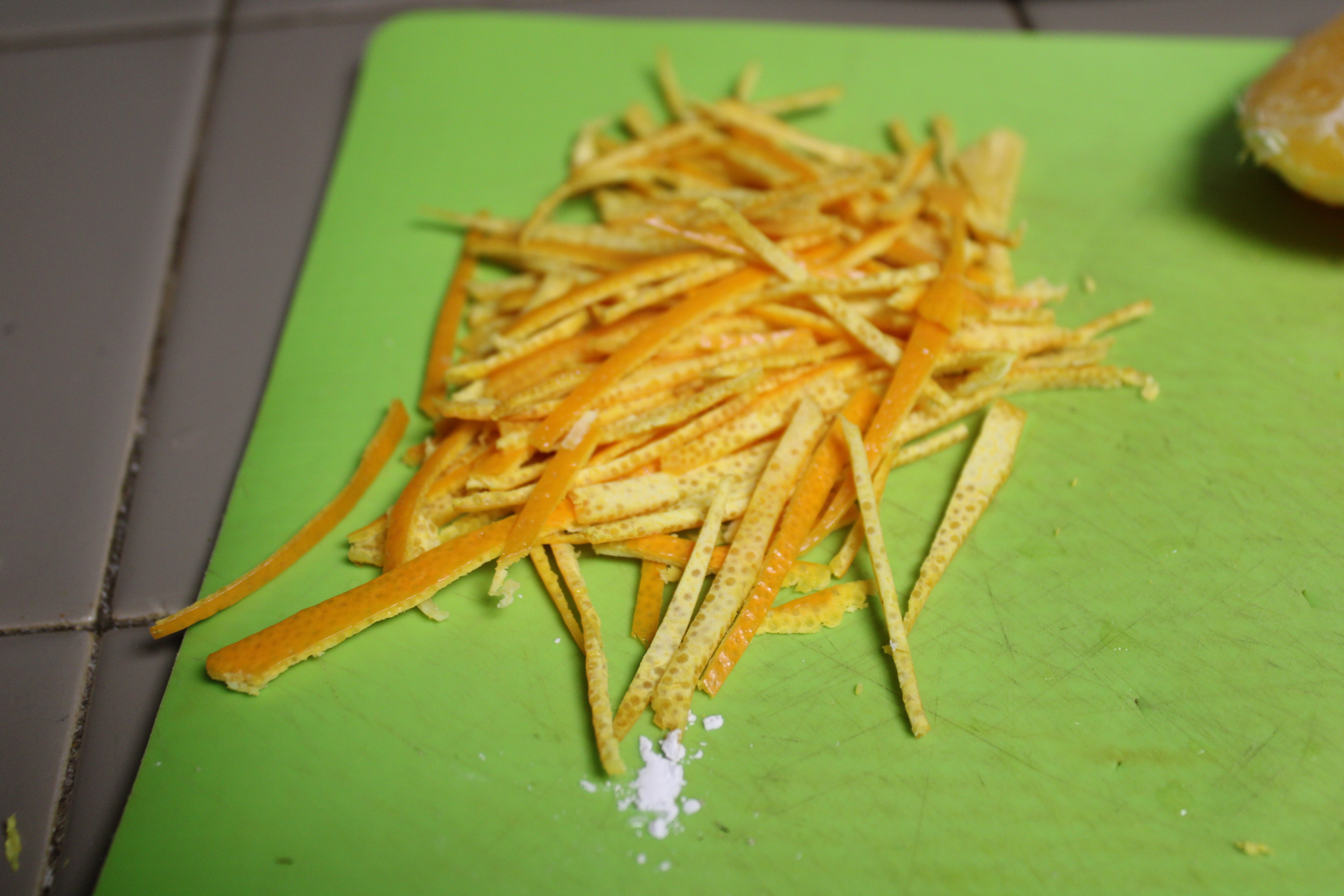 Peel the orange. Trim away as much of the white pith as possible from the peel and discard. Thinly slice remaining orange zest. Set aside.