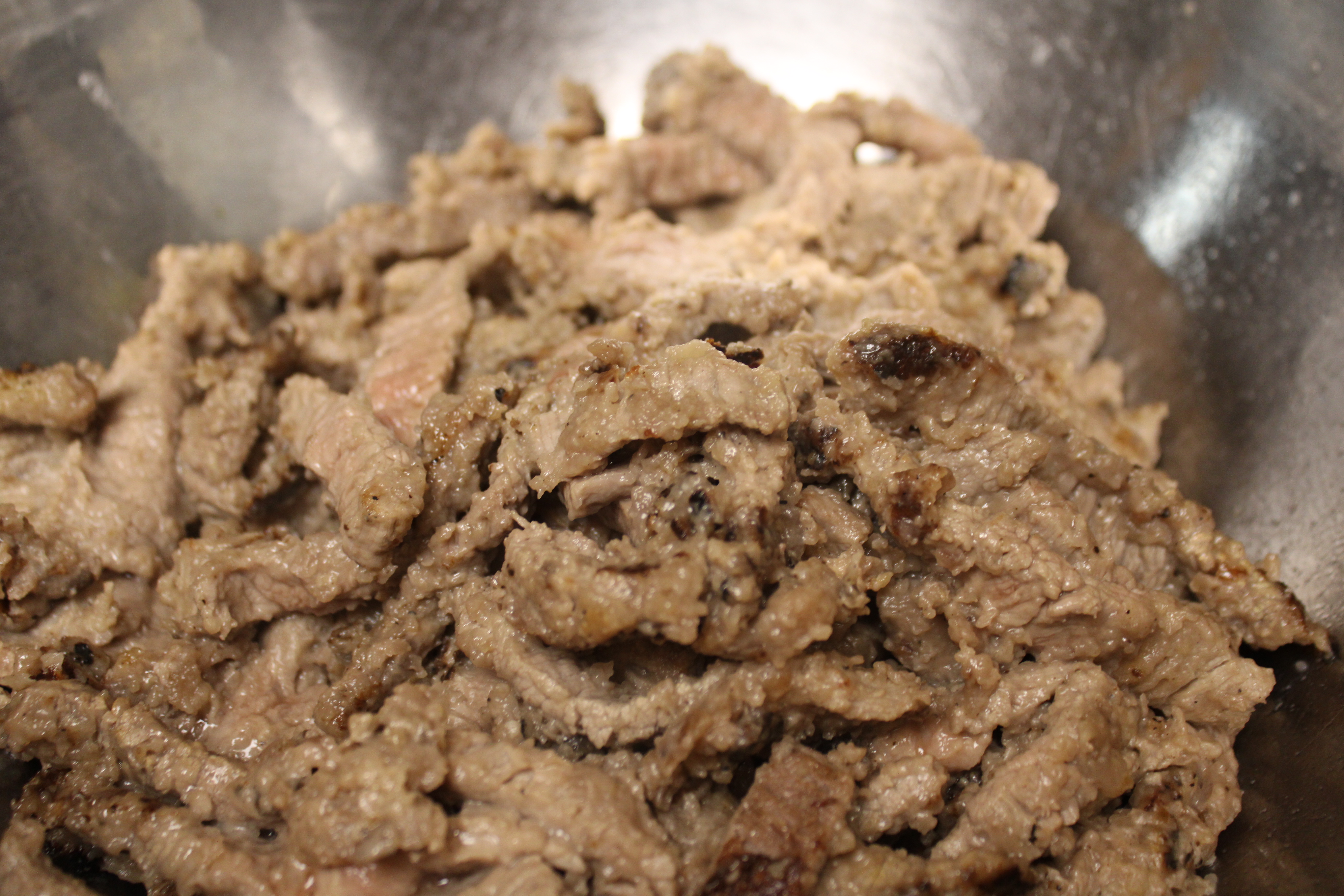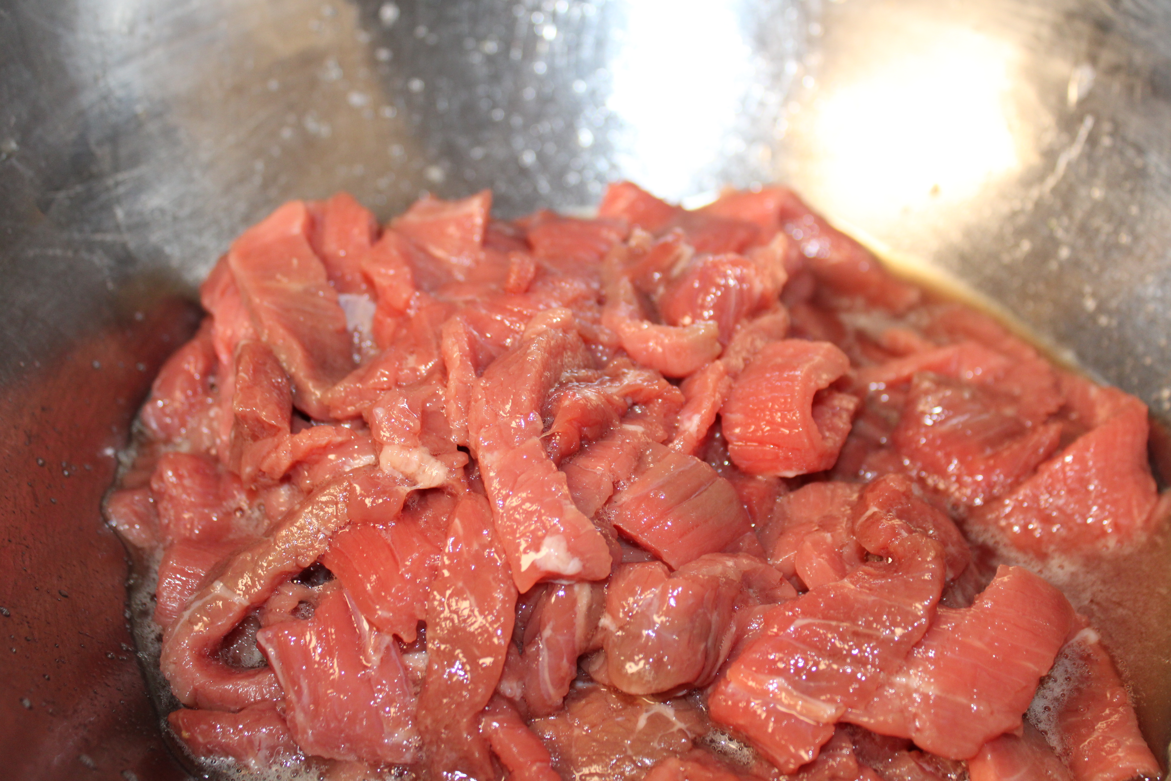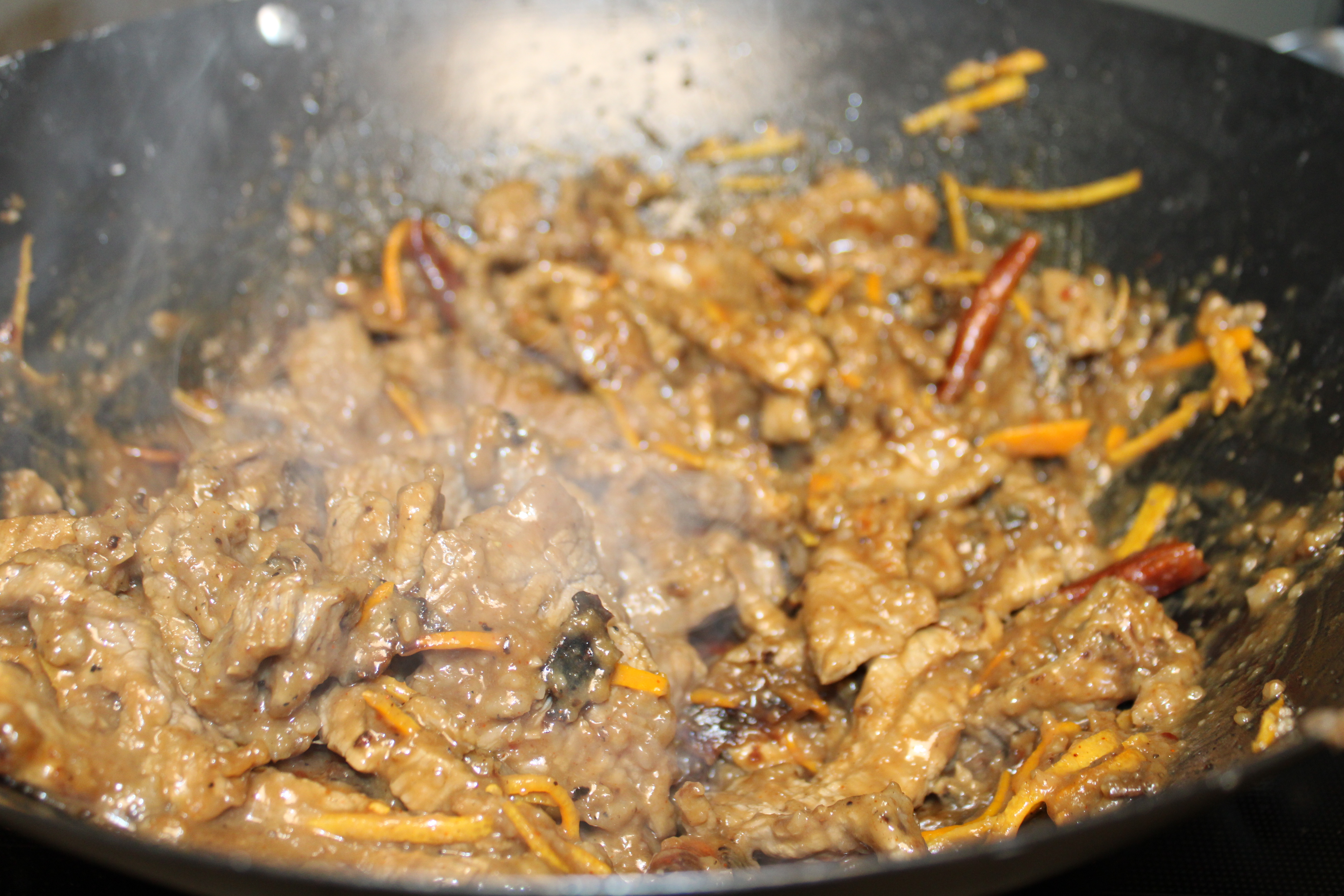 Heat oil in a skillet or wok until moderately hot. Fry pieces of beef until brown and crisp. Fry in batches if necessary. Remove beef strips from the wok, let drain.