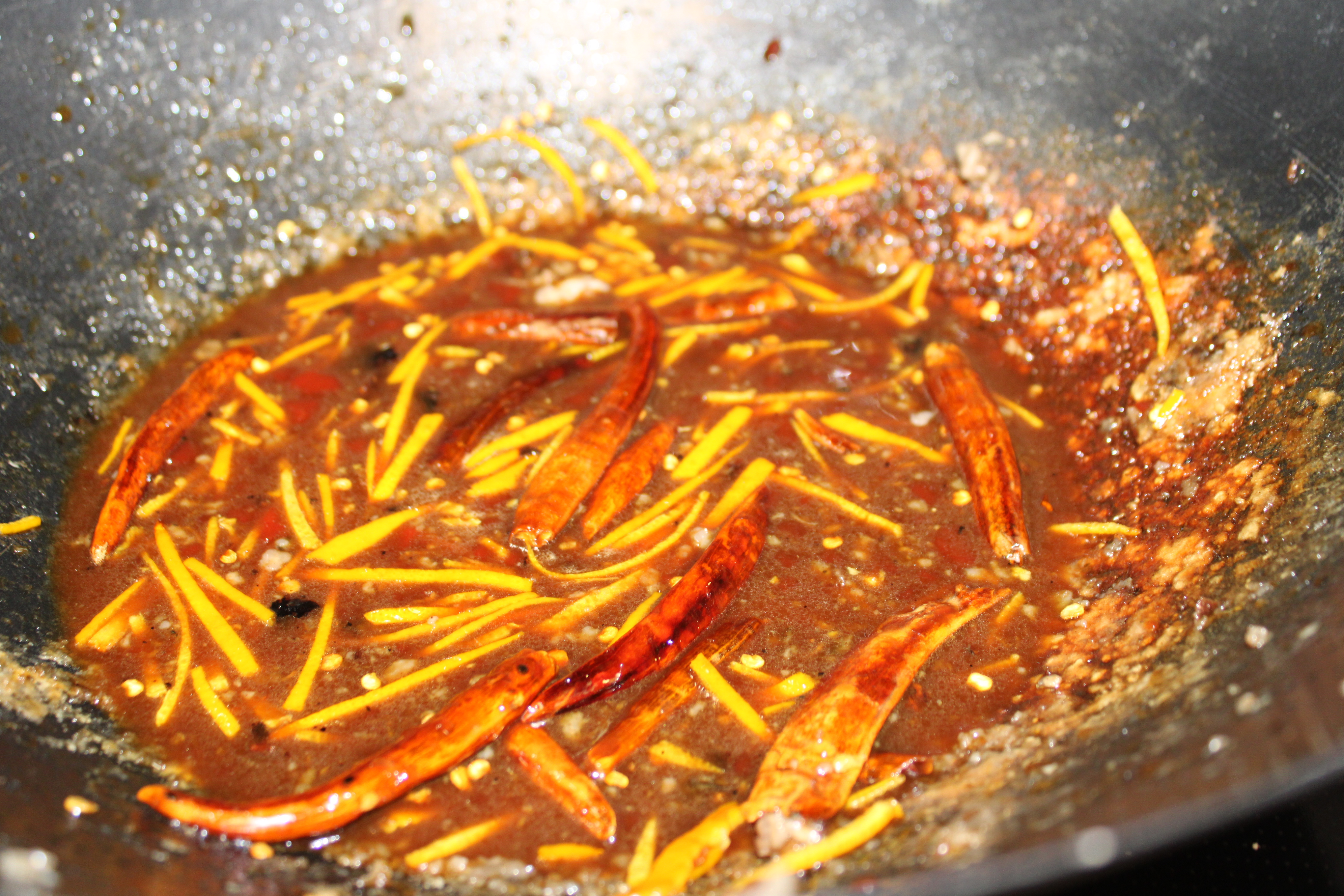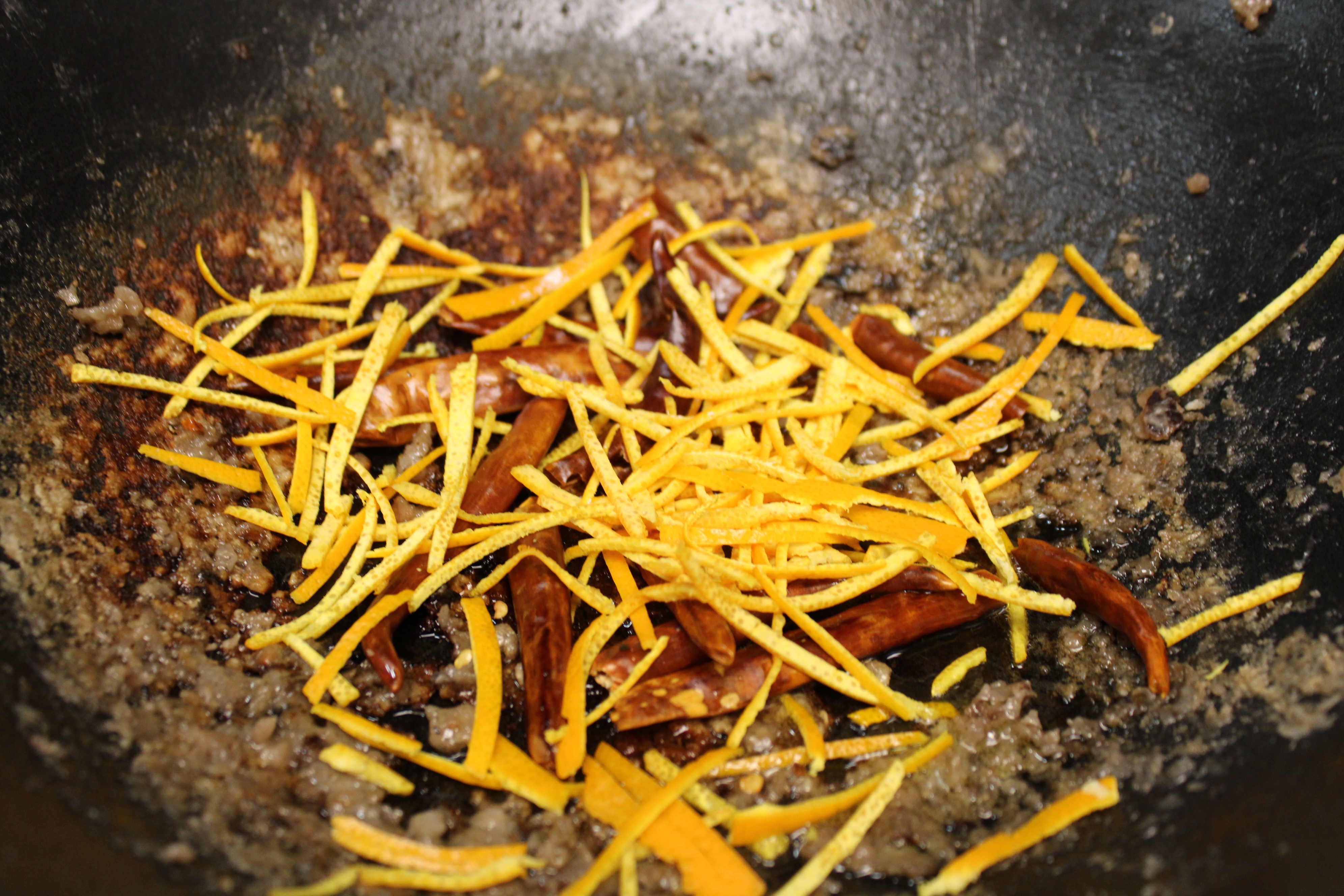 Heat oil again until moderately hot. Fry orange strips and chili pods until fragrant.