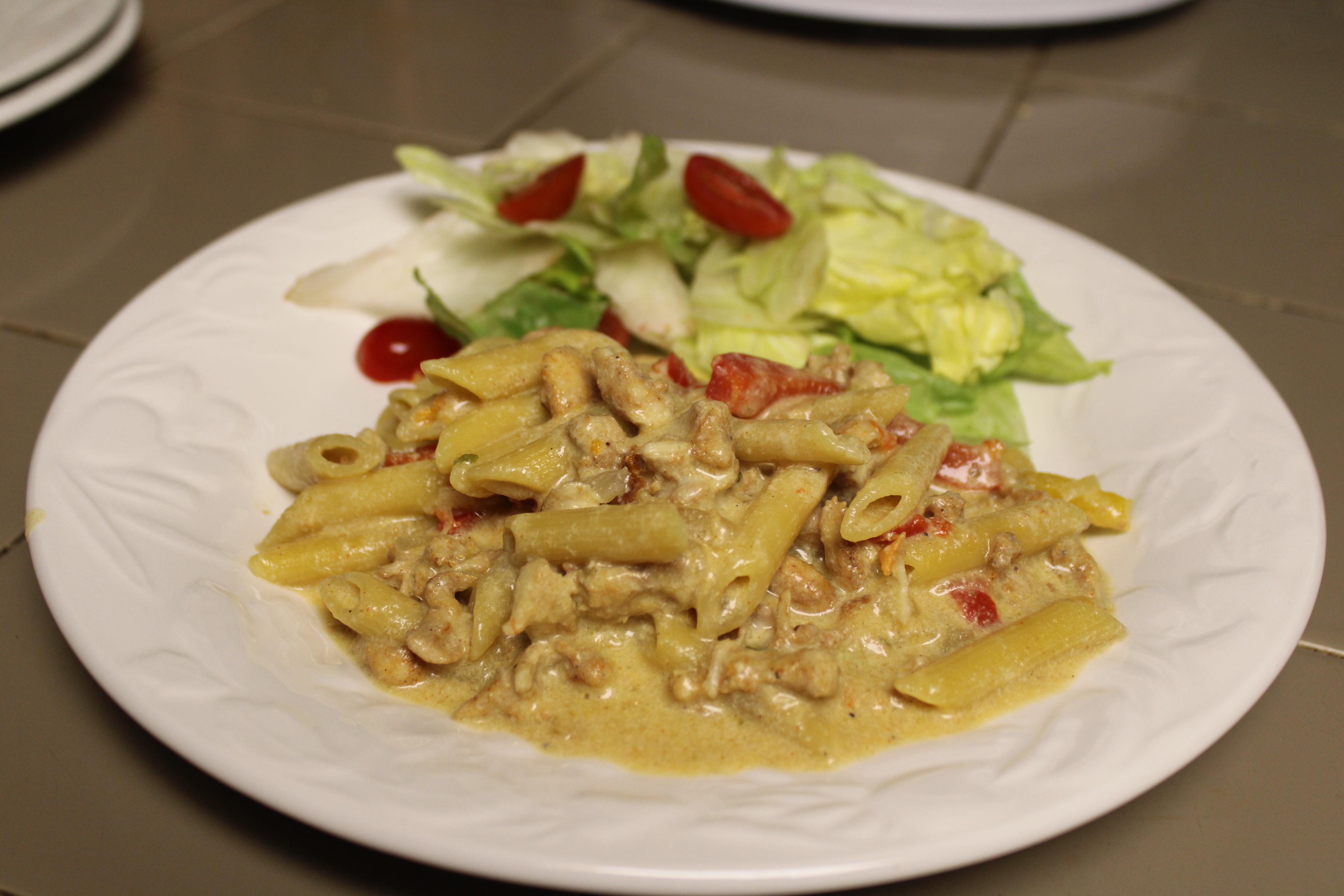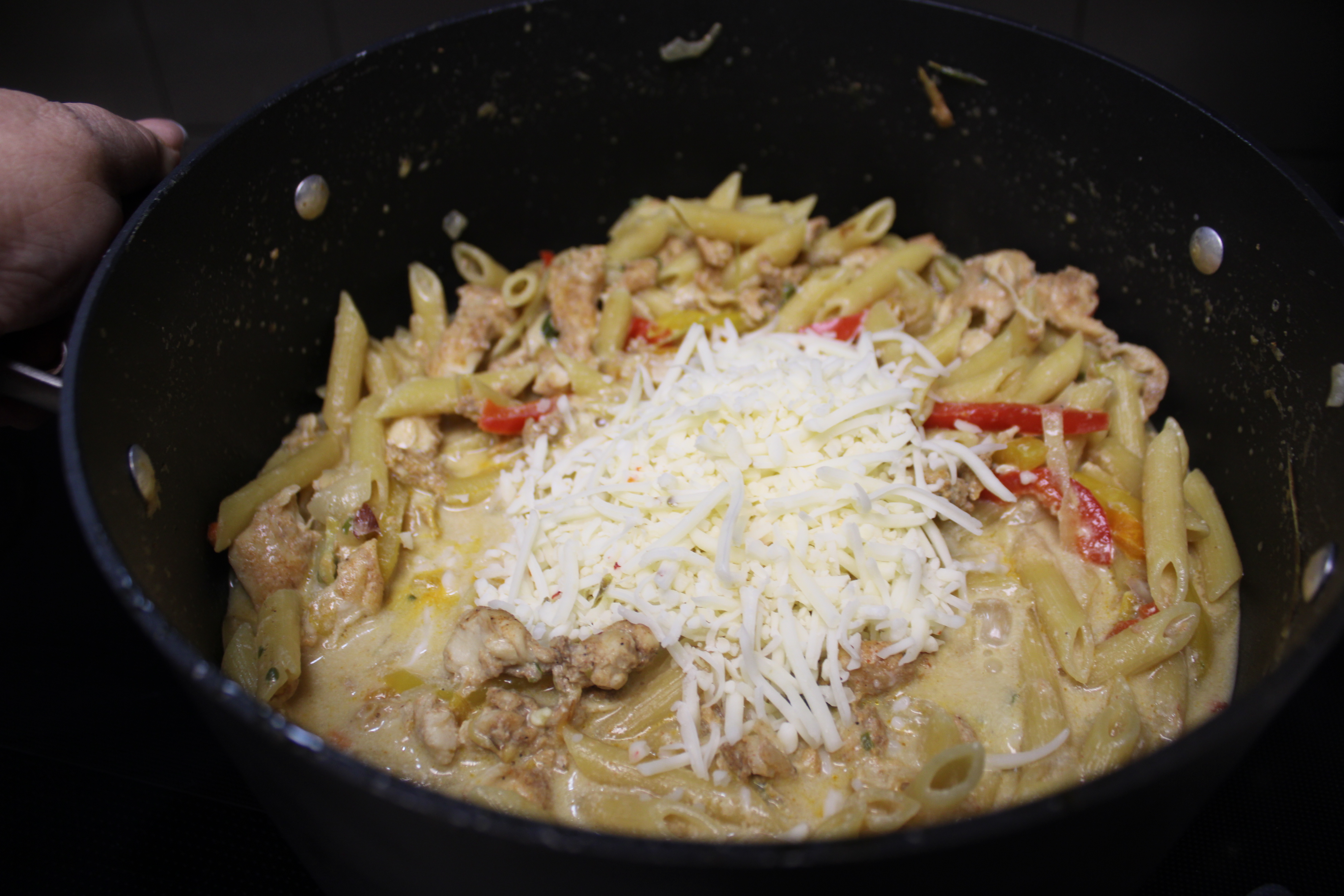 Stir in milk and penne pasta. Bring to a boil while stirring constantly to prevent pasta from sticking together. Reduce heat to medium, let cook for about 15 minutes, until pasta has begun to absorbe the milk and is no longer fully covered in liquid. Add chicken stock, press down on the pasta with the back of a spoon to resubmerge. Simmer another 5 minutes or so until the pasta has been rendered al dente and the sauce has thickened once more. Add cheese, remove from heat, cover and let the cheese melt. Stir to blend just before serving.