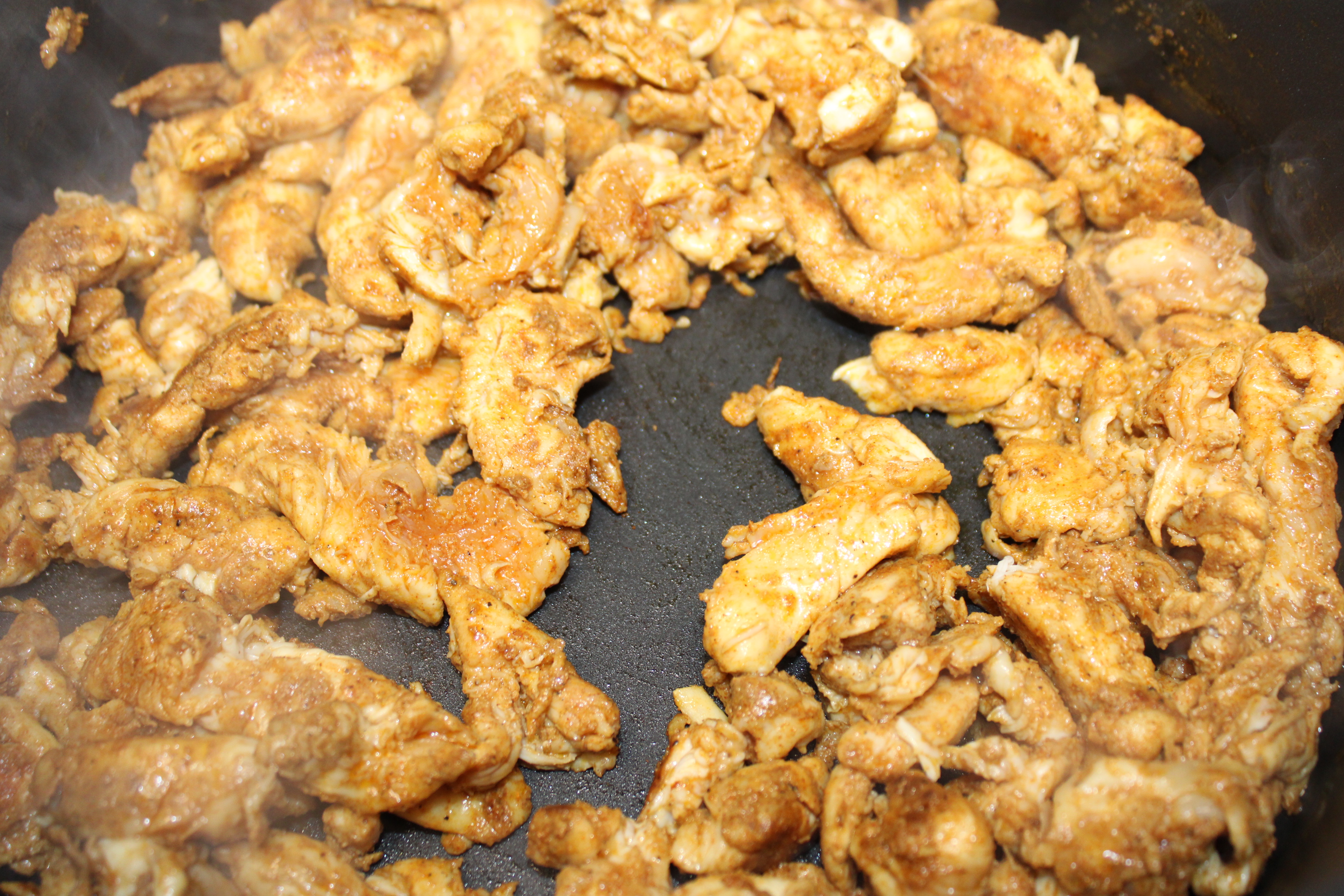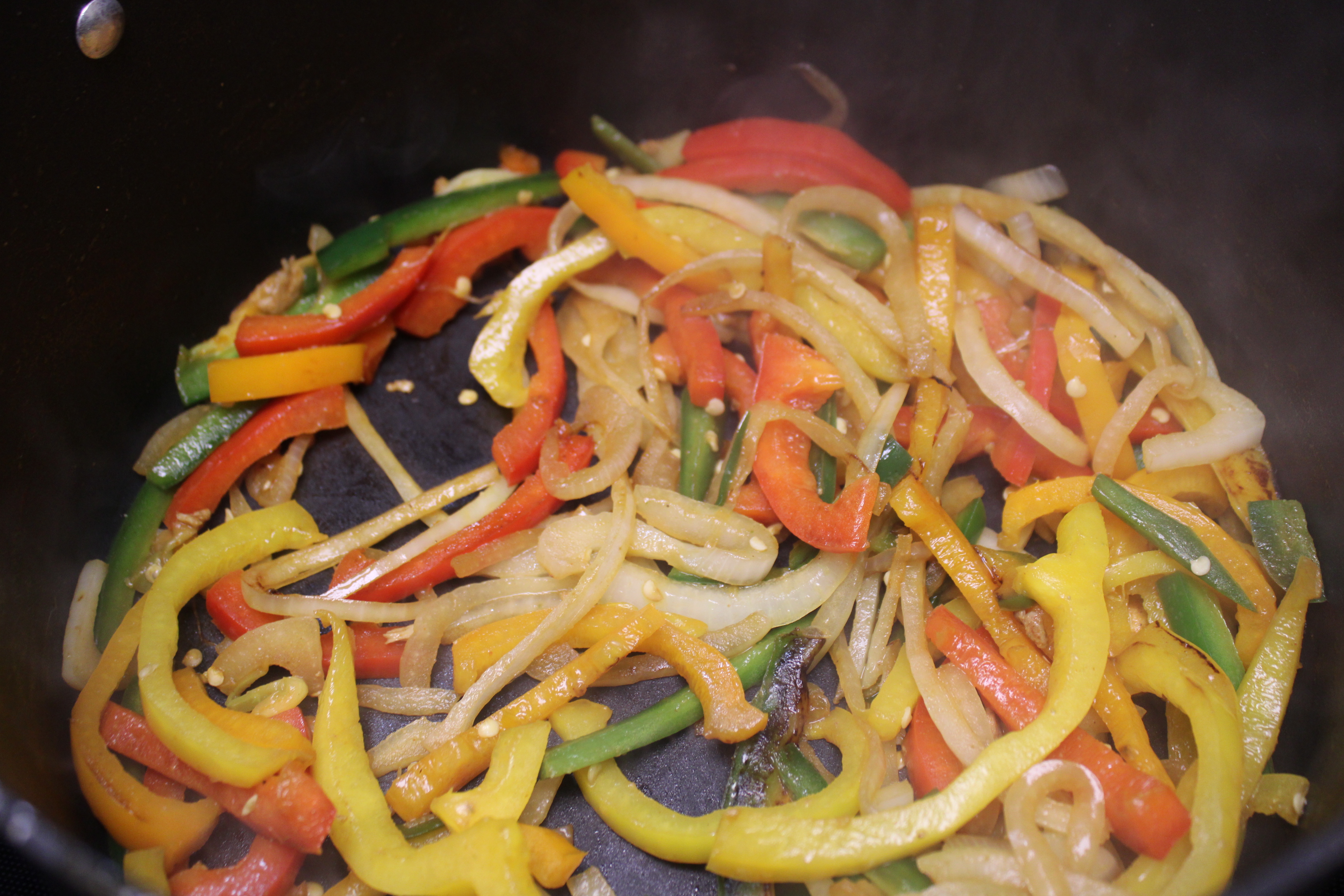 Thinly slice chicken tenderloins into strips, set aside. Stem, core and slice bell peppers into strips. Stem and thinly slice the jalapeño into strips. Cut onion in half. Reserve half for another purpose. Peel remaining half, cut into slivers. Set aside. In a small bowl whisk together salt, pepper, chili powder, cumin and garlic powder. Sprinkle spices over the chicken, toss to coat well.