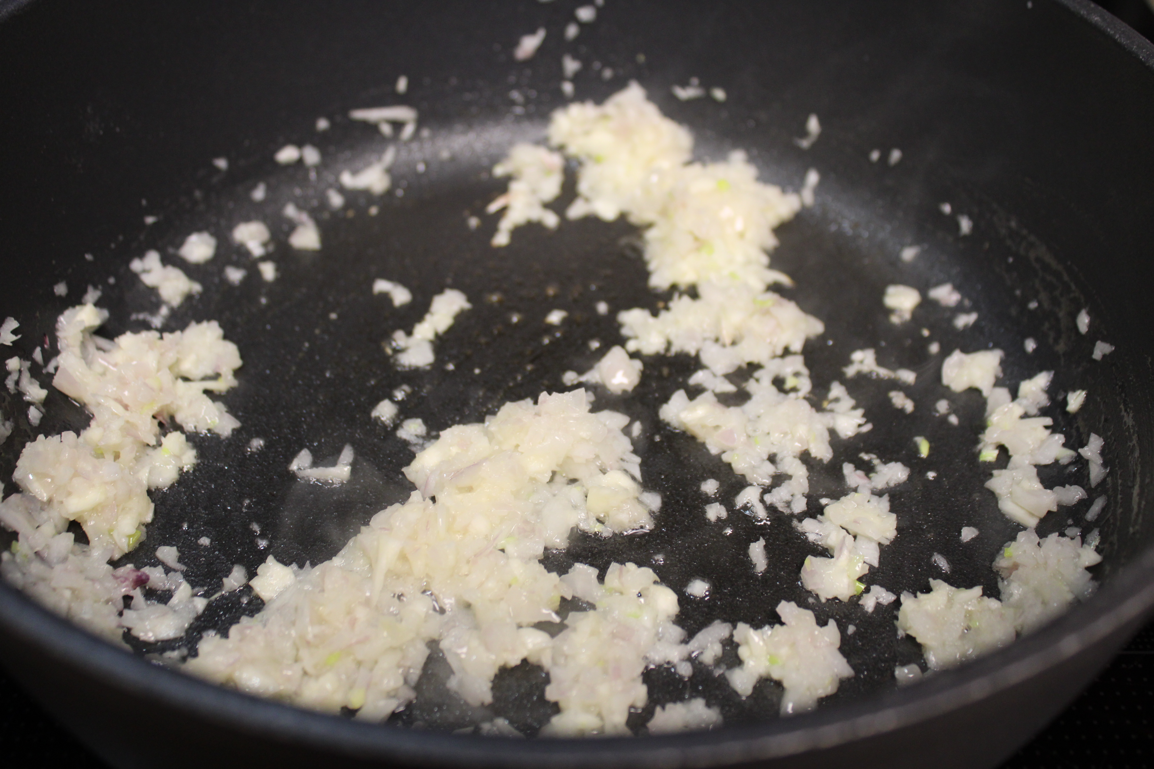 While the water comes to a boil and the ravioli cooks make the Piccata Sauce. Peel and finely mince garlic. Peel and finely mince the shallot. Drain capers, rinse and set aside.