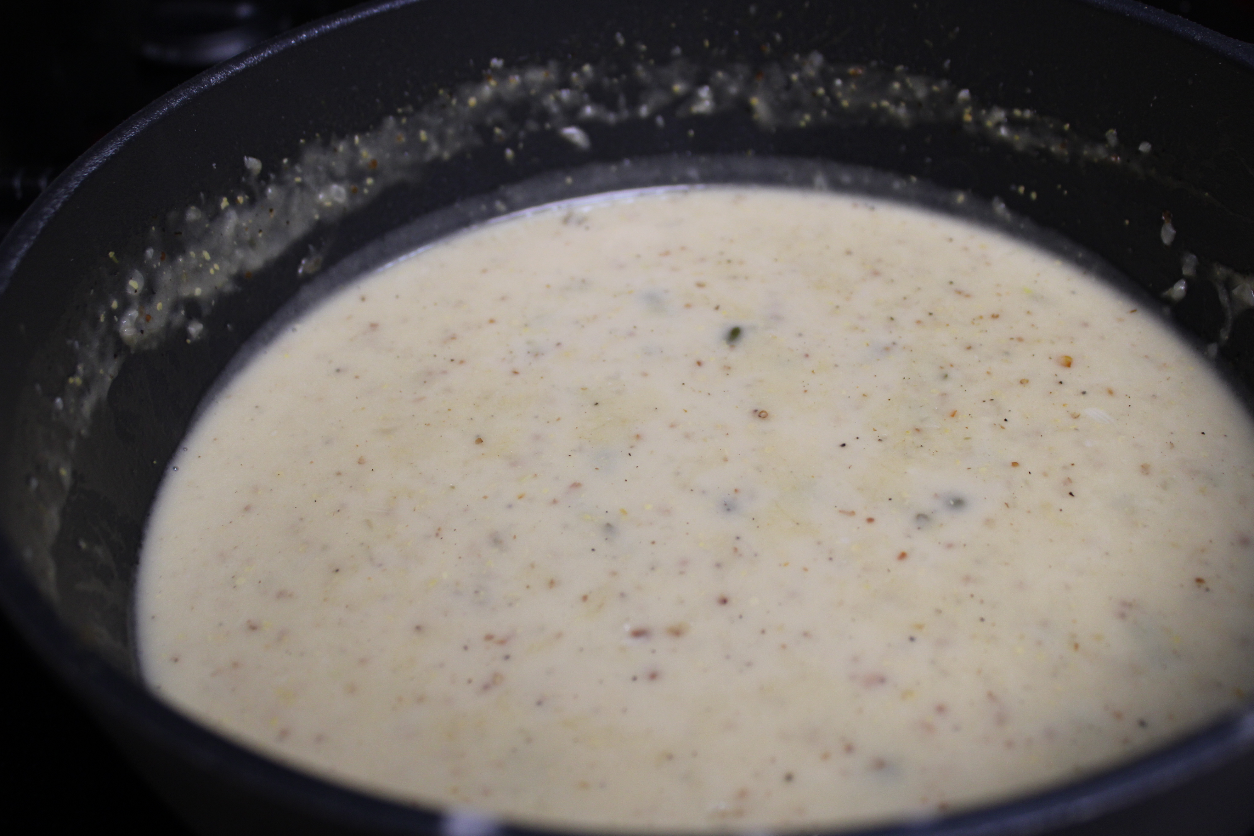 Pull pan from heat, whisk in remaining butter one tablespoon at a time, letting butter melt into the sauce completely before adding the next tablespoon. Add heavy cream. Whisk until smooth.