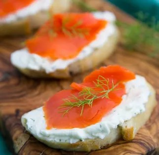 Spread cream cheese mixture over the top of each bread slice. Top with a piece of smoked salmon, then garnish with some fresh dill as desired. Arrange on a serving tray.
